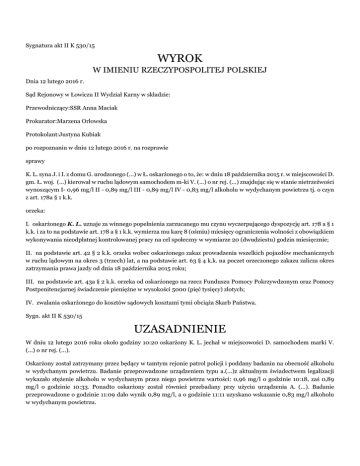 Sygnatura akt II K 530/15 WYROK W IMIENIU RZECZYPOSPOLITEJ POLSKIEJ Dnia 12 lutego 2016 r. Sąd Rejonowy w Łowiczu II Wydział Karny w składzie: Przewodniczący:SSR Anna Maciak Prokurator:Marzena Orłowska Protokolant:Justyna Kubiak po rozpoznaniu w dniu 12 lutego 2016 r. na rozprawie sprawy K. L. syna J. i I. z domu G. urodzonego (...) w Ł. oskarżonego o to, że: w dniu 18 października 2015 r. w miejscowości D. gm. Ł. woj. (...) kierował w ruchu lądowym samochodem m-ki V. (...) o nr rej. (...) znajdując się w stanie nietrzeźwości wynoszącym I- 0,96 mg/l II - 0,89 mg/l III - 0,89 mg/l IV - 0,83 mg/l alkoholu w wydychanym powietrzu tj. o czyn z art. 178a § 1 k.k. orzeka: I. oskarżonego K. L. uznaje za winnego popełnienia zarzucanego mu czynu wyczerpującego dyspozycję art. 178 a § 1 k.k. i za to na podstawie art. 178 a § 1 k.k. wymierza mu karę 8 (ośmiu) miesięcy ograniczenia wolności z obowiązkiem wykonywania nieodpłatnej kontrolowanej pracy na cel społeczny w wymiarze 20 (dwudziestu) godzin miesięcznie; II. na podstawie art. 42 § 2 k.k. orzeka wobec oskarżonego zakaz prowadzenia wszelkich pojazdów mechanicznych w ruchu lądowym na okres 3 (trzech) lat, a na podstawie art. 63 § 4 k.k. na poczet orzeczonego zakazu zalicza okres zatrzymania prawa jazdy od dnia 18 października 2015 roku; III. na podstawie art. 43a § 2 k.k. orzeka od oskarżonego na rzecz Funduszu Pomocy Pokrzywdzonym oraz Pomocy Postpenitencjarnej świadczenie pieniężne w wysokości 5000 (pięć tysięcy) złotych; IV. zwalania oskarżonego do kosztów sądowych kosztami tymi obciąża Skarb Państwa. Sygn. akt II K 530/15 UZASADNIENIE W dniu 12 lutego 2016 roku około godziny 10:20 oskarżony K. L. jechał w miejscowości D. samochodem marki V. (...) o nr rej. (...). Oskarżony został zatrzymany przez będący w tamtym rejonie patrol policji i poddany badaniu na obecność alkoholu w wydychanym powietrzu. Badanie przeprowadzone urządzeniem typu a.(...)z aktualnym świadectwem legalizacji wykazało stężenie alkoholu w wydychanym przez niego powietrzu wartości: 0,96 mg/l o godzinie 10:18, zaś 0,89 mg/l o godzinie 10:33. Ponadto oskarżony został również przebadany przy użyciu urządzenia A. (...). Badanie przeprowadzone o godzinie 11:09 dało wynik 0,89 mg/l, a o godzinie 11:11 uzyskano wskazanie 0,83 mg/l alkoholu w wydychanym powietrzu. (zeznania świadków: M. S.- k. 22v, k. 55, P. B. k. 50v, k. 54-55, protokół użycia alkometru k.2-2v, świadectwa legalizacji k.3-3v, k.5-5v, protokół użycia alkosensoru k. 4-4v,) Oskarżony K. L. ma 50 lat. Pozostaje w związku małżeńskim, z którego posiada troje małoletnich dzieci, pozostających na jego utrzymaniu. Jedno z dzieci z uwagi na niepełnosprawność wymaga stałej opieki. Posiada wykształcenie podstawowe, będąc z zawodu rolnikiem. Prowadzi gospodarstwo rolne o pow. 14 ha, osiągając z tego tytułu średni dochód miesięczny w kwocie 800 złotych. Posiada majątek w postaci współwłasności gospodarstwa rolnego oraz domu mieszkalnego o pow. 120 m2. Nie był uprzednio karany. Nie leczył się psychiatrycznie neurologicznie ani odwykowo. (wyjaśnienia oskarżonego k. 12-12v, k. 53-53v) Oskarżony K. L. będąc przesłuchiwanym w charakterze podejrzanego, przyznał się do dokonania zarzucanego mu czynu. Będąc przesłuchiwany przed Sądem, całkowicie zmienił swoje stanowisko, kwestionując sprawstwo zarzucanego mu czynu. Oskarżony podał, iż w niedługo przed tym jak został zatrzymany przez funkcjonariuszy Policji, w istocie jechał samochodem marki V. (...) o nr rej. (...) po drodze w miejscowości D.. K. L. zaznaczył jednak, iż zatrzymał samochód w pobliżu drogi i udał się do pobliskiego lasku, gdzie spożył zakupiony uprzednio alkohol w postaci 5 puszek piwa. Z wyjaśnień oskarżonego wynika, iż po upływie około 1,5 godz. powrócił do samochodu i wówczas został wylegitymowany przez patrol Policji i poddany badaniu na zawartość alkoholu w wydychanym powietrzu. Oskarżony w ten sposób usiłował wykazać, iż nie jechał samochodem będąc w stanie nietrzeźwości, bowiem spożył alkohol dopiero po tym jak zatrzymał samochód. W toku składanych wyjaśnień oskarżony szeroko opisał swoją trudną sytuację życiową, którą dodatkowo skomplikował fakt, iż został zatrzymany mu dokument prawa jazdy. K. L. wskazał bowiem, iż jego dziecko jest niepełnosprawne, co wiąże się z koniecznością dowożenia go samochodem na specjalistyczne terapie. (wyjaśnienia oskarżonego k. 13, k. 53v-54) W ocenie Sądu wyjaśnienia oskarżonego złożone na rozprawie nie zasługują na wiarę i stanowią realizację linii obrony jaką w toku postępowania w niniejszej sprawie K. L. przyjął. Za tego rodzaju wnioskiem przemawia zgromadzony w sprawie materiał dowodowy, a w szczególności w postaci zeznań świadków P. B. i M. S., funkcjonariuszy Policji, przeprowadzających w owym dniu kontrolę drogową z udziałem oskarżonego. Za niewiarygodne należy uznać wyjaśnienia oskarżonego tłumaczące przyczyny zmiany stanowiska procesowego. K. L. potwierdził, iż podał policjantom, że piwo wypił po zatrzymaniu myśląc, że „coś w ten sposób uratuje”. Jest to zdaniem Sądu argumentacja całkowicie nielogiczna. Oskarżony nie mógł zakładać, że polepszy swoją sytuację przyznając się do czegoś, czego rzekomo nie zrobił. Świadkowie zgodnie i w sposób jednoznaczny stwierdzili, iż widzieli, jak oskarżony jedzie samochodem, po czym parkuje go nieopodal drogi. Spostrzegli ponadto, iż oskarżony opuścił samochód i udał się do pobliskiego lasku, z którego po niedługim czasie wyszedł. Wówczas to został zatrzymany i poddany badaniu przy użyciu urządzeń kontrolno- pomiarowych. Z zeznań świadków wynika, iż oskarżony nie kwestionował wówczas, iż prowadził samochód pozostając pod działaniem alkoholu. Przyznał bowiem świadkom, iż w owym dniu w godzinach porannyc
