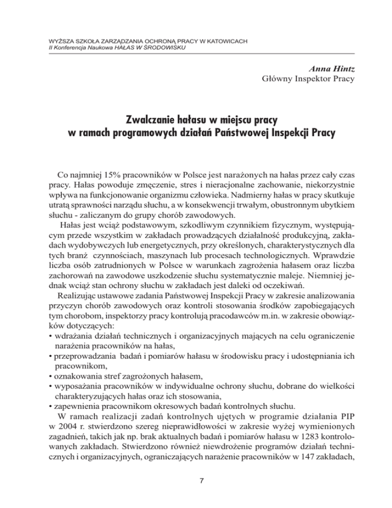 WYŻSZA SZKOŁA ZARZĄDZANIA OCHRONĄ PRACY W KATOWICACH II Konferencja Naukowa HAŁAS W ŚRODOWISKU Anna Hintz Główny Inspektor Pracy Zwalczanie ha³asu w miejscu pracy w ramach programowych dzia³añ Pañstwowej Inspekcji Pracy Co najmniej 15% pracowników w Polsce jest narażonych na hałas przez cały czas pracy. Hałas powoduje zmęczenie, stres i nieracjonalne zachowanie, niekorzystnie wpływa na funkcjonowanie organizmu człowieka. Nadmierny hałas w pracy skutkuje utratą sprawności narządu słuchu, a w konsekwencji trwałym, obustronnym ubytkiem słuchu - zaliczanym do grupy chorób zawodowych. Hałas jest wciąż podstawowym, szkodliwym czynnikiem fizycznym, występującym przede wszystkim w zakładach prowadzących działalność produkcyjną, zakładach wydobywczych lub energetycznych, przy określonych, charakterystycznych dla tych branż czynnościach, maszynach lub procesach technologicznych. Wprawdzie liczba osób zatrudnionych w Polsce w warunkach zagrożenia hałasem oraz liczba zachorowań na zawodowe uszkodzenie słuchu systematycznie maleje. Niemniej jednak wciąż stan ochrony słuchu w zakładach jest daleki od oczekiwań. Realizując ustawowe zadania Państwowej Inspekcji Pracy w zakresie analizowania przyczyn chorób zawodowych oraz kontroli stosowania środków zapobiegających tym chorobom, inspektorzy pracy kontrolują pracodawców m.in. w zakresie obowiązków dotyczących: • wdrażania działań technicznych i organizacyjnych mających na celu ograniczenie narażenia pracowników na hałas, • przeprowadzania badań i pomiarów hałasu w środowisku pracy i udostępniania ich pracownikom, • oznakowania stref zagrożonych hałasem, • wyposażania pracowników w indywidualne ochrony słuchu, dobrane do wielkości charakteryzujących hałas oraz ich stosowania, • zapewnienia pracownikom okresowych badań kontrolnych słuchu. W ramach realizacji zadań kontrolnych ujętych w programie działania PIP w 2004 r. stwierdzono szereg nieprawidłowości w zakresie wyżej wymienionych zagadnień, takich jak np. brak aktualnych badań i pomiarów hałasu w 1283 kontrolowanych zakładach. Stwierdzono również niewdrożenie programów działań technicznych i organizacyjnych, ograniczających narażenie pracowników w 147 zakładach, 7 Anna Hintz w których przekroczone zostały wartości dopuszczalne hałasu. Pracodawcy nie informowali pracowników o przekroczeniach wartości dopuszczalnych hałasu w 94 kontrolowanych zakładach. W 39 zakładach nie wyznaczono stref zagrożenia hałasem. Brak wyposażenia pracowników w odpowiednie indywidualne ochrony słuchu stwierdzono w 325 kontrolowanych zakładach, natomiast niewłaściwy dobór indywidualnych ochron słuchu w 35 zakładach. Nieprawidłowości w zakresie zapewnienia ochrony pracowników przed zagrożeniami związanymi z narażeniem na hałas stwierdzano przede wszystkim w zakładach produkcji drewna i wyrobów z drewna, w zakładach produkcji metali i wyrobów z metali, w zakładach włókienniczych i sprzętu transportowego oraz kopalniach węgla kamiennego, brunatnego i miedzi. Decyzje wydane w związku ze stwierdzonymi nieprawidłowościami spowodowały m.in.: • wykonanie aktualnych badań i pomiarów hałasu na stanowiskach pracy, na których zatrudniano 12324 pracowników (wg nieostatecznych danych PIP uzyskanych do momentu sporządzenia niniejszej informacji), • wdrożenie działań ograniczających narażenie na hałas 1993 pracowników w zakładach, w których stwierdzono przekroczenia wartości dopuszczalnych hałasu, • poinformowanie 2114 pracowników o przekroczonych wartościach dopuszczalnych hałasu, • wyposażenie 848 pracowników w indywidualne ochrony słuchu, natomiast dla 655 pracowników dokonano właściwego doboru indywidualnych ochron słuchu. W latach 2001-2003 realizowano długofalowy program wzmożonego nadzoru nad warunkami pracy w 137 zakładach różnych branż, zatrudniających łącznie ponad 126 tys. pracowników, z których 36 tys. zatrudnionych było w warunkach zagrożenia czynnikami szkodliwymi środowiska pracy, w tym nadmiernym hałasem. W trakcie trzyletniej realizacji programu liczba zatrudnionych w warunkach zagrożenia zmniejszyła się do 29 tys. Znacznemu zmniejszeniu uległa liczba chorób zawodowych narządu słuchu - ze 119 przypadków zarejestrowanych w 2001 r. do 57 przypadków - w 2003 r. Wieloletnie doświadczenia wskazują, iż zwiększenie częstotliwości kontroli w zakładach, charakteryzujących się znacznym stopniem zagrożeń zawodowych, w tym chorobowych przynosi konkretne efekty. Dlatego w programie na lata 2004-2006 wzmożonym nadzorem objęto 92 zakłady różnych branż, w tym 45 zakładów objętych nadzorem w latach 2001-2003. W roku 2004, który był pierwszym rokiem nowego, trzyletniego programu wzmożonego nadzoru, wyegzekwowano przy pomocy wydanych decyzji wdrożenie programów działań ograniczających narażenie na hałas w 8 zakładach, zatrudniających 481 pracowników. Inspektorzy pracy oczekują, że wdrożenie drugiego etapu zróżnicowanej składki ubezpieczenia wypadkowego - ustalanej m.in. na podstawie liczby zatrudnionych w warunkach zagrożenia - zmobilizuje pracodawców do radykalniejszych, niż dotychczas inwestycji w poprawę warunków pracy. 8 Zwalczanie hałasu w miejscu pracy w ramach programowych działań Państwowej Inspekcji Pracy Rok 2004 był piątym rokiem wdrażania zakładowych programów ochrony słuchu w 23 zakładach województwa świętokrzyskiego, przy współudziale Wojewódzkiego Ośrodka Medycyny Pracy w Kielcach, Okręgowego Inspektoratu Pracy oraz Państwowego Wojewódzkiego Inspektora Sanitarnego. Celem programu jest ograniczenie emisji hałasu na określonych stanowiskach pracy, zapewnienie odpowiednich ochron indywidualnych słuchu oraz poprawa opieki medycznej. Udział zakładów jest dobrowolny i wynika z chęci uzyskania trwałej i znaczącej poprawy w walce z hałasem, skutkującej