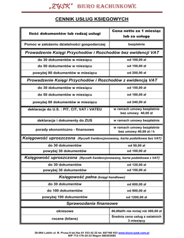 cennik usług księgowych - Biuro Rachunkowe Zysk mgr.Bogumila