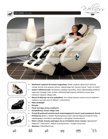• • • • • • • • • • • Możliwość regulacji 3d masażu kręgosłupa: Dzięki czujkom optycznym wykryty zostaje wzrost oraz pozycja ramion, zapewniając tym samym masaż “szyty na miarę”. System refleksoterapii: Na piętach znajdują się punkty, które odpowiadają każdemu organowi Twojego ciała. System refleksoterapii poprzez delikatny masaż stóp rozluźnia napięcie całego ciała. Masaż & Wibracje ud oraz pośladków: Ten rodzaj masażu usuwa uczucie ciężkości i napięcia, pozwala poczuć lekkość i rozluźnienie. Efekt Ambilight Muzyka Panel sterujący pracą urządzenia Kompleksowy masaż całego ciała Ponad 40 poduszek powietrznych wspomagających masaż i poprawiających drenaż limfatyczny (jedno z działań fizjoterapeutycznych usprawniających krążenie limfy, zapobiegający chorobom wynikającym z obrzęków zastoinowych) Różne rodzaje masażu opierające się na orientalnej sztuce masażu: Ugniatanie*, Klepanie*, Uderzanie*, Masaż na przemienny*, Terapia muzyczna* Wymiary: 130x103x121cm Waga: 120kg RODZAJE MASAŻU *KNEADING MASSAGE (Ugniatanie): Masaż rozluźniający plecy, wzmacniający mięśnie. *TAPPING MASSAGE (Klepanie): Bardzo delikatny i przyjemny masaż, w którym “sprawne dłonie masażysty” przesuwają się wzdłuż pleców wspomagając krążenie tlenu w ciele. *WAVELET MASSAGE (Masaż na przemienny): Kombinacja dwóch rodzajów masażu: ugniatania i klepania. Funkcja wzmaga dobroczynne działanie rozluźniające obu typów masażu. *PUMMELLING MASSAGE (Uderzanie): Masaż stymulujący, w którym “kłykcie masażysty” przesuwają się wzdłuż pleców pomagając rozluźnić mięśnie i wspomagając krążenie. SHIATSU MASSAGE (Masaż Shiatsu): Masaż SHIATSU zwany również akupunkturą bez igieł wywodzi się z filozofii Dalekiego Wschodu. SHIATSU w języku japońskim pochodzi od słów SHI czyli palec oraz ATSU czyli ucisk i jest jednym z rodzajów masażu. *MUSICAL THERAPY (Terapia muzyczna): Połączenie różnych funkcji masażu (rodzajów, intensywności i obszaru masażu) z Twoją ulubioną muzyką, wspomagającą uczucie relaksu i rozluźnienia. SWEDISH MASSAGE (Masaż szwedzki): To kombinacja kolistego masażu z delikatnym klepaniem. Jest to podobny rodzaj masażu do masażu na przemiennego, choć nie jest aż tak energiczny.