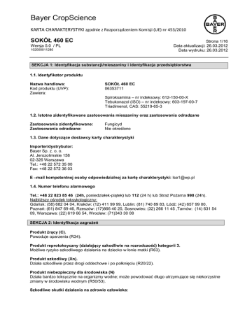Bayer CropScience KARTA CHARAKTERYSTYKI zgodnie z Rozporządzeniem Komisji (UE) nr 453/2010 SOKÓŁ 460 EC Strona 1/16 Data aktualizacji: 26.03.2012 Data wydruku: 26.03.2012 Wersja 5.0 / PL 102000011280 1. SEKCJA 1: Identyfikacja substancji/mieszaniny i identyfikacja przedsiębiorstwa 1.1. Identyfikator produktu Nazwa handlowa: Kod produktu (UVP): Zawiera: SOKÓŁ 460 EC 06353711 Spiroksamina – nr indeksowy: 612-150-00-X Tebukonazol (ISO) – nr indeksowy: 603-197-00-7 Triadimenol, CAS: 55219-65-3 1.2. Istotne zidentyfikowane zastosowania mieszaniny oraz zastosowania odradzane Zastosowania zidentyfikowane: Zastosowania odradzane: Fungicyd Nie określono 1.3. Dane dotyczące dostawcy karty charakterystyki Importer/dystrybutor: Bayer Sp. z. o. o. Al. Jerozolimskie 158 02-326 Warszawa Tel.: +48 22 572 35 00 Fax: +48 22 572 36 03 E –mail kompetentnej osoby odpowiedzialnej za kartę charakterystyki: [email protected] 1.4. Numer telefonu alarmowego Tel.: +48 22 823 85 46 (24h, poniedziałek-piątek) lub 112 (24 h) lub Straż Pożarna 998 (24h). Najbliższy ośrodek toksykologiczny: Gdańsk: (58) 682 04 04, Kraków: (12) 411 99 99, Lublin: (81) 740 89 83, Łódź: (42) 657 99 00, Poznań: (61) 847 69 46, Rzeszów: (17)866 40 25, Sosnowiec: (32) 266 11 45 ,Tarnów: (14) 631 54 09, Warszawa: (22) 619 66 54, Wrocław: (71)343 30 08 SEKCJA 2: Identyfikacja zagrożeń Produkt żrący (C). Powoduje oparzenia (R34). Produkt reprotoksyczny (działający szkodliwie na rozrodczość) kategorii 3. Możliwe ryzyko szkodliwego działania na dziecko w łonie matki (R63). Produkt szkodliwy (Xn). Działa szkodliwie przez drogi oddechowe i po połknięciu (R20/22). Produkt niebezpieczny dla środowiska (N) Działa bardzo toksycznie na organizmy wodne; może powodować długo utrzymujące się niekorzystne zmiany w środowisku wodnym (R50/53). Szkodliwe skutki działania na zdrowie człowieka: Bayer CropScience KARTA CHARAKTERYSTYKI zgodnie z Rozporządzeniem Komisji (UE) nr 453/2010 SOKÓŁ 460 EC Strona 2/16 Data aktualizacji: 26.03.2012 Data wydruku: 26.03.2012 Wersja 5.0 / PL 102000011280 Produkt wykazuje działanie miejscowo żrące i szkodliwe. Może powodować oparzenia skóry, spojówek, rogówki oka. Może wystąpić podrażnienie błon śluzowych i układu oddechowego charakteryzujące się drapaniem w gardle, kaszlem. W przypadku połknięcia istnieje niebezpieczeństwo oparzenia ust, gardła, przewodu pokarmowego oraz perforacji ścian żołądka. Objawy: nudności, wymioty, ból. Skutki działania na środowisko: Działa bardzo toksycznie na organizmy wodne; może powodować długo utrzymujące się niekorzystne zmiany w środowisku wodnym. Skutki działania związane z właściwościami fizykochemicznymi: Nie są znane niebezpieczne skutki działania związane z właściwościami fizykochemicznymi. 2.2. Elementy oznakowania Oznakowanie produktu zgodne z dyrektywą Unii Europejskiej 1999/45/WE z późniejszymi zmianami i z przepisami polskimi. Piktogramy określające rodzaj zagrożenia: C N Produkt żrący Produkt niebezpieczny dla środowiska Zwroty wskazujące rodzaj zagrożenia: R20/22 Działa szkodliwie przez drogi oddechowe i po połknięciu. R34 Powoduje oparzenia. R50/53 Działa bardzo toksycznie na organizmy wodne; może powodować długo utrzymujące się niekorzystne zmiany w środowisku wodnym. R63 Możliwe ryzyko szkodliwego działania na dziecko w łonie matki. Zwroty określające warunki bezpiecznego stosowania: S26 Zanieczyszczone oczy przemyć natychmiast dużą ilością wody i zasięgnąć porady lekarza. S36/37/39 Nosić odpowiednią odzież ochronną, odpowiednie rękawice ochronne i okulary lub ochronę twarzy. S45 W przypadku awarii lub jeżeli źle się poczujesz, niezwłocznie zasięgnij porady lekarza - jeżeli to możliwe, pokaż etykietę. S35 Usuwać produkt i jego opakowanie w sposób bezpieczny. S57 Używać odpowiednich pojemników zapobiegających skażeniu środowiska. S61 Unikać zrzutów do środowiska. Postępować zgodnie z instrukcją lub kartą charakterystyki. Zawiera: spiroksaminę. Może powodować wystąpienie reakcji alergicznej. Dodatkowe zwroty określające warunki bezpiecznego stosowania: SP 1 Nie zanieczyszczać wód produktem lub jego opakowaniem. Bayer CropScience KARTA CHARAKTERYSTYKI zgodnie z Rozporządzeniem Komisji (UE) nr 453/2010 SOKÓŁ 460 EC Strona 3/16 Data aktualizacji: 26.03.2012 Data wydruku: 26.03.2012 Wersja 5.0 / PL 102000011280 SPa 1 W celu uniknięcia powstawania odporności nie stosować tego ani żadnego innego produktu zawierającego ketoaminy i triazole dłużej niż 2-3 krotnie/częściej niż 7-14 dni. Przestrzegaj etykiety-instrukcji stosowania środka ochrony roślin w celu ograniczenia ryzyka dla zdrowia i środowiska. 2.3. Inne zagrożenia Mieszanina nie spełnia kryteriów PBT oraz vPvB zgodnie z Rozporządzeniem WE 1907/2006 (REACH), załącznik XIII. SEKCJA 3: Skład/informacja o składnikach 3.1. Klasyfikacja substancji - nie dotyczy. 3.2. Klasyfikacja mieszaniny Nazwa handlowa: SOKÓŁ 460 EC Zawiera: Spiroksamina – nr indeksowy: 612-150-00-X Tebukonazol (ISO) – nr indeksowy: 603-197-00-7 Triadimenol, CAS: 55219-65-3 Charakterystyka chemiczna Koncentrat do sporządzania emulsji wodnej (EC) Spiroksamina 250 g/l, Tebukonazol 167 g/l, Triadimenol 43 g/l Składniki mieszaniny: Nazwa substancji nr indekso wy Spiroksamina 612-15000-X Eter alkiloarylopoli glikolowy - N,NDimetylodekan oamid - Tebukonazol (ISO) 603-19700-7 nr CAS 118134-30-8 104376-75-2 14433-76-2 107534-96-3 nr WE - uł. masow y w% Klasyfikacja zgodna z dyrektywą Rady 67/548/EWG Znak ostrzeg awczy 25,20 Sym bol Klasyfikacja zgodna z rozporządzeniem (WE) nr 1272/2008 Kody zwrotów wskazujących rodzaj zagrożenia Zwroty R Klasy zagrożenia i kody kategorii Xn, N R20/21/22, R38, R43, R50/53 Acute Tox. 4 * Acute Tox. 4 * Acute Tox. 4 * Skin Irrit. 2 Skin Sens. 1 Aquatic Acute 1 Aquatic Chronic 1 H332 H312 H302 H315 H317 H400 H410 - 52/53 Aquatic Ch