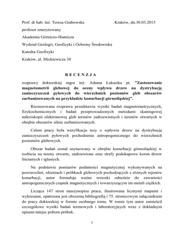 Prof. dr hab. inż. Teresa Grabowska Kraków, dn.30.03.2015 profesor emerytowany Akademia Górniczo-Hutnicza Wydział Geologii, Geofizyki i Ochrony Środowiska Katedra Geofizyki Kraków, al. Mickiewicza 30 RECENZJA rozprawy doktorskiej mgra inż. Adama Łukasika pt. ”Zastosowanie magnetometrii glebowej do oceny wpływu drzew na dystrybucję zanieczyszczeń pyłowych do wierzchnich poziomów gleb obszarów zurbanizowanych na przykładzie konurbacji górnośląskiej”. Recenzowana rozprawa przedstawia wyniki badań magnetometrycznych, fizykochemicznych i badań przeprowadzonych metodami skaningowej mikroskopii elektronowej gleb terenów zadrzewionych i terenów otwartych w obrębie obszarów silnie zurbanizowanych. Celem pracy była weryfikacja tezy o wpływie drzew na dystrybucję zanieczyszczeń pyłowych pochodzenia antropogenicznego do wierzchnich poziomów glebowych. Obszar badań został usytuowany w obrębie konurbacji górnośląskiej w rozbiciu na tereny otwarte, zadrzewione oraz strefy podokapowe koron drzew liściastych i iglastych. Na podstawie pomiarów podatności magnetycznej wykonywanych na powierzchni, rdzeniach i próbkach glebowych pochodzących z różnych rejonów konurbacji, autor formułuje ważne wnioski odnośnie do zawartości antropogenicznych cząstek magnetycznych i towarzyszącym im metali ciężkich. Licząca 147 stron maszynopisu praca, ilustrowana licznymi mapami i wykresami, opatrzona jest obszerną bibliografią i 75. stronicowym załącznikiem do pracy doktorskiej w formie osobnego tomu. W tomie tym autor zamieścił szczegółowe wyniki badań terenowych i laboratoryjnych wraz z dokładnym opisem miejsc poboru próbek. 1 Pomiary podatności magnetycznej wykonane na rdzeniach imisyjnych i artefaktowych ilustrowane są tutaj licznymi wykresami zmian podatności z głębokością. W tej części pracy zamieszczone są również zdjęcia rdzeni, pobranych ze stref podokapowych koron drzew liściastych i iglastych, a także zdjęcia mikroskopowe cząstek pyłowych o różnym składzie chemicznym i kształtach geometrycznych. Rozprawa składa się z 7. rozdziałów, z których dwa ostatnie zawierają rozbudowaną dyskusję wyników badań i wnioski. Pierwszy rozdział rozprawy przedstawia podstawy teoretyczne magnetometrii glebowej oraz określa cel i zakres przeprowadzonych badań. W rozbudowanym rozdziale drugim autor podaje podstawowe definicje z zakresu magnetometrii zwracając szczególną uwagę na pojęcie podatności magnetycznej, jej rodzaje i znaczenie, jako podstawowego parametru wykorzystywanego w magnetometrii glebowej. Najwięcej miejsca z uwagi na zakres i temat pracy, autor poświęca podatności magnetycznej gleby określonej w recenzowanej pracy mianem technogenicznej podatności magnetycznej, która w odniesieniu do gleby wiąże się ściśle z obecnością w niej ferro/ferrimagnetyków, pochodzących głównie z pyłów przemysłowych. Technogeniczne pochodzenie ferro/ferrimagnetyków, takich jak np. magnetyt, maghemit, żelazo metaliczne znajdujących się w pyłach, sprzyja obecności w nich metali ciężkich, które w wysokotemperaturowych procesach wnikają do wnętrza struktury kryształów cząstek magnetycznych lub mogą się z nimi wiązać siłami adsorpcji. Autor zwraca również uwagę na inne, obok przemysłowych, źródła zanieczyszczeń atmosfery. Są nimi transport samochodowy i kolejowy oraz domowe paleniska, będące źródłem tak zwanej niskiej emisji pyłów. W rozdziale drugim autor omawia również dotychczasowe wyniki badań nad podatnością magnetyczną gleb naszego kraju, skupiając swoją uwagę na obszarze konurbacji górnośląskiej, zaznaczającym się na mapie podatności magnetycznej gleb Polski obecnością silnej, rozległej anomalii kappametrycznej. 2 Posiłkując się danymi literaturowymi i biorąc pod uwagę zdolność skupiania zanieczyszczeń atmosferycznych przez korony drzew, autor podkreśla rolę parków, zieleńców, skwerów itp. w zmniejszaniu zagrożeń pyłowych. W celu realizacji postawionego zadania jakim jest weryfikacja tezy o wpływie drzew na dystrybucję do gleby zanieczyszczeń pyłowych pochodzenia antropogenicznego wytypowano dwa rodzaje obiektów badawczych. Były nimi tereny parków miejskich, zlokalizowanych w obrębie konurbacji i obszary leśne, znajdujące się na terenie lasów gospodarczych, administrowanych przez Regionalną Dyrekcję Lasów Państwowych (RDLP) Katowice. Dokładnemu opisowi obiektów badawczych poświęcony został rozdział trzeci rozprawy. W kolejnych podrozdziałach tego rozdziału przedstawiona została szczegółowa charakterystyka zabrzańskiego parku im. Poległych Bohaterów, miejskiego parku w Tarnowskich Górach, katowickiego parku im. Tadeusza Kościuszki oraz parku o nazwie „Zielona” w Dąbrowie Górniczej. Zaprezentowany w pracy opis tych obiektów rekreacyjnych zawiera krótki zarys historyczny ich powstania, rozmiar zajmowanej powierzchni, nazwy drzew i krzewów oraz usytuowanie względem znaczących emitorów zanieczyszczeń pyłowych, a także zestawione na podstawie danych Wojewódzkiej Stacji Sanitarno-Epidemiologicznej(W.S.S.E.) w Katowicach ilości depozycji pyłów i cząstek wybranych metali ciężkich (Fe, Pb, Cd,. Zn ) w latach od 1979 – 2001 na tych terenach. Podobnie scharakteryzowane zostały powierzchnie badawcze na terenach leśnych w okolicach Zabrza i Katowic. W tym przypadku do pomiarów podatności magnetycznej zostały wytypowane gleby strefy podokapowej dwóch gatunków drzew, reprezentujących drzewa liściaste i drzewa iglaste o podobnym wieku i wysokości. Czwarty rozdział rozprawy przedstawia metodykę i opis badań przeprowadzonych w terenie. W zakres badań wchodziły pomiary objętościowej podatności magnetycznej gleb dokonywane przy użyciu aparatury MS2 produkcji angielskiej firmy Bartington. Aparatura ta, wyposażona jest w wiele czujników, które umożliwiają m.in. pomiary podatności in situ (