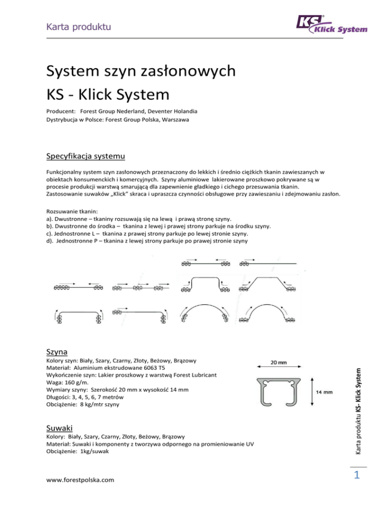 Karta produktu System szyn zasłonowych KS - Klick System Producent: Forest Group Nederland, Deventer Holandia Dystrybucja w Polsce: Forest Group Polska, Warszawa Specyfikacja systemu Funkcjonalny system szyn zasłonowych przeznaczony do lekkich i średnio ciężkich tkanin zawieszanych w obiektach konsumenckich i komercyjnych. Szyny aluminiowe lakierowane proszkowo pokrywane są w procesie produkcji warstwą smarującą dla zapewnienie gładkiego i cichego przesuwania tkanin. Zastosowanie suwaków „Klick” skraca i upraszcza czynności obsługowe przy zawieszaniu i zdejmowaniu zasłon. Rozsuwanie tkanin: a). Dwustronne – tkaniny rozsuwają się na lewą i prawą stronę szyny. b). Dwustronne do środka – tkanina z lewej i prawej strony parkuje na środku szyny. c). Jednostronne L – tkanina z prawej strony parkuje po lewej stronie szyny. d). Jednostronne P – tkanina z lewej strony parkuje po prawej stronie szyny Szyna Kolory: Biały, Szary, Czarny, Złoty, Beżowy, Brązowy Materiał: Suwaki i komponenty z tworzywa odpornego na promieniowanie UV Obciążenie: 1kg/suwak Karta produktu KS- Klick System Kolory szyn: Biały, Szary, Czarny, Złoty, Beżowy, Brązowy Materiał: Aluminium ekstrudowane 6063 T5 Wykończenie szyn: Lakier proszkowy z warstwą Forest Lubricant Waga: 160 g/m. Wymiary szyny: Szerokość 20 mm x wysokość 14 mm Długości: 3, 4, 5, 6, 7 metrów Obciążenie: 8 kg/mtr szyny www.forestpolska.com 1 Suwaki Karta produktu Zawieszanie tkanin: a). Suwak AS (do haczyków regulowanych typu ”flex”i haczyków metalowych), b). Agrafka (do taśm marszczących) - suwak może być wpinany na dowolnym odcinku szyny KS. c). System EasyFold (tkanina upięta w formie fali na połączonych ze sobą suwakach) System KS umożliwia zawieszanie tkanin na ramionach prowadzących dla lepszego zaciemnienia wnętrza. Komplet składa się z ramion: prostego i zachodzącego, ze stali lub tworzywa POM Dłuższą żywotność i dobry wygląd tkanin zapewni obsługa szyn za pomocą prętów do przesuwania tkanin Pręt transparent ø 12 mm– tworzywo Perspex: dł. 92cm, 122 cm, 152 cm Pręt biały ø 9,5 m - włókno szklane biały: dł. 92cm, 122 cm, 152 cm Obie wersje posiadają zaczep odporny na korozję Instalacja Mocowanie: System zapewnia możliwość zawieszania szyn z tkaninami do powierzchni sufitu lub ściany. Należy zapewnić możliwość zamocowania uchwytów stalowych lub aluminiowych co 50 - 80 cm, w zależności od wagi zawieszanych tkanin. Możliwości mocowania szyn: a). Pojedynczo b). Podwójnie c). Potrójnie Uchwyty systemowe: a). Ścienne: pojedyncze, podwójne i potrójne. Długości od 3,5 do 30 cm od ściany. b). Sufitowe: pojedyncze, podwójne, potrójne c). Końcowe – do podtrzymywania łuków Kolory: Biały, Szary, Czarny, Złoty, Beżowy, Brązowy Materiał: Stal lub aluminium plus elementy z tworzywa odpornego na promieniowanie UV Gięcie szyn Gięcie w poziomie: kąt – promień 10 cm / łuk ciągły – minimalny promień 50 cm Gięcie w pionie: łuk ciągły minimalny promień 50 cm Wprowadzenie na rynek systemu szyn giętych KS - Klick System wraz z uchwytami Smart Klick zapoczątkowało wejście Forest Group do grona światowych producentów profesjonalnych rozwiązań do zasłaniania i dekoracji okien. Ponad 25 lat później, systemy zasłonowe Forest Group ciągle są innowacyjne, funkcjonalne i tworzone z zachowaniem najwyższej jakości. Lista referencyjna znajduje się na stronie www.viewontheworld.info Szyny i komponenty systemu KS objęte są 10 letnią gwarancją. www.forestpolska.com Karta produktu KS- Klick System Gwarancja: 10 lat 2