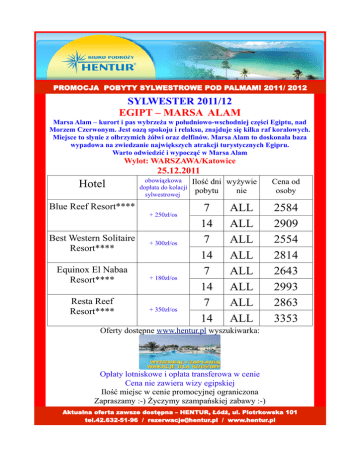 PROMOCJA POBYTY SYLWESTROWE POD PALMAMI 2011/ 2012 SYLWESTER 2011/12 EGIPT – MARSA ALAM Marsa Alam – kurort i pas wybrzeża w południowo-wschodniej części Egiptu, nad Morzem Czerwonym. Jest oazą spokoju i relaksu, znajduje się kilka raf koralowych. Miejsce to słynie z olbrzymich żółwi oraz delfinów. Marsa Alam to doskonała baza wypadowa na zwiedzanie największych atrakcji turystycznych Egipru. Warto odwiedzić i wypocząć w Marsa Alam Wylot: WARSZAWA/Katowice 25.12.2011 Hotel obowiązkowa dopłata do kolacji sylwestrowej Blue Reef Resort**** + 250zł/os Best Western Solitaire Resort**** Equinox El Nabaa Resort**** Resta Reef Resort**** + 300zł/os + 180zł/os + 350zł/os Ilość dni wyżywie pobytu nie 7 14 7 14 7 14 7 14 ALL ALL ALL ALL ALL ALL ALL ALL Cena od osoby 2584 2909 2554 2814 2643 2993 2863 3353 Oferty dostępne www.hentur.pl wyszukiwarka: Opłaty lotniskowe i opłata transferowa w cenie Cena nie zawiera wizy egipskiej Ilość miejsc w cenie promocyjnej ograniczona Zapraszamy :-) Życzymy szampańskiej zabawy :-) Aktualna oferta zawsze dostępna – HENTUR, Łódź, ul. Piotrkowska 101 tel.42.632-51-96 / [email protected] / www.hentur.pl