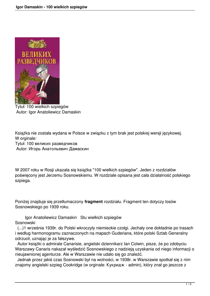 Igor Damaskin - 100 wielkich szpiegów Tytuł: 100 wielkich szpiegów Autor: Igor Anatoliewicz Damaskin Książka nie została wydana w Polsce w związku z tym brak jest polskiej wersji językowej. W orginale: Tytuł: 100 великих разведчиков Autor: Игорь Анатольевич Дамаскин W 2007 roku w Rosji ukazała się książka "100 wielkich szpiegów". Jeden z rozdziałów poświęcony jest Jerzemu Sosnowskiemu. W rozdziale opisana jest cała działalność polskiego szpiega. Poniżej znajduje się przetłumaczony fragment rozdziału. Fragment ten dotyczy losów Sosnowskiego po 1939 roku. Igor Anatoliewicz Damaskin Stu wielkich szpiegów Sosnowski (...)1 września 1939r. do Polski wkroczyły niemieckie czołgi. Jechały one dokładnie po trasach i według harmonogramu zaznaczonych na mapach Guderiana, które polski Sztab Generalny odrzucił, uznając je za fałszywe. Autor książki o admirale Canarisie, angielski dziennikarz Ian Colwin, pisze, że po zdobyciu Warszawy Canaris nakazał wyśledzić Sosnowskiego z nadzieją uzyskania od niego informacji o nieujawnionej agenturze. Ale w Warszawie nie udało się go znaleźć. Jednak przez jakiś czas Sosnowski był na wolności, w 1938r. w Warszawie spotkał się z nim znajomy angielski szpieg Cookridge (w orginale: Кукридж - admin), który znał go jeszcze z 1/3 Igor Damaskin - 100 wielkich szpiegów Berlina. Sosnowski osiwiał, wyglądał na zmęczonego i winił się za śmierć Benity. Sosnowski nie zgodził się na rozmowę z Cookridgem. Wkrótce został aresztowany i zamknięty w jednym z najbardziej mrocznych politycznych więzień w Polsce – w „Berezie Kartuskiej”. Właśnie tam, we wrześniu 1939r., gdy do zachodniej Białorusi weszły oddziały Armii Czerwonej, został znaleziony ten niegdyś wybitny oficer, ulubieniec kobiet. Tysiące więźniów „Berezy Kartuskiej” – białoruskich konspirantów, komunistów, chłopów-buntowników i innych, zostało zwolnionych i wysłanych do domów. W tym i Sosnowski. Ale na nieszczęsnego Sosnowskiego czekało trzecie więzienie – tym razem radzieckie. Już po uwolnieniu zainteresowały się nim organy specjalne i zabrały go do Moskwy, jako cennego polskiego szpiega. O nic go nie oskarżono, był przetrzymywany na Łubiance w miarę możliwości w korzystnych warunkach i zaliczał się do wywiadu. I znów w jego losy wplątała się kobieta. Pracę z Sosnowskim zlecono doświadczonej szpieg Zoi Rybkinej-Woskresenskiej. Był 1940 rok. W rozmowie z autorem tego tekstu opowiedziała ona, że jej głównym zadaniem w pracy z Sosnowskim było zdobywanie informacji dotyczących hitlerowskiego planu „Drang nach Osten”, który później stał się podstawą dla znanego planu „Barbarossa”. Sosnowski nie był otwarty na rozmowy. Starczało mu odwagi, by odpowiedzieć, że „obowiązek polskiego oficera nie pozwala na współpracę z radzieckim wywiadem”. Rybkina zastosowała pewien podstęp. Wykorzystała fakt, że na ostatnim etapie działalność Sosnowskiego była kontrolowana przez gestapo, a kontrolę tę prowadził nie kto inny, jak agent radzieckiego wywiadu, Breitenbach, pracujący jako pomocnik szefa gestapo – Mullera. Prowadziła rozmowy z Sosnowskim w następujący sposób: zadawała pytania, a odpowiedzi komentował i poprawiał szpieg Wasilij Zarubin. Podawał on okoliczności i miejsca spotkań Sosnowskiego z agentami, numery i marki samochodów, a nawet sumy pieniędzy, jakie wydawał w restauracjach czy nazwy koni. Sosnowski coraz bardziej się gubił, aż „wróciła mu pamięć”, wstał, ukłonił się i powiedział: -Jestem zachwycony sztuką radzieckiego wywiadu. Wiecie o mnie więcej, niż ja sam. Jestem gotów na przypomnienie sobie wszystkiego, co was interesuje. Jurek podał informacje o pracy szpiegowskiej Ribbentropa i stosunkach niemieckiego Ministerstwa Spraw Zagranicznych z abwehrem i gestapo. Po Rybkinej pracował z nim znany szpieg Sudopłatow. W tym czasie Sosnowski współpracował już z radzieckim wywiadem. Powiedział on o dwóch swoich agentach, o których gestapo nigdy się nie dowiedziało, podczas gdy oni dalej działali. Dzięki Sosnowskiemu wznowiono z nimi kontakt, który utrzymywał się do początku wojny. Nie istnieją wiarygodne dane o dalszych losach Sosnowskiego. Rybkina opowiadała autorowi, że słyszała jak w 1943r. został zwolniony z więzienia, wstąpił do Wojska Polskiego i zginął w bitwie o Warszawę. Po wykonaniu wyroku na żonie baron von Berg zwrócił się do Sądu Najwyższego w Leipzig z prośbą o uznanie jego związku z Benitą „zdrajczynią, odtrąconą przez niemiecką rasę” za „nieważny od samego początku”. Sąd spełnił jego prośbę. Pułkownik von Natzmer, ojciec Renaty, wstrząśnięty jej śmiercią, zmarł kilka miesięcy po wykonaniu wyroku na jego córce. Jego żona zmarła zaraz po nim. Irene von Jena została wysłana z więzienia do jednego z żeńskich obozów koncentracyjnych, gdzie zakończyła swoje życie. Co do tancerki Rity Pasi, która była odpowiedzialna za zdemaskowanie Jerzego 2/3 Igor Damaskin - 100 wielkich szpiegów Sosnowskiego, ostatnia informacja o niej pochodzi z 1950r., kiedy widziano ją w zachodniej części Niemiec podczas występu z cygańskim zespołem. 3/3
