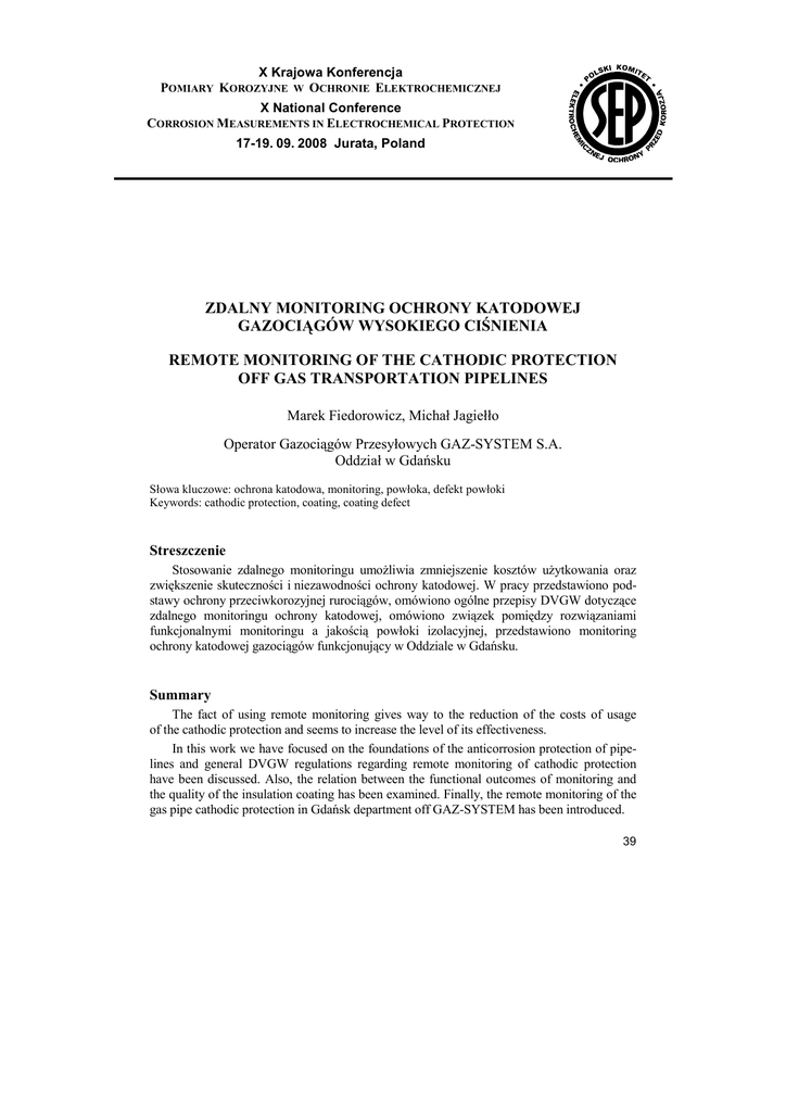 X Krajowa Konferencja POMIARY KOROZYJNE W OCHRONIE ELEKTROCHEMICZNEJ X National Conference CORROSION MEASUREMENTS IN ELECTROCHEMICAL PROTECTION 17-19. 09. 2008 Jurata, Poland ZDALNY MONITORING OCHRONY KATODOWEJ GAZOCIĄGÓW WYSOKIEGO CIŚNIENIA REMOTE MONITORING OF THE CATHODIC PROTECTION OFF GAS TRANSPORTATION PIPELINES Marek Fiedorowicz, Michał Jagiełło Operator Gazociągów Przesyłowych GAZ-SYSTEM S.A. Oddział w Gdańsku Słowa kluczowe: ochrona katodowa, monitoring, powłoka, defekt powłoki Keywords: cathodic protection, coating, coating defect Streszczenie Stosowanie zdalnego monitoringu umożliwia zmniejszenie kosztów użytkowania oraz zwiększenie skuteczności i niezawodności ochrony katodowej. W pracy przedstawiono podstawy ochrony przeciwkorozyjnej rurociągów, omówiono ogólne przepisy DVGW dotyczące zdalnego monitoringu ochrony katodowej, omówiono związek pomiędzy rozwiązaniami funkcjonalnymi monitoringu a jakością powłoki izolacyjnej, przedstawiono monitoring ochrony katodowej gazociągów funkcjonujący w Oddziale w Gdańsku. Summary The fact of using remote monitoring gives way to the reduction of the costs of usage of the cathodic protection and seems to increase the level of its effectiveness. In this work we have focused on the foundations of the anticorrosion protection of pipelines and general DVGW regulations regarding remote monitoring of cathodic protection have been discussed. Also, the relation between the functional outcomes of monitoring and the quality of the insulation coating has been examined. Finally, the remote monitoring of the gas pipe cathodic protection in Gdańsk department off GAZ-SYSTEM has been introduced. 39 1. Wprowadzenie Ochrona przed korozją to jeden z ważniejszych czynników decydujących o stanie technicznym stalowych gazociągów, bezpieczeństwie i ciągłości dostaw gazu oraz szeroko rozumianych kosztach użytkowania sieci. Ten aspekt dotyczący budowy i użytkowania gazociągów w dłuższej perspektywie ma istotny wymiar ekonomiczny. Kwestie dotyczące zapewnienia skutecznej ochrony przed korozją gazociągów wysokiego ciśnienia uwzględnione są w przepisach budowy i użytkowania, normach, metodach zarządzania ryzykiem. Zgodnie z obowiązującym rozporządzeniem Ministra Gospodarki z dnia 30 lipca 2001 r. w sprawie warunków technicznych, jakim powinny odpowiadać sieci gazowe [1], gazociągi stalowe powinny być zabezpieczone przed korozją za pomocą powłok izolacyjnych z tworzyw sztucznych i ochrony elektrochemicznej. Obowiązek stosowania ochrony katodowej gazociągów wysokiego ciśnienia, w tym ochrony przed korozją powodowaną przez prądy błądzące, istnieje od 1978 r. [2]. Zmniejszenie kosztów inwestycyjnych i użytkowania ochrony katodowej oraz zwiększenie skuteczności i niezawodności ochrony przeciwkorozyjnej można uzyskać w wyniku zastosowania powłok izolacyjnych o odpowiednio wysokim stopniu szczelności oraz zdalnego monitoringu ochrony katodowej. W przypadku rurociągów pokrytych powłokami o wysokim poziomie szczelności zbędne jest wykonywanie pomiarów intensywnych, skuteczność ochrony można wykazywać za pomocą prostych pomiarów, zasięgi działania źródeł polaryzacji katodowej są duże, moce i ilości tych źródeł są niewielkie, możliwe stało się stosowanie tanich anod galwanicznych zamiast stacji katodowych z zewnętrznymi źródłami prądu. Zdalny monitoring umożliwia zmniejszenie kosztów eksploatacji ochrony katodowej poprzez wyeliminowanie istotnej ilości kosztownych terenowych kontroli i pomiarów. Na przykład, gdyby zdalny monitoring nie był stosowany, to wg przepisów należałoby stacje katodowe kontrolować co 2 miesiące. W przypadku zastosowania zdalnego monitoringu planowe kontrole działania tych stacji można wykonywać raz w roku. Z drugiej strony zdalny monitoring zwiększa niezawodność tej ochrony – stwarza możliwości podjęcia niezwłocznych działań w sytuacjach wystąpienia awarii i zakłóceń. Waga dostarczanych informacji zależy od zastosowanych rozwiązań technicznych monitoringu, rodzaju i ilości monitorowanych wielkości związanych z ochroną katodową, a przede wszystkim – od poziomu izolacji monitorowanego rurociągu. Jeśli poziom szczelności powłoki izolacyjnej jest odpowiednio wysoki, wówczas zdalny monitoring może dostarczać informacji o spełnieniu potencjałowych kryteriów ochrony katodowej rurociągu w defektach powłoki izolacyjnej, bez konieczności wykonywania kosztownych pomiarów terenowych. 2. Monitoring ochrony katodowej rurociągów wg przepisów DVGW Według przepisów niemieckich [3, 4] stacje ochrony katodowej powinny być kontrolowane co ok. 2 miesiące, pomiary potencjałów załączeniowych w wybranych punktach pomiarowych powinny być wykonywane w odstępach ok. rocznych, a pomiary potencjałów załączeniowych i wyłączeniowych we wszystkich punktach pomiarowych – nie rzadziej niż co 3 lata. W przypadku zastosowania zdalnego monitoringu ochrony katodowej można zrezygnować z terenowych okresowych kontroli stacji katodowych i pomiarów potencjałów załączeniowych w wybranych punktach gazociągu, natomiast pomiary potencjałów załączeniowych i wyłączeniowych we wszystkich punktach pomiarowych mogą być wykonywane w odstępach 3–6 letnich. 40 A. Pomiary terenowe w punktach pomiarowych mogą być wykonywane co 3 lata, jeśli zdalny monitoring umożliwia rozpoznanie stanów awaryjnych i zakłóceniowych ochrony katodowej: – unieruchomienie urządzeń ochronnych, – przerwanie dopływu prądu ochronnego, – powstanie zwarcia (doziemienia) z konstrukcją o rezystancji uziemienia mniejszej niż dwukrotność rezystancji przejścia gazociągu. Z reguły w celu stwierdzenia i oceny tych zdarzeń wystarczające jest zdalne monitorowanie jednej lub kilku niżej wymienionych wielkości: – natężeń prądów wyjściowych i potencjałów załączeniowych w punktach drenażu stacji
