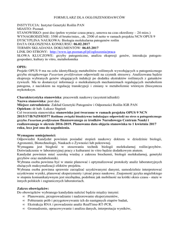 FORMULARZ DLA OGŁOSZENIODAWCÓW INSTYTUCJA: Instytut Genetyki Roślin PAN MIASTO: Poznań STANOWISKO: post doc (pełen wymiar czasu pracy, umowa na czas określony – 24 mies.) WYNAGRODZENIE: 3500 zł brutto/mies., ok. 2500 zł netto w ramach projektu NCN OPUS 9 DYSCYPLINA NAUKOWA: Biologia molekularna patogenów roślin DATA OGŁOSZENIA KONKURSU: 06.02.2017 TERMIN SKŁADANIA DOKUMENTÓW: 06.03.2017 LINK DO STRONY: http://www.igr.poznan.pl/pl/ogloszenia/praca SŁOWA KLUCZOWE: grzyby patogeniczne, analiza ekspresji genów, interakcja patogengospodarz, kultury in vitro, metabolomika OPIS: Projekt OPUS 9 ma na celu identyfikację metabolitów roślinnych wywołujących u patogenicznego grzyba strzępkowego Fusarium proliferatum odpowiedź na czynnik stresowy. Analizowana będzie ekspresja wybranych genów ulegających indukcji po dodatku ekstraktów roślinnych z gatunków żywiceli. Ma to dostarczyć informacji o molekularnych mechanizmach regulujących metabolizm patogena, z naciskiem na regulację transkrypcji i zmiany w metabolizmie wtórnym (biosynteza mykotoksyn. Charakterystyka stanowiska: pracownik naukowy (asystent/adiunkt) Nazwa stanowiska: post doc Miejsce zatrudnienia: Zakład Genetyki Patogenów i Odporności Roślin IGR PAN Opiekun: dr hab. Łukasz Stępień Cel tworzenia stanowiska: stanowisko jest tworzone w ramach projektu OPUS 9 NCN 2015/17/B/NZ9/03577 Roślinne związki bioaktywne indukujące odpowiedź na stres u patogenicznego grzyba Fusarium proliferatum finansowanego ze środków Narodowego Centrum Nauki i realizowanego w okresie 2016-2019. Planowana data objęcia stanowiska to 1 kwietnia 2017 roku, lecz jest ona do uzgodnienia. Wymagane umiejętności: Odpowiedni Kandydat powinien posiadać stopień naukowy doktora w dziedzinie biologii, Agronomii, Biotechnologii, Naukach o Żywności lub pokrewnej. Wymagana jest biegłość w stosowaniu technik biologii molekularnej roślin/grzybów. Doświadczenie w laboratoryjnej pracy z kulturami in vitro będzie dodatkowym atutem. Kandydat powinien mieć szeroką wiedzę z zakresu biochemii, biologii molekularnej, genetyki grzybów oraz metabolomiki. Wybrana osoba powinna być w stanie planować i optymalizować protokoły analiz laboratoryjnych służących maksymalizacji efektów projektu. Wybrana osoba powinna sprawnie zarządzać uzyskiwanymi danymi, samodzielnie interpretować uzyskiwane wyniki, planować eksperymenty i pisać prace naukowe. Znajomość języka angielskiego w stopniu komunikatywnym jest niezbędna, podobnie jak mobilność na krótki okres czasu - staże w innych polskich i zagranicznych laboratoriach. Zakres obowiązków: Do obowiązków wybranego kandydata należeć będzie między innymi: • Planowanie, przeprowadzanie i nadzorowanie eksperymentów, • Pobieranie prób i przygotowywanie ich do następnych etapów badań, • Ekstrakcja RNA i prowadzenie analiz RealTime-RT-PCR, • Gromadzenie, opracowywanie i analiza danych, interpretacja wyników, • Przygotowywanie artykułów i prezentowanie wyników na seminariach i konferencjach naukowych, • Nawiązywanie współprac krajowych i międzynarodowych, • Aktywne uczestniczenie w przedsięwzięciach organizowanych przez Zakład i Instytut. Wykaz dokumentów wymaganych od kandydata: 1. List motywacyjny przedstawiający wizję rozwoju naukowego kandydata i dokumentujący, że kandydat spełnia wymagania na to stanowisko 2. CV kandydata zawierające spis publikacji, udział w projektach, doniesienia konferencyjne oraz inne aktywności 3. Odpis dyplomu(ów) oraz szczegółowy wypis przedmiotów wraz z ocenami, 4. Autoreferat opisujący przebieg dotychczasowej pracy naukowej, 5. Nazwiska dwóch osób, które mogą wystawić referencje Dokumenty w formie elektronicznej [w jednym pliku pdf] proszę wysyłać na adres: [email protected] z kopią do [email protected] wpisując w tytule maila "Post doc OPUS 9". OSOBA UBIEGAJĄCA SIĘ O STANOWISKO PROSZONA JEST O ZAWARCIE W DOKUMENTACJI NASTĘPUJĄCEGO ZAPISU: „Ja niżej podpisany/a wyrażam zgodę na przetwarzanie moich danych osobowych zawartych w przesłanej dokumentacji konkursowej dla potrzeb niezbędnych w procesie rekrutacji, zgodnie z Ustawą o Ochronie Danych Osobowych z dnia 29.08.1997 (Dziennik Ustaw Rzeczypospolitej Polskiej z 2014 poz.1182 z późn. zm.)” Etapy konkursu: • zgłaszanie kandydatur – do 06 marca 2017 godz. 15:00; • wyłonienie najlepszych kandydatów przez Komisję konkursową, której kierownikiem jest kierownik Projektu; • rozmowa kwalifikacyjna i ocena wybranego kandydata przez Komisję Rady Naukowej IGR PAN ds. Rozwoju Kadry Naukowej; • decyzja Dyrektora IGR PAN. Termin rozstrzygnięcia konkursu i ogłoszenia wyników: Nie później niż jeden miesiąc od daty zamknięcia okresu nadsyłania zgłoszeń. Szczegółowe informacje: dr hab. Łukasz Stępień [email protected] +48 61 65 50 286 www.igr.poznan.pl