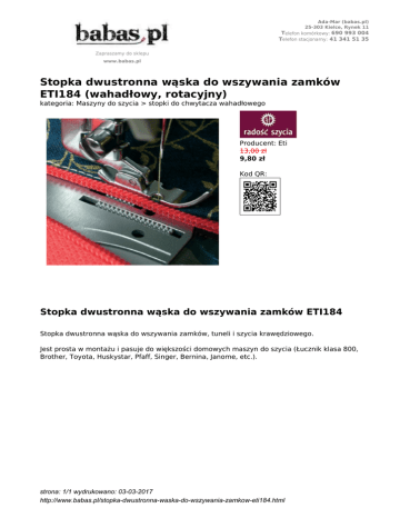 Ada-Mar (babas.pl) 25-303 Kielce, Rynek 11 Telefon komórkowy: 690 993 004 Telefon stacjonarny: 41 341 51 35 Zapraszamy do sklepu www.babas.pl Stopka dwustronna wąska do wszywania zamków ETI184 (wahadłowy, rotacyjny) kategoria: Maszyny do szycia > stopki do chwytacza wahadłowego Producent: Eti 13,00 zł 9,80 zł Kod QR: Stopka dwustronna wąska do wszywania zamków ETI184 Stopka dwustronna wąska do wszywania zamków, tuneli i szycia krawędziowego. Jest prosta w montażu i pasuje do większości domowych maszyn do szycia (Łucznik klasa 800, Brother, Toyota, Huskystar, Pfaff, Singer, Bernina, Janome, etc.). strona: 1/1 wydrukowano: 03-03-2017 http://www.babas.pl/stopka-dwustronna-waska-do-wszywania-zamkow-eti184.html