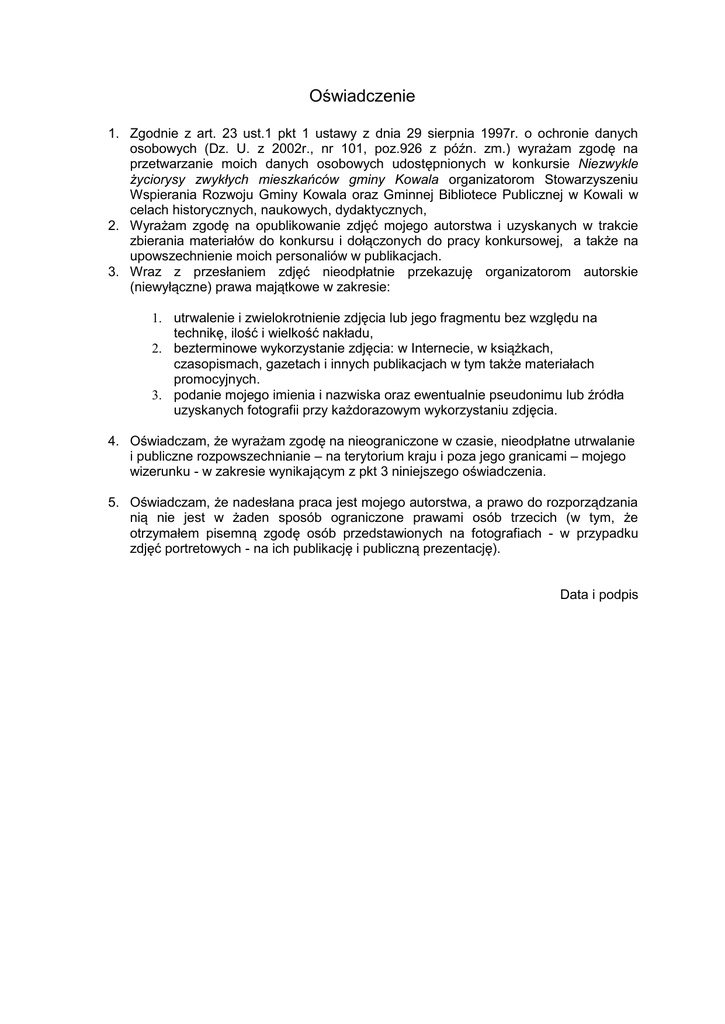 Oświadczenie 1. Zgodnie z art. 23 ust.1 pkt 1 ustawy z dnia 29 sierpnia 1997r. o ochronie danych osobowych (Dz. U. z 2002r., nr 101, poz.926 z późn. zm.) wyrażam zgodę na przetwarzanie moich danych osobowych udostępnionych w konkursie Niezwykle życiorysy zwykłych mieszkańców gminy Kowala organizatorom Stowarzyszeniu Wspierania Rozwoju Gminy Kowala oraz Gminnej Bibliotece Publicznej w Kowali w celach historycznych, naukowych, dydaktycznych, 2. Wyrażam zgodę na opublikowanie zdjęć mojego autorstwa i uzyskanych w trakcie zbierania materiałów do konkursu i dołączonych do pracy konkursowej, a także na upowszechnienie moich personaliów w publikacjach. 3. Wraz z przesłaniem zdjęć nieodpłatnie przekazuję organizatorom autorskie (niewyłączne) prawa majątkowe w zakresie: 1. utrwalenie i zwielokrotnienie zdjęcia lub jego fragmentu bez względu na technikę, ilość i wielkość nakładu, 2. bezterminowe wykorzystanie zdjęcia: w Internecie, w książkach, czasopismach, gazetach i innych publikacjach w tym także materiałach promocyjnych. 3. podanie mojego imienia i nazwiska oraz ewentualnie pseudonimu lub źródła uzyskanych fotografii przy każdorazowym wykorzystaniu zdjęcia. 4. Oświadczam, że wyrażam zgodę na nieograniczone w czasie, nieodpłatne utrwalanie i publiczne rozpowszechnianie – na terytorium kraju i poza jego granicami – mojego wizerunku - w zakresie wynikającym z pkt 3 niniejszego oświadczenia. 5. Oświadczam, że nadesłana praca jest mojego autorstwa, a prawo do rozporządzania nią nie jest w żaden sposób ograniczone prawami osób trzecich (w tym, że otrzymałem pisemną zgodę osób przedstawionych na fotografiach - w przypadku zdjęć portretowych - na ich publikację i publiczną prezentację). Data i podpis Oświadczenie 1. Zgodnie z art. 23 ust.1 pkt 1 ustawy z dnia 29 sierpnia 1997r. o ochronie danych osobowych (Dz. U. z 2002r., nr 101, poz.926 z późn. zm.) wyrażam zgodę na przetwarzanie moich danych osobowych przez Stowarzyszenie Wspierania Rozwoju Gminy Kowala oraz Gminną Bibliotekę Publiczną w Kowali. 2. Oświadczam, że udzielono mi informacji o celu i zakresie zbierania danych, o prawie dostępu do treści swoich danych oraz prawie ich poprawiania oraz uprawnieniach wynikających z art. 32 ust.1 pkt 7 i 8 ustawy o ochronie danych osobowych. 3. Wyrażam zgodę na wykorzystanie mojego wizerunku, utrwalonego podczas zbierania materiałów w ramach konkursu Niezwykle życiorysy zwykłych mieszkańców gminy Kowala. Zgoda, o której mowa w pkt 3, obejmuje: 1. dokonanie nagrania audio/video zapisu mojej relacji, 2. utrwalenie i zwielokrotnienie nagrania, jego fragmentu bez względu na technikę (np. techniką drukarską, reprograficzną, zapisu magnetycznego, cyfrową), ilość i wielkość nakładu, 3. bezterminowe wykorzystanie tej relacji i jej publikację w całości lub jej wybranych fragmentów, nadawanie drogą przewodową i bezprzewodową, wystawianie, odtworzenie, reemitowanie, publiczne udostępnianie w taki sposób, aby każdy mógł mieć do niej dostęp w miejscu i czasie przez siebie wybranym na następujących polach eksploatacji: w internecie, w książkach, czasopismach, gazetach i innych publikacjach w tym także materiałach promocyjnych, w telewizji, radio i innych dowolnych środkach masowego przekazu, wykorzystanie nagrania lub jego fragmentu do innego celu np. adaptowanie do wydawnictwa książkowego, artykułu prasowego, 4. obrót oryginałem albo egzemplarzami, na których nagranie utrwalono lub spisano, wprowadzenie do obrotu, najem, użyczenie oryginału albo egzemplarzy, 5. podanie mojego imienia i nazwiska oraz ewentualnie pseudonimu przy każdorazowym wykorzystaniu materiału lub jego fragmentu dotyczącego mojego życiorysu. 4. Oświadczam, że wyrażam zgodę na nieograniczone w czasie, nieodpłatne utrwalanie i publiczne rozpowszechnianie – na terytorium kraju i poza jego granicami – mojego wizerunku - w zakresie wynikającym z pkt 3 niniejszego oświadczenia. Imię Nazwisko Data urodzenia Adres zamieszkania Pseudonim lub imię (jeśli nie zgadza się Pan/Pani na archiwizację relacji pod własnym nazwiskiem) …………………………………. data i podpis