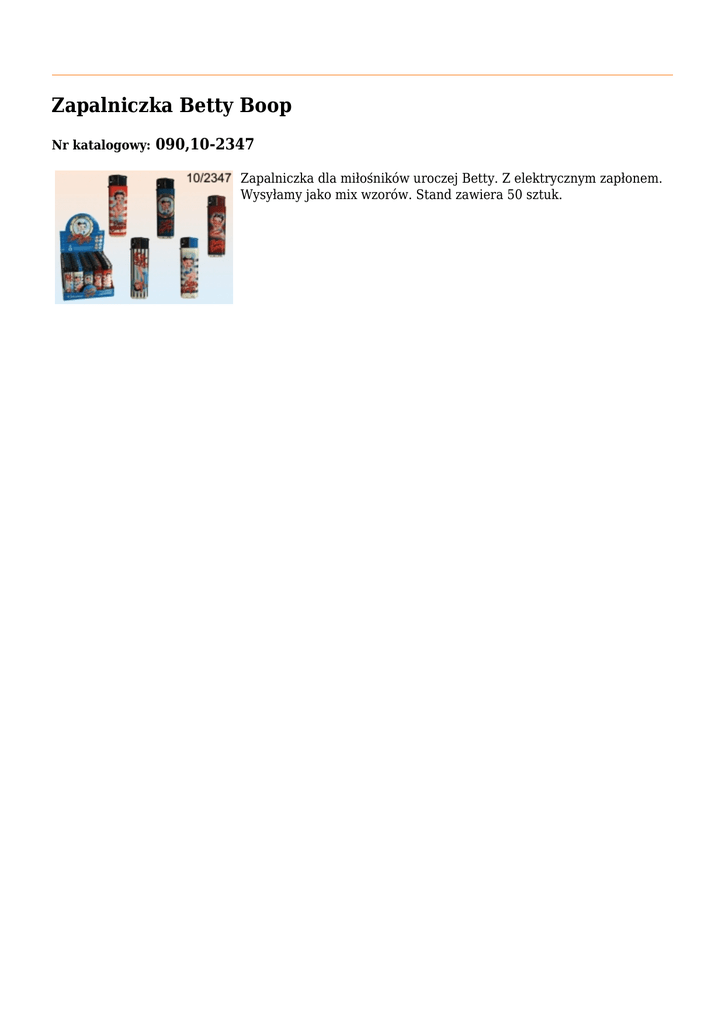 Zapalniczka Betty Boop Nr katalogowy: 090,10-2347 Zapalniczka dla miłośników uroczej Betty. Z elektrycznym zapłonem. Wysyłamy jako mix wzorów. Stand zawiera 50 sztuk.