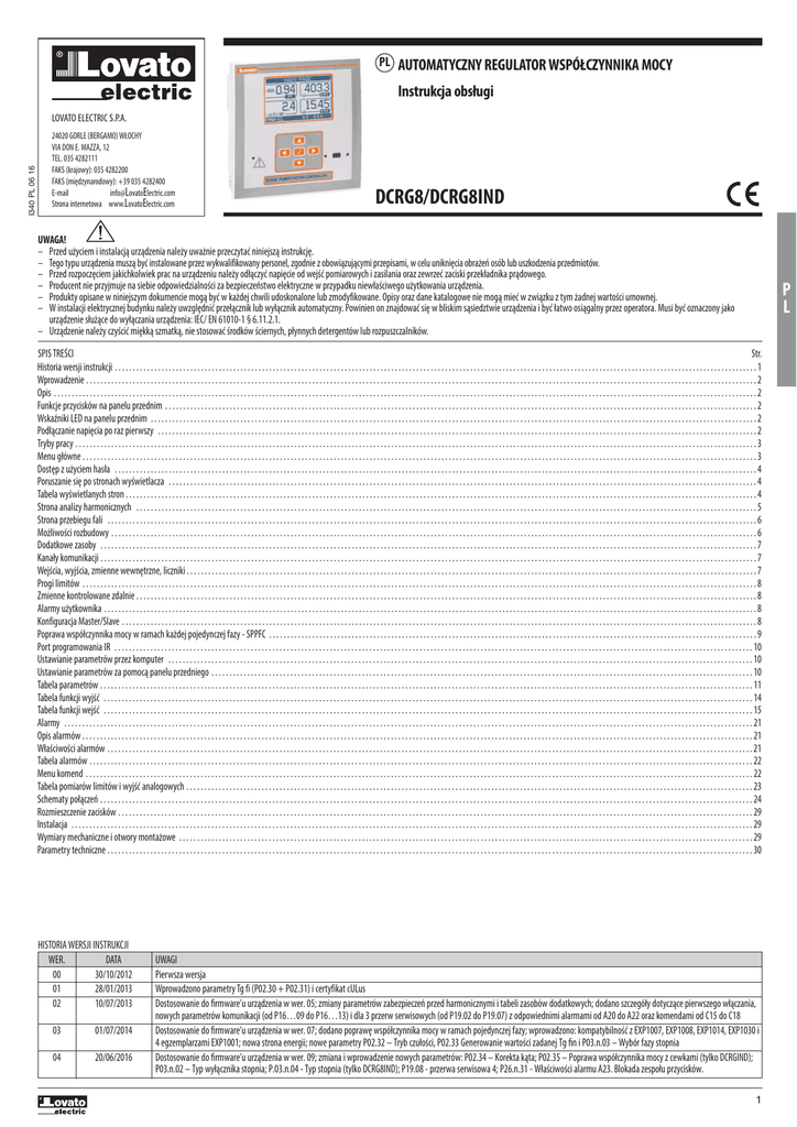 PL AUTOMATYCZNY REGULATOR WSPÓŁCZYNNIKA MOCY Instrukcja obsługi I340 PL 06 16 LOVATO ELECTRIC S.P.A. 24020 GORLE (BERGAMO) WŁOCHY VIA DON E. MAZZA, 12 TEL. 035 4282111 FAKS (krajowy): 035 4282200 FAKS (międzynarodowy): +39 035 4282400 E-mail [email protected] Strona internetowa www.LovatoElectric.com DCRG8/DCRG8IND UWAGA! – Przed użyciem i instalacją urządzenia należy uważnie przeczytać niniejszą instrukcję. – Tego typu urządzenia muszą być instalowane przez wykwalifikowany personel, zgodnie z obowiązującymi przepisami, w celu uniknięcia obrażeń osób lub uszkodzenia przedmiotów. – Przed rozpoczęciem jakichkolwiek prac na urządzeniu należy odłączyć napięcie od wejść pomiarowych i zasilania oraz zewrzeć zaciski przekładnika prądowego. – Producent nie przyjmuje na siebie odpowiedzialności za bezpieczeństwo elektryczne w przypadku niewłaściwego użytkowania urządzenia. – Produkty opisane w niniejszym dokumencie mogą być w każdej chwili udoskonalone lub zmodyfikowane. Opisy oraz dane katalogowe nie mogą mieć w związku z tym żadnej wartości umownej. – W instalacji elektrycznej budynku należy uwzględnić przełącznik lub wyłącznik automatyczny. Powinien on znajdować się w bliskim sąsiedztwie urządzenia i być łatwo osiągalny przez operatora. Musi być oznaczony jako urządzenie służące do wyłączania urządzenia: IEC/ EN 61010-1 § 6.11.2.1. – Urządzenie należy czyścić miękką szmatką, nie stosować środków ściernych, płynnych detergentów lub rozpuszczalników. P L SPIS TREŚCI Str. Historia wersji instrukcji . . . . . . . . . . . . . . . . . . . . . . . . . . . . . . . . . . . . . . . . . . . . . . . . . . . . . . . . . . . . . . . . . . . . . . . . . . . . . . . . . . . . . . . . . . . . . . . . . . . . . . . . . . . . . . . . . . . . . . . . . . . . . . . . . . . . . . . . . . . . . . . . . . . . . . . . . . . . . . . . . . . . . . . . . . . . . . . . . . . 1 Wprowadzenie . . . . . . . . . . . . . . . . . . . . . . . . . . . . . . . . . . . . . . . . . . . . . . . . . . . . . . . . . . . . . . . . . . . . . . . . . . . . . . . . . . . . . . . . . . . . . . . . . . . . . . . . . . . . . . . . . . . . . . . . . . . . . . . . . . . . . . . . . . . . . . . . . . . . . . . . . . . . . . . . . . . . . . . . . . . . . . . . . . . . . . . . . . . 2 Opis . . . . . . . . . . . . . . . . . . . . . . . . . . . . . . . . . . . . . . . . . . . . . . . . . . . . . . . . . . . . . . . . . . . . . . . . . . . . . . . . . . . . . . . . . . . . . . . . . . . . . . . . . . . . . . . . . . . . . . . . . . . . . . . . . . . . . . . . . . . . . . . . . . . . . . . . . . . . . . . . . . . . . . . . . . . . . . . . . . . . . . . . . . . . . . . . . . . . 2 Funkcje przycisków na panelu przednim . . . . . . . . . . . . . . . . . . . . . . . . . . . . . . . . . . . . . . . . . . . . . . . . . . . . . . . . . . . . . . . . . . . . . . . . . . . . . . . . . . . . . . . . . . . . . . . . . . . . . . . . . . . . . . . . . . . . . . . . . . . . . . . . . . . . . . . . . . . . . . . . . . . . . . . . . . . . . . . . . . . . . 2 Wskaźniki LED na panelu przednim . . . . . . . . . . . . . . . . . . . . . . . . . . . . . . . . . . . . . . . . . . . . . . . . . . . . . . . . . . . . . . . . . . . . . . . . . . . . . . . . . . . . . . . . . . . . . . . . . . . . . . . . . . . . . . . . . . . . . . . . . . . . . . . . . . . . . . . . . . . . . . . . . . . . . . . . . . . . . . . . . . . . . . . . . 2 Podłączanie napięcia po raz pierwszy . . . . . . . . . . . . . . . . . . . . . . . . . . . . . . . . . . . . . . . . . . . . . . . . . . . . . . . . . . . . . . . . . . . . . . . . . . . . . . . . . . . . . . . . . . . . . . . . . . . . . . . . . . . . . . . . . . . . . . . . . . . . . . . . . . . . . . . . . . . . . . . . . . . . . . . . . . . . . . . . . . . . . . . 2 Tryby pracy . . . . . . . . . . . . . . . . . . . . . . . . . . . . . . . . . . . . . . . . . . . . . . . . . . . . . . . . . . . . . . . . . . . . . . . . . . . . . . . . . . . . . . . . . . . . . . . . . . . . . . . . . . . . . . . . . . . . . . . . . . . . . . . . . . . . . . . . . . . . . . . . . . . . . . . . . . . . . . . . . . . . . . . . . . . . . . . . . . . . . . . . . . . . . . 3 Menu główne . . . . . . . . . . . . . . . . . . . . . . . . . . . . . . . . . . . . . . . . . . . . . . . . . . . . . . . . . . . . . . . . . . . . . . . . . . . . . . . . . . . . . . . . . . . . . . . . . . . . . . . . . . . . . . . . . . . . . . . . . . . . . . . . . . . . . . . . . . . . . . . . . . . . . . . . . . . . . . . . . . . . . . . . . . . . . . . . . . . . . . . . . . . . 3 Dostęp z użyciem hasła . . . . . . . . . . . . . . . . . . . . . . . . . . . . . . . . . . . . . . . . . . . . . . . . . . . . . . . . . . . . . . . . . . . . . . . . . . . . . . . . . . . . . . . . . . . . . . . . . . . . . . . . . . . . . . . . . . . . . . . . . . . . . . . . . . . . . . . . . . . . . . . . . . . . . . . . . . . . . . . . . . . . . . . . . . . . . . . . . . . 4 Poruszanie się po stronach wyświetlacza . . . . . . . . . . . . . . . . . . . . . . . . . . . . . . . . . . . . . . . . . . . . . . . . . . . . . . . . . . . . . . . . . . . . . . . . . . . . . . . . . . . . . . . . . . . . . . . . . . . . . . . . . . . . . . . . . . . . . . . . . . . . . . . . . . . . . . . . . . . . . . . . . . . . . . . . . . . . . . . . . . . . 4 Tabela wyświetlanych stron . . . . . . . . . . . . . . . . . . . . . . . . . . . . . . . . . . . . . . . . . . . . . . . . . . . . . . . . . . . . . . . . . . . . . . . . . . . . . . . . . . . . . . . . . . . . . . . . . . . . . . . . . . . . . . . . . . . . . . . . . . . . . . . . . . . . . . . . . . . . . . . . . . . . . . . . . . . . . . . . . . . . . . . . . . . . . . . . 4 Strona analizy harmonicznych . . . . . . . . . . . . . . . . . . . . . . . . . . . . . . . . . . . . . . . . . . . . . . . . . . . . . . . . . . . . . . . . . . . . . . . . . . . . . . . . 