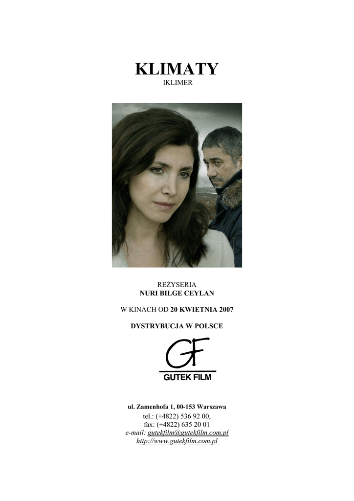KLIMATY IKLIMER REŻYSERIA NURI BILGE CEYLAN W KINACH OD 20 KWIETNIA 2007 DYSTRYBUCJA W POLSCE ul. Zamenhofa 1, 00-153 Warszawa tel.: (+4822) 536 92 00, fax: (+4822) 635 20 01 e-mail: [email protected] http://www.gutekfilm.com.pl reżyseria Nuri Bilge Ceylan scenariusz Nuri Bilge Ceylan zdjęcia Gökhan Tiryaki muzyka wykorzystano utwory Domenico Scarlattiego montaż Ayhan Ergürsel Nuri Bilge Ceylan dźwięk Ismail Karadaş występują Nuri Bilge Ceylan Isa Ebru Ceylan Bahar Nazan Kirilmis Serap Mehmet Eryilmaz Mehmed Arif Asçi Arif Can Ozbatur Gusen Ufuk Bayraktar taksówkarz Fatma Ceylan matka Isy Emin Ceylan ojciec Isy Semra Yilmaz Semra Ceren Olcay aktorka w serialu Abdullah Demirkubuz aktor w serialu Feridun Koc reżyser serialu Zafer Saka członek ekipy serialu producent Zeynep Özbatur koproducent Fabienne Vonier Cemal Noyan Nuri Bilge Ceylan producent wykonawczy Laurent Champoussin film wyprodukowany przez Pyramide Films Co Production Imaj NBC Film nagrody MFF Cannes 2006 – nagroda FIPRESCI MFF The South Oslo 2006 - nagroda FIPRESCI, nagroda Oslo Cinema MFF The World (Tajlandia) 2006 – nagroda za najlepsze zdjęcia Film Festival Bastia 2006 – Nagroda Specjalna Jury MFF Black Night 2006 – nagroda za najlepszą reżyserię, nagroda Don Quijote Euromed cinemas is financed by the European Union in the framework of the Euromed Audiovisual Programme Turcja / Francja rok produkcji: 2006 czas trwania: 97 minut kolor – Dolby – 1.95:1 Człowieka uszczęśliwiają rzeczy proste, a unieszczęśliwiają jeszcze prostsze. Tak, jak każdy rodzi się z prostego powodu i z jeszcze prostszego powodu umiera... Małżeństwo Isy i Bahar przechodzi kryzys. Te dwie samotne postaci poddają się najróżniejszym emocjom, przechodzą przez najróżniejsze klimaty. Szukają szczęścia, które już do nich nie należy. Nuri Bilge Ceylan Klimaty, intymna opowieść o rozpadzie pewnego związku, na ubiegłorocznym festiwalu filmowym w Cannes zebrała zachwycone opinie publiczności oraz mediów i została wyróżniona nagrodą FIPRESCI. Międzynarodowa krytyka była pod wrażeniem przenikliwości i autentyzmu, z jaką turecki reżyser, Nuri Bilge Ceylan, opowiada o uczuciach i stawiała go obok dwóch wielkich mistrzów emocji - Ingmara Bergmana i Michelangelo Antonioniego. Bohaterowie Klimatów znajdują się w bardzo bolesnym, ale też istotnym momencie wspólnego życia - tuż przed rozstaniem. Jesteśmy świadkami zmiennych „klimatów”, z których zbudowany był ich związek. Jest tu zniechęcenie, wypalenie, zazdrość, pożądanie i tęsknota – wszystko to ukazane praktycznie bez słów, wyłącznie poprzez obraz filmowy. Najciekawszą, ale i w jakiś sposób niepokojącą stroną Klimatów jest fakt, że to właśnie sam reżyser wraz ze swoją młodą żoną grają parę przeżywającą kryzys. Ceylan bawi się cienką granicą pomiędzy rzeczywistością i fikcją - film w dużej części zrealizowany jest w jego prywatnym mieszkaniu, pośród jego rodzinnych zdjęć. Jednak, jak mówi twórca, nie jest to po prostu film autobiograficzny. Ceylan, jak sam wyznaje, pragnął jedynie pokazać, że wydarzenia pokazane w filmie są niezwykle bliskie rzeczywistości i mogą stać się codziennością każdego związku.. Nuri Bilge Ceylan, już w swoich poprzednich filmach, szczególnie w obsypanym nagrodami Uzaku, udowodnił, że jak nikt potrafi mówić o samotności, również o samotności u boku bliskich. Klimaty stanowią intensywny, choć również bardzo subtelny portret egzystencjalnej alienacji i za pomocą obrazów dobitnie wyrażają to, co inni umieją powiedzieć jedynie za pośrednictwem słów. Film Ceylana zbliża się do naturalnego rytmu życia, znaczenia często wyrażane są poprzez ciszę, dygresje, czasem w krępujący sposób śmieszne, czasem - niezwykle wzruszające. Streszczenie Isa, nauczyciel uniwersytecki i Bahar, swego czasu jego studentka, a teraz telewizyjna scenograf, przeżywają kryzys ich związku. Podczas wakacji, które spędzają razem na południu Turcji, postanawiają się rozstać. Isa wraca sam do Istambułu i zaczyna się spotykać ze swoją dawną miłością – Serap. Ta pewnego dnia wyznaje, że słyszała, iż Bahar wyjechała do wschodniej Turcji. Isa jedzie za nią do ośnieżonej krainy i nieustannie śledzi ją na planie programu, nad którym pracuje. Kiedy byli kochankowie spotykają się, Bahar, nawet po paru drinkach, zachowuje się wobec Isy lekceważąco. Jednak kiedy mężczyzna podgląda dziewczynę z ukrycia, może zobaczyć jak ta wybucha histerycznym płaczem. Isa proponuje, aby zaczęli wszystko od nowa, ale Bahar odmawia. Isa, pozostawiony samemu sobie, błąka się po okolicy i fotografuje ruiny. Jednak w nocy Bahar zjawia się w jego pokoju - byli kochankowie znów leżą razem w jednym łóżku. Następnego ranka Isa leci do Istambułu, a Bahar wraca na plan filmowy. Prace ekipy zakłóca dźwięk samolotu ponad ich głowami. Nadmiar mnie zawstydza reżyser filmu Klimaty, Nuri Blige Ceylan, w rozmowie z Michelem Cimentem i Yannem Tobinem Zacznijmy od tytułu. Kiedy rozpoczyna Pan pracę nad filmem, ma Pan już pewien pomysł na tytuł? Tak naprawdę to nie. Ale przy Klimatach, ponieważ otrzymałem wsparcie Eurimages, po raz pierwszy musiałem znaleźć tytuł i złożyć scenariusz bardziej precyzyjny niż zwykle. Wymyśliłem tytuł w pięć minut i pomyślałem sobie, że wrócę do tego później. Ale nie wróciłem, bo ostatecznie to słowo bardzo mi się spodobało. Właściwie tytuł Klimaty pochodzi z powieści André Maurois, którą również bardzo lubię. To tytuł, który niezwykle pasuje nie tylko do tematu filmu, ale także do Pana zainteresowania fotografią. Tak, pociąga mnie zagadnienie atmosfery danej sytuacji, ale także przyrody, która nas otacza w danej sytuacji. Myślę, że umieszczenie postaci w pejzażach, w kontekście różnych pór roku nadaje historii nieco kosmicznego wymiaru. Poza ty