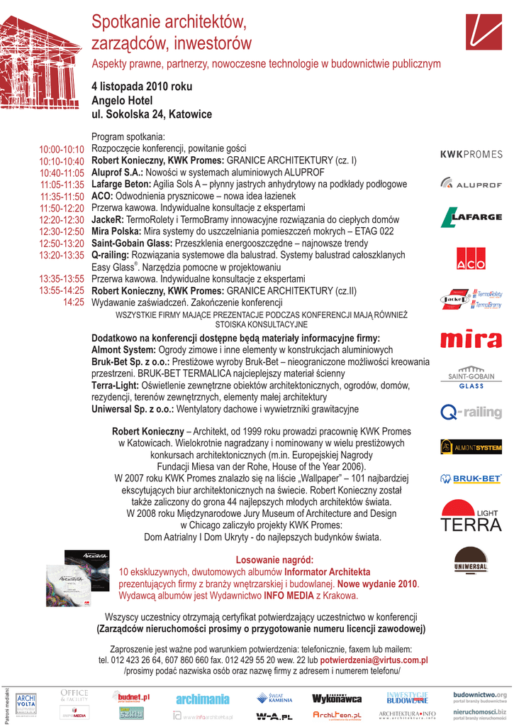 Spotkanie architektów, zarz¹dców, inwestorów Aspekty prawne, partnerzy, nowoczesne technologie w budownictwie publicznym 4 listopada 2010 roku Angelo Hotel ul. Sokolska 24, Katowice 10:00-10:10 10:10-10:40 10:40-11:05 11:05-11:35 11:35-11:50 11:50-12:20 12:20-12:30 12:30-12:50 12:50-13:20 13:20-13:35 13:35-13:55 13:55-14:25 14:25 Program spotkania: Rozpoczêcie konferencji, powitanie goœci Robert Konieczny, KWK Promes: GRANICE ARCHITEKTURY (cz. I) Aluprof S.A.: Nowoœci w systemach aluminiowych ALUPROF Lafarge Beton: Agilia Sols A – pùynny jastrych anhydrytowy na podk³ady pod³ogowe ACO: Odwodnienia prysznicowe – nowa idea ³azienek Przerwa kawowa. Indywidualne konsultacje z ekspertami JackeR: TermoRolety i TermoBramy innowacyjne rozwi¹zania do ciep³ych domów Mira Polska: Mira systemy do uszczelniania pomieszczeñ mokrych – ETAG 022 Saint-Gobain Glass: Przeszklenia energooszczædne – najnowsze trendy Q-railing: Rozwiàzania systemowe dla balustrad. Systemy balustrad ca³oszklanych ® Easy Glass . Narzêdzia pomocne w projektowaniu Przerwa kawowa. Indywidualne konsultacje z ekspertami Robert Konieczny, KWK Promes: GRANICE ARCHITEKTURY (cz.II) Wydawanie zaœwiadczeñ. Zakoñczenie konferencji WSZYSTKIE FIRMY MAJ¥CE PREZENTACJE PODCZAS KONFERENCJI MAJ¥ RÓWNIE¯ STOISKA KONSULTACYJNE Dodatkowo na konferencji dostêpne bêd¹ materia³y informacyjne firmy: Almont System: Ogrody zimowe i inne elementy w konstrukcjach aluminiowych Bruk-Bet Sp. z o.o.: Presti¿owe wyroby Bruk-Bet – nieograniczone mo¿liwoœci kreowania przestrzeni. BRUK-BET TERMALICA najcieplejszy materia³ œcienny Terra-Light: Oœwietlenie zewnêtrzne obiektów architektonicznych, ogrodów, domów, rezydencji, terenów zewnêtrznych, elementy ma³ej architektury Uniwersal Sp. z o.o.: Wentylatory dachowe i wywietrzniki grawitacyjne Robert Konieczny – Architekt, od 1999 roku prowadzi pracowniê KWK Promes w Katowicach. Wielokrotnie nagradzany i nominowany w wielu prestiýowych konkursach architektonicznych (m.in. Europejskiej Nagrody Fundacji Miesa van der Rohe, House of the Year 2006). W 2007 roku KWK Promes znalazùo siæ na liœcie „Wallpaper” – 101 najbardziej ekscytujàcych biur architektonicznych na œwiecie. Robert Konieczny zostaù takýe zaliczony do grona 44 najlepszych mùodych architektów œwiata. W 2008 roku Miædzynarodowe Jury Museum of Architecture and Design w Chicago zaliczyùo projekty KWK Promes: Dom Aatrialny I Dom Ukryty - do najlepszych budynków œwiata. Losowanie nagród: 10 ekskluzywnych, dwutomowych albumów Informator Architekta prezentujàcych firmy z bran¿y wnêtrzarskiej i budowlanej. Nowe wydanie 2010. Wydawc¹ albumów jest Wydawnictwo INFO MEDIA z Krakowa. Wszyscy uczestnicy otrzymaj¹ certyfikat potwierdzaj¹cy uczestnictwo w konferencji (Zarz¹dców nieruchomoœci prosimy o przygotowanie numeru licencji zawodowej) Patroni medialni: Zaproszenie jest wa¿ne pod warunkiem potwierdzenia: telefonicznie, faxem lub mailem: tel. 012 423 26 64, 607 860 660 fax. 012 429 55 20 wew. 22 lub [email protected] /prosimy podaæ nazwiska osób oraz nazwê firmy z adresem i numerem telefonu/