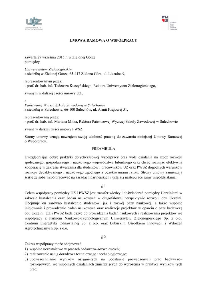 UMOWA RAMOWA O WSPÓŁPRACY zawarta 29 września 2015 r. w Zielonej Górze pomiędzy Uniwersytetem Zielonogórskim z siedzibą w Zielonej Górze, 65-417 Zielona Góra, ul. Licealna 9, reprezentowanym przez: - prof. dr. hab. inż. Tadeusza Kuczyńskiego, Rektora Uniwersytetu Zielonogórskiego, zwanym w dalszej części umowy UZ, a Państwową Wyższą Szkołą Zawodową w Sulechowie z siedzibą w Sulechowie, 66-100 Sulechów, ul. Armii Krajowej 51, reprezentowaną przez: - prof. dr. hab. inż. Mariana Miłka, Rektora Państwowej Wyższej Szkoły Zawodowej w Sulechowie zwaną w dalszej treści umowy PWSZ. Strony umowy uznają nawzajem swoją zdolność prawną do zawarcia niniejszej Umowy Ramowej o Współpracy. PREAMBUŁA Uwzględniając dobre praktyki dotychczasowej współpracy oraz wolę działania na rzecz rozwoju społecznego, gospodarczego i naukowego województwa lubuskiego oraz chcąc rozwijać efektywną kooperację w zakresie stwarzania dla studentów i pracowników UZ oraz PWSZ dogodnych warunków rozwoju dydaktycznego i naukowego zgodnego z oczekiwaniami rynku, Strony umowy zamierzają ściśle ze sobą współpracować na zasadach partnerskich i ustalają następujące ramy współdziałania: §1 Celem współpracy pomiędzy UZ i PWSZ jest transfer wiedzy i doświadczeń pomiędzy Uczelniami w zakresie kształcenia oraz badań naukowych w długofalowej perspektywie rozwoju obu Uczelni. Obejmuje on zarówno kształcenie studentów, jak i rozwój bazy naukowej, a także wspólne inicjowanie i prowadzenie badań naukowych oraz realizację projektów w oparciu o bazę badawczą obu Uczelni. UZ i PWSZ będą dążyć do prowadzenia badań naukowych i realizowania projektów we współpracy z Parkiem Naukowo-Technologicznym Uniwersytetu Zielonogórskiego Sp. z o.o., Centrum Energetyki Odnawialnej Sp. z o.o. oraz Lubuskim Ośrodkiem Innowacji i Wdrożeń Agrotechnicznych Sp. z o.o. §2 Zakres współpracy może obejmować: 1) wspólne uczestnictwo w pracach badawczo–rozwojowych; 2) realizowanie usług doradztwa technicznego i technologicznego; 3) upowszechnianie wyników osiągniętych na podstawie prowadzonych prac badawczo– rozwojowych, we wspólnych działaniach zmierzających do wdrożenia w praktyce wyników tych prac; 4) wzajemne wspieranie się w prowadzeniu zajęć dydaktycznych, prac dyplomowych, organizacji praktyk studenckich oraz w dostosowaniu programów kształcenia do realiów rynków pracy; 5) wspólne prowadzenie wybranych kierunków studiów; 6) organizację wspólnych szkoleń i specjalistycznych kursów oraz promocję kształcenia w zawodach związanych z potencjałem kadrowym i infrastrukturalnym obu Uczelni; 7) wzajemne wspieranie działalności wydawniczej prowadzonej w obu Uczelniach; 8) stwarzanie sprzyjających warunków do rozwoju współpracy w zakresie działalności kulturalnej, sportowej oraz każdej innej mającej na celu integrację środowisk akademickich obu Uczelni; 9) inne działania, których podjęcie będzie leżało we wspólnym interesie obu Stron. §3 1. UZ i PWSZ zobowiązują się do wzajemnego wspierania się w ramach swoich możliwości faktycznych i prawnych, w działaniach na rzecz rozwoju województwa lubuskiego oraz społeczności lokalnych. 2. PWSZ deklaruje propagowanie studiów II i III stopnia prowadzonych przez UZ, wykorzystując m. in. Biuletyn Informacyjny oraz materiały promocyjne PWSZ. 3. Szczegółowe ustalenia dotyczące zasad współpracy, obowiązków Stron umowy, praw własności intelektualnej oraz innych postanowień, które Strony uznają za istotne, zostaną uregulowane odrębnymi umowami dotyczącymi realizowania celów określonych niniejszą umową lub wykonywania konkretnych prac. §4 Niniejsza umowa nie pociąga za sobą zobowiązań finansowych dla żadnej ze Stron i nie może być podstawą jakichkolwiek roszczeń odszkodowawczych pomiędzy Stronami. §5 Umowa zostaje zawarta na czas nieokreślony. §6 Umowa wchodzi w życie z dniem podpisania. §7 1. Każda ze Stron ma prawo rozwiązań niniejszą umowę za uprzednim 3 – miesięcznym okresem wypowiedzenia. 2. Obie Strony mogą wspólnie rozwiązać umowę w każdym czasie. 3. Zmiany i uzupełnienia umowy wymagają zgody obu Stron oraz formy pisemnej pod rygorem nieważności. §8 Umowa została sporządzona w 4 egzemplarzach, po 2 egz. dla każdej ze Stron. W imieniu Uniwersytetu Zielonogórskiego: W imieniu Państwowej Wyższej Szkoły Zawodowej w Sulechowie ………………………………………………. ……………………………………………….. Zielona Góra, dnia …………………………. Zielona Góra, dnia …………………………...