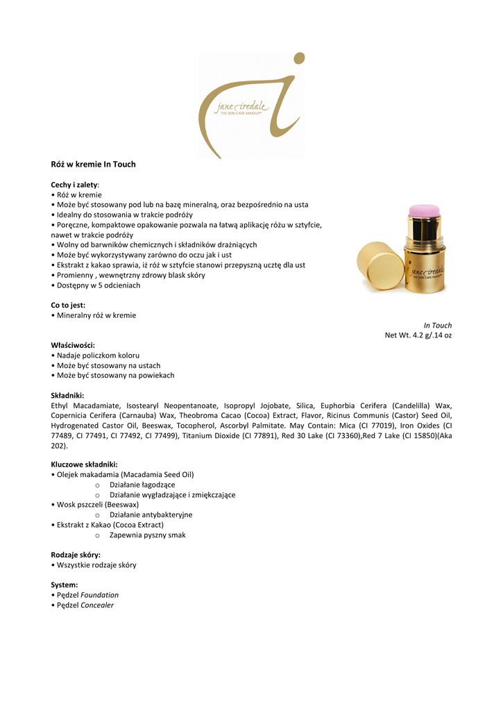 Róż w kremie In Touch Cechy i zalety: • Róż w kremie • Może być stosowany pod lub na bazę mineralną, oraz bezpośrednio na usta • Idealny do stosowania w trakcie podróży • Poręczne, kompaktowe opakowanie pozwala na łatwą aplikację różu w sztyfcie, nawet w trakcie podróży • Wolny od barwników chemicznych i składników drażniących • Może być wykorzystywany zarówno do oczu jak i ust • Ekstrakt z kakao sprawia, iż róż w sztyfcie stanowi przepyszną ucztę dla ust • Promienny , wewnętrzny zdrowy blask skóry • Dostępny w 5 odcieniach Co to jest: • Mineralny róż w kremie In Touch Net Wt. 4.2 g/.14 oz Właściwości: • Nadaje policzkom koloru • Może być stosowany na ustach • Może być stosowany na powiekach Składniki: Ethyl Macadamiate, Isostearyl Neopentanoate, Isopropyl Jojobate, Silica, Euphorbia Cerifera (Candelilla) Wax, Copernicia Cerifera (Carnauba) Wax, Theobroma Cacao (Cocoa) Extract, Flavor, Ricinus Communis (Castor) Seed Oil, Hydrogenated Castor Oil, Beeswax, Tocopherol, Ascorbyl Palmitate. May Contain: Mica (CI 77019), Iron Oxides (CI 77489, CI 77491, CI 77492, CI 77499), Titanium Dioxide (CI 77891), Red 30 Lake (CI 73360),Red 7 Lake (CI 15850)(Aka 202). Kluczowe składniki: • Olejek makadamia (Macadamia Seed Oil) o Działanie łagodzące o Działanie wygładzające i zmiękczające • Wosk pszczeli (Beeswax) o Działanie antybakteryjne • Ekstrakt z Kakao (Cocoa Extract) o Zapewnia pyszny smak Rodzaje skóry: • Wszystkie rodzaje skóry System: • Pędzel Foundation • Pędzel Concealer Zalecane przygotowanie • Nanieś róż na oczyszczona skórę twarzy pod puder sypki Amazing Base lub puder prasowany PurePressed Base, aby stworzyć matowe wykończenie makijażu • Nanieś róż na puder sypki Amazing Base lub puder prasowany PurePressed Base, dla efektu „mokrych policzków” Aplikacja: 1.Odkręć nakrętkę od produktu, a następnie przy pomocy szpatułki nabierz niewielką ilość produktu 1. Delikatnie, pędzlem Foundation, pobierz produkt ze szpatułki 2. Połóż pędzel na kości policzkowej, a następnie rozetrzyj róż w kierunku ucha. Powróć do punktu początkowego i powtórz tą samą czynność, aż do osiągnięcia wymaganego efektu. 3. Powtórz powyższą czynność na drugim policzku • W użytku domowym , pędzel może byś stosowany bezpośrednio na produkt Wskazówki Zastosuj róż pod wybrana bazę mineralną, aby uzyskać miękkie, naturalne wykończenie makijażu. Połącz róż In Touch z różem a PurePressed Blush, aby uzyskać bardziej spektakularny efekt.