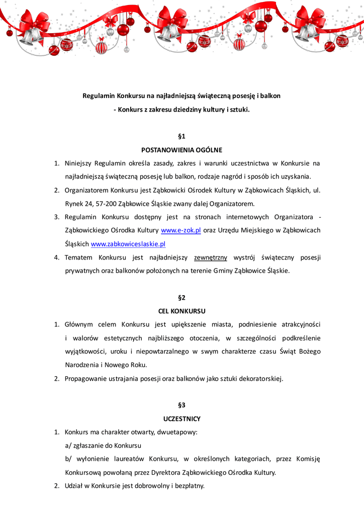 Regulamin Konkursu na najładniejszą świąteczną posesję i balkon - Konkurs z zakresu dziedziny kultury i sztuki. §1 POSTANOWIENIA OGÓLNE 1. Niniejszy Regulamin określa zasady, zakres i warunki uczestnictwa w Konkursie na najładniejszą świąteczną posesję lub balkon, rodzaje nagród i sposób ich uzyskania. 2. Organizatorem Konkursu jest Ząbkowicki Ośrodek Kultury w Ząbkowicach Śląskich, ul. Rynek 24, 57-200 Ząbkowice Śląskie zwany dalej Organizatorem. 3. Regulamin Konkursu dostępny jest na stronach internetowych Organizatora Ząbkowickiego Ośrodka Kultury www.e-zok.pl oraz Urzędu Miejskiego w Ząbkowicach Śląskich www.zabkowiceslaskie.pl 4. Tematem Konkursu jest najładniejszy zewnętrzny wystrój świąteczny posesji prywatnych oraz balkonów położonych na terenie Gminy Ząbkowice Śląskie. §2 CEL KONKURSU 1. Głównym celem Konkursu jest upiększenie miasta, podniesienie atrakcyjności i walorów estetycznych najbliższego otoczenia, w szczególności podkreślenie wyjątkowości, uroku i niepowtarzalnego w swym charakterze czasu Świąt Bożego Narodzenia i Nowego Roku. 2. Propagowanie ustrajania posesji oraz balkonów jako sztuki dekoratorskiej. §3 UCZESTNICY 1. Konkurs ma charakter otwarty, dwuetapowy: a/ zgłaszanie do Konkursu b/ wyłonienie laureatów Konkursu, w określonych kategoriach, przez Komisję Konkursową powołaną przez Dyrektora Ząbkowickiego Ośrodka Kultury. 2. Udział w Konkursie jest dobrowolny i bezpłatny. 3. Konkurs odbędzie się w dwóch kategoriach: I. posesje prywatne II. balkony 4. Uczestnikiem Konkursu może byd wyłącznie osoba władająca posesją lub balkonem znajdującym się na terenie Gminy Ząbkowice Śląskie z wyłączeniem pracowników Organizatora wraz z członkami ich rodziny. §4 ZGŁOSZENIA 1. Deklaracja udziału w Konkursie następuje poprzez dostarczenie Formularza Zgłoszeniowego (wg wzoru stanowiącego załącznik Nr 1 do niniejszego regulaminu), która powinna zawierad imię i nazwisko władającego, adres posesji lub balkonu, telefon kontaktowy. 2. Do Formularza Zgłoszeniowego należy dołączyd zdjęcie przystrojonej posesji lub balkonu, wykonane w czasie przed Świętami Bożego Narodzenia tj. w listopadzie lub grudniu 2015r. Zdjęcie posesji/balkonu może byd wykonane dowolną techniką. Na podstawie przeglądu zdjęd Komisja Konkursowa dokona wstępnej oceny. 3. Wyżej wymienione dokumenty można dostarczyd osobiście, pocztą zwykłą lub za pośrednictwem Internetu na adres: Ząbkowicki Ośrodek Kultury w Ząbkowicach Śląskich ul. Rynek 24; 57- 200 Ząbkowice Śląskie adres e- mail: [email protected] z dopiskiem: “Konkurs na najładniejszą świąteczną posesję i balkon”. 4. Wzór Formularza Zgłoszeniowego uprawniającego do wzięcia udziału w przedmiotowym Konkursie (wg wzoru stanowiącego załącznik Nr 1 do niniejs zego regulaminu) dostępny jest: w Ząbkowickim Ośrodku Kultury na stronie internetowej www.e-zok.pl oraz www.zabkowiceslaskie.pl. 5. Dodatkowe wyjaśnienia w sprawie Konkursu można uzyskad w Ząbkowickim Ośrodku Kultury w Ząbkowicach Śląskich pod numerem telefon: 74 8 152 896. 6. Wystrój i dekoracje mogą byd wykonane dowolną techniką przy użyciu dowolnych materiałów. 7. Do Konkursu można zgłaszad projekty własnego autorstwa. 8. Właściciel lub użytkownik nieruchomości składając zgłoszenie do Konkursu (wg wzoru stanowiącego załącznik Nr 1 do niniejszego regulaminu) akceptuje jego warunki i wyraża zgodę na przetwarzanie danych osobowych do celów konkursowych. 9. Organizator Konkursu zastrzega sobie prawo do nie rozpatrywania zgłoszeo, które wpłyną do Ząbkowickiego Ośrodka Kultury po terminie wskazanym w niniejszym regulaminie. 10. Zgłoszenie do Konkursu jest równoznaczne z wyrażeniem zgody na oględziny zgłaszanego wystroju świątecznego posesji lub balkonu. 11. Ostateczny termin przyjmowania zgłoszeo mija z dniem 31 grudnia 2015 roku. §6 KOMISJA KONKURSOWA I OCENA ŚWIĄTECZNYCH WYSTROJÓW 1. Oceny dokona 3-osobowa Komisja Konkursowa, powołana przez Dyrektora Ząbkowickiego Ośrodka Kultury. 2. Komisja Konkursowa dokona indywidualnej oceny na karcie, która stanowi załącznik Nr 2 do niniejszego regulaminu. Przyjmuje się skalę ocen od 1 do 10 punktów. Ocena ostateczna jest wyliczoną średnią arytmetyczną ocen punktowych poszczególnych Członków Komisji. Przewodniczącego W przypadku równej Komisji, a w przypadku ilości jego punktów decyduje głos nieobecności Z-cy głos Przewodniczącego. 3. W trakcie oceny będą brane pod uwagę następujące kryteria: oryginalnośd i pomysł na wystrój świąteczny iluminacje nawiązanie do tradycji świąteczno-noworocznej ogólny wygląd estetyczny widocznośd dekoracji z zewnątrz 4. Komisja Konkursowa dokonana oceny i przeglądu zgłoszeo konkursowych na podstawie przesłanych zdjęd oraz ewentualnych oględzin wystroju. §6 ROZSTRZYGNIĘCIE KONKURSU I NAGRODY 1. W każdej kategorii przyznane zostaną nagrody rzeczowe o następujących wartościach: Kategoria posesja prywatna: I miejsce: nagroda rzeczowa o wartości do 300 zł II miejsce: nagroda rzeczowa o wartości do 200 zł III miejsce: nagroda rzeczowa o wartości do 100 zł Kategoria balkon: I miejsce: nagroda rzeczowa o wartości do 300 zł II miejsce: nagroda rzeczowa o wartości do 200 zł III miejsce: nagroda rzeczowa o wartości do 100 zł 2. Przewiduje się możliwośd przyznania wyróżnieo w poszczególnych kategoriach, o wartości i rodzaju nagród przyznanych za wyróżnienia zdecyduje Komisja Konkursowa. 3. Komisja Konkursowa może dokonad innego podziału nagród niż określone w §6 ust. 1 w przypadku gdy w danej kategorii nie wpłynie żadne zgłoszenie. 4. Nagrody w Konkursie nie można zamienid na inną nagrodę, ani na ekwiwalent pieniężny. Organizator nie ponosi odpowiedzialności z tytułu rękojmi za wady nagrody ani nie udziela gwarancji jej jakości. Wszelkie reklamacje dotyczące nagrody należ