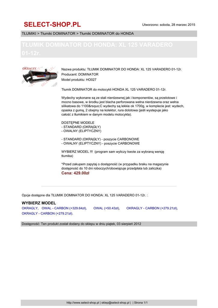 SELECT-SHOP.PL Utworzono: sobota, 28 marzec 2015 TŁUMIKI > Tłumiki DOMINATOR > Tłumiki DOMINATOR do HONDA TŁUMIK DOMINATOR DO HONDA: XL 125 VARADERO 01-12r. Nazwa produktu: TŁUMIK DOMINATOR DO HONDA: XL 125 VARADERO 01-12r. Producent: DOMINATOR Model produktu: HO027 Tłumik DOMINATOR do motocykli HONDA XL 125 VARADERO 01-12r. Wydechy wykonane są ze stali nierdzewnej jak i komponentów, są przelotowe i mocno basowe, w środku jest blacha perforowana wełna nierdzewna oraz wełna silikatowa do 1100’C wydechy są lekkie ok 1700g, w komplecie jest: wydech, opaska z gumą, 2 obejmy na kolektor, rura dolotowa (jeśli wystepuje jako całość z tłumikiem w danym modelu motocykla). DOSTĘPNE MODELE - STANDARD (OKRĄGŁY) - OWALNY (ELIPTYCZNY) - STANDARD (OKRĄGŁY) - poszycie CARBONOWE - OWALNY (ELIPTYCZNY) - poszycie CARBONOWE WYBIERZ MODEL !!! (program sam wyliczy kwote za wybraną wersję tłumika) *Przed zakupem zapytaj o dostępność (w przypadku braku na magazynie dostępność do 10 dni roboczych/obowiązuje przedpłata lub zaliczka) Cena: 429.00zł Opcje dostępne dla TŁUMIK DOMINATOR DO HONDA: XL 125 VARADERO 01-12r. : WYBIERZ MODEL OKRAGLY, OWAL - CARBON (+329.64zł), OWAL (+50.43zł), OKRAGLY - CARBON (+279.21zł), OKRAGLY - CARBON (+279.21zł). Dostępność: Ten produkt został dodany do sklepu w dniu piątek, 03 sierpień 2012 http://www.select-shop.pl | [email protected] | | Strona 1/1