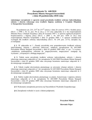 Zarządzenie Nr 448/2010 Prezydenta Miasta Stargard Szczeciński z dnia 20 października 2010 roku zmieniające zarządzenie w sprawie zasad przydziału środków ochrony indywidualnej, odzieży i obuwia roboczego oraz środków higieny osobistej w Urzędzie Miejskim w Stargardzie Szczecińskim Na podstawie art. 233, 2376 do 23710 ustawy z dnia 26 czerwca 1974 r. Kodeks pracy (Dz.U. z 1998 r. Nr 21, poz. 94 ze zm.), § 115 oraz załącznika nr 2 do rozporządzenia Ministra Pracy i Polityki Socjalnej z dnia 26 września 1997 r. w sprawie ogólnych przepisów bezpieczeństwa i higieny pracy (Dz.U. z 2003 r. Nr 169 poz. 1650 ze zm.) oraz rozporządzenia Ministra Gospodarki z dnia 21 grudnia 2005 r. w sprawie zasadniczych wymagań dla środków ochrony indywidualnej (Dz.U. Nr 259, poz. 2173), zarządza się, co następuje: § 1. W załączniku nr 1 „Zasady przydziału oraz gospodarowania środkami ochrony indywidualnej, odzieżą i obuwiem roboczym” nadanym zarządzeniem Nr 445/2009 Prezydenta Miasta Stargard Szczeciński z dnia 03 grudnia 2009 roku” w ust. 7 d wyrazy: „inspektora, podinspektora, referenta ds. magazynowania, magazyniera” zastępuje się wyrazami: „związanych z obsługą magazynu”. § 2. Tabela norm przydziału środków ochrony indywidualnej, odzieży i obuwia roboczego stanowiąca załącznik nr 2 do zarządzenia Nr 445/2009 Prezydenta Miasta Stargard Szczeciński z dnia 03 grudnia 2009 roku otrzymuje brzmienie stanowiące załącznik nr 1 do niniejszego zarządzenia. § 3. Tabela wypłat ekwiwalentu pieniężnego za używanie własnej odzieży i obuwia roboczego stanowiąca załącznik nr 3 do zarządzenia Nr 445/2009 Prezydenta Miasta Stargard Szczeciński z dnia 03 grudnia 2009 roku otrzymuje brzmienie stanowiące załącznik nr 2 do niniejszego zarządzenia § 4. Tabela wypłat ekwiwalentu pieniężnego za pranie, konserwację i naprawę odzieży stanowiąca załącznik nr 4 do zarządzenia Nr 445/2009 Prezydenta Miasta Stargard Szczeciński z dnia 03 grudnia 2009 roku otrzymuje brzmienie stanowiące załącznik nr 3 do niniejszego zarządzenia § 5. Wykonanie zarządzenia powierza się Naczelnikowi Wydziału Gospodarczego. § 6. Zarządzenie wchodzi w życie z dniem podpisania. Prezydent Miasta Sławomir Pajor UZASADNIENIE: W związku ze zmianą organizacyjną zaistniałą w Wydziale Zarządzania Kryzysowego i Spraw Obronnych Urzędu Miejskiego polegającą na powierzeniu obsługi magazynu jednemu z pracowników tego wydziału należało wprowadzić zmiany, aby pracownik otrzymał prawo do przydziału odzieży roboczej i środków ochrony indywidualnej. Przydzielono również kurtki ocieplane osobom zatrudnionym na stanowisku goniec. Załącznik nr 1 do Zarządzenia Nr 448/2010 Prezydenta Miasta Stargard Szczeciński z dnia…………………………………… TABELA NORM PRZYDZIAŁU ŚRODKÓW OCHRONY INDYWIDUALNEJ, ODZIEŻY I OBUWIA ROBOCZEGO L.p. Stanowisko pracy Zakres wyposażenia R – odzież i obuwie robocze O – środki ochrony indywidualnej Przewidywany okres używalności R – fartuch drelichowy O – rękawice ochronne R – ubranie drelichowe R – koszula flanelowa R – kurtka ocieplana R – kurtka przeciwdeszczowa R – obuwie skórzano - gumowe R – czapka O – rękawice ochronne O – półmaska (w razie potrzeby) O – gogle R – fartuch roboczy R – trzewiki profilaktyczne O – rękawice ochronne 36 m-cy do zużycia 12 m-cy 12 m-cy 3 okresy zimowe 36 m-cy 12 m-cy 12 m-cy do zużycia do zużycia do zużycia 12 m-cy 6 m-cy do zużycia 1. Kierowca samochodu osobowego 2. Pracownik gospodarczy - konserwator 3. Pracownik gospodarczy – sprzątaczka 4. Stanowisko związane z obsługą magazynu R – fartuch drelichowy O – rękawice ochronne 36 m-cy do zużycia 5. Goniec R – obuwie skórzano - gumowe R – kurtka przeciwdeszczowa R – kurtka ocieplana R – czapka 12 m-cy 36 m-cy 2 okresy zimowe 12 m-cy 6. Pracownicy - pełniący obowiązki inspektora nadzoru na budowie lub nadzorujący roboty wykonywane przez zleceniobiorców, na podstawie umów o obsługę remontową i eksploatacyjną oraz pełniących nadzór nad przestrzeganiem przepisów o ochronie środowiska. Skonsultowano z zakładową organizacją związkową data podpis R – fartuch drelichowy R – obuwie skórzano – gumowe R – kurtka ocieplana R – kurtka przeciwdeszczowa O – kask ochronny O – kamizelka ostrzegawcza 36 m-cy 24 m-ce 4 okresy zimowe 48 m-cy do zużycia do zużycia Załącznik nr 2 do Zarządzenia Nr 448/2010 Prezydenta Miasta Stargard Szczeciński z dnia ……………………….. TABELA WYPŁAT EKWIWALENTU PIENIĘŻNEGO ZA UŻYWANIE WŁASNEJ ODZIEŻY I OBUWIA ROBOCZEGO Lp. Stanowisko Rodzaj odzieży/obuwia Okres użytkowania Cena odzieży/obuwia (zł) Kwota rocznego ekwiwalentu (zł) 1. Kierowca samochodu osobowego fartuch drelichowy 36 m-cy 60,00 20,00 2. Stanowisko związane z obsługą magazynu fartuch drelichowy 36 m-cy 60,00 20,00 obuwie skórzano - gumowe 12 m-cy 100,00 100,00 kurtka przeciwdeszczowa 36 m-cy 60,00 20,00 czapka 12 m-cy 20,00 20,00 fartuch drelichowy 36 m-cy 60,00 20,00 obuwie skórzano – gumowe 24 m-ce 100,00 50,00 4 okresy zimowe 100,00 25,00 48 m-cy 60,00 15,00 3. 4. Goniec Pracownicy - pełniący obowiązki inspektora nadzoru na budowie lub nadzorujący roboty wykonywane przez zleceniobiorców, na podstawie umów o obsługę remontową i eksploatacyjną oraz pełniących nadzór nad przestrzeganiem przepisów o ochronie środowiska. kurtka ocieplana kurtka przeciwdeszczowa Załącznik nr 3 do Zarządzenia Nr 448/2010 Prezydenta Miasta Stargard Szczeciński z dnia ……………………… TABELA WYPŁAT EKWIWALENTU PIENIĘŻNEGO ZA PRANIE, KONSERWACJĘ I NAPRAWĘ ODZIEŻY ROBOCZEJ Kwota ekwiwalentu (zł) L.p. 1. 2. Stanowisko pracy Kierowca samochodu osobowego Pracownik gospodarczy - konserwator Rodzaj odzieży miesięcznie rocznie fartuch drelichowy 4,50 54,00 ubranie drelichowe 5,00 60,00 koszula flanelo