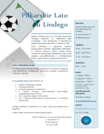 Piłkarskie Lato u Lindego Szkoła Podstawowa im. Samuela Bogumiła Lindego zaprasza na „Piłkarskie Lato u Lindego”, czyli atrakcyjne 3 tygodniowe zajęcia sportowe dla dzieci w wieku 6-9 lat. Przez pierwsze 3 tygodnie wakacji proponujemy Państwu piłkarskie półkolonie, w trakcie których dzieci będą miały możliwość aktywnego spędzenia czasu pod opieką wykwalifikowanej i profesjonalnej kadry. Super zabawa gwarantowana! MIEJSCE: Szkoła Podstawowa im. Samuela Bogumiła Lindego ul. Jana Rosoła 10 02-786 Warszawa TERMINY: 27.06. – 01.07.2016 04.07 – 08.07.2016 11.07 – 15.07.2016 GODZINY: OPIS I PROGRAM ZAJĘĆ 8:30 – 17:00 W trakcie zajęć piłkarze będą podejmować sportowe działania oraz kształtować umiejętności społeczne poprzez współpracę i zabawę w grupie. KOSZT: 1 tydzień = 500 zł* 2 tygodnie = 950 zł* W programie zajęć przewidziane są: 3 tygodnie = 1400 zł* zabawy integrujące grupę, 2 treningi dziennie, wykłady taktyczne, żywieniowe, w trakcie treningu wprowadzanie fachowego, angielskiego nazewnictwa, raz w tygodniu zajęcia na basenie, raz w tygodniu planowana wycieczka (m.in. na Stadion Narodowy). Istnieje możliwość uczestnictwa w całym cyklu lub pojedynczym tygodniu. Liczba miejsc ograniczona (obowiązują zapisy) Szkoła Podstawowa im. Samuela Bogumiła Lindego ul. Jana Rosoła 10 02-786 Warszawa Tel. 572 713 508 *dla dzieci uczęszczających do placówek ETO przewidziana zniżka KOORDYNATOR PROJEKTU: Wojciech Molęda [email protected] ZAPISY: [email protected] tel. 572 713 508 MIEJSCE: Szkoła Podstawowa im. Samuela Bogumiła Lindego ul. Jana Rosoła 10 RAMOWY PLAN ZAJĘĆ 02-786 Warszawa 8.30-9.00 przyprowadzanie piłkarzy, TERMINY: 9.00-9.30 27.06. – 01.07.2016 śniadanie 04.07 – 08.07.2016 9.30-10.30 11.07 – 15.07.2016 trening (szkoła techniki) 10.30-10:45 GODZINY: drugie śniadanie 8:30 – 17:00 10:45-13.00 gry i zabawy ruchowe na świeżym powietrzu, wykłady taktyczne, żywieniowe 1 tydzień = 500 zł* 2 tygodnie = 950 zł* 13.00-14.00 3 tygodnie = 1400 zł* przerwa obiadowa *dla dzieci uczęszczających do placówek ETO przewidziana zniżka 14.00-15.30 basen, wycieczki, zabawy integracyjne 15.30-16.00 KOORDYNATOR PROJEKTU: Wojciech Molęda podwieczorek [email protected] 16.00-17.00 ZAPISY: sesja treningowa 17.00 KOSZT: [email protected] odbiór piłkarzy tel. 572 713 508 Szkoła Podstawowa im. Samuela Bogumiła Lindego ul. Jana Rosoła 10 02-786 Warszawa Tel. 572 713 508