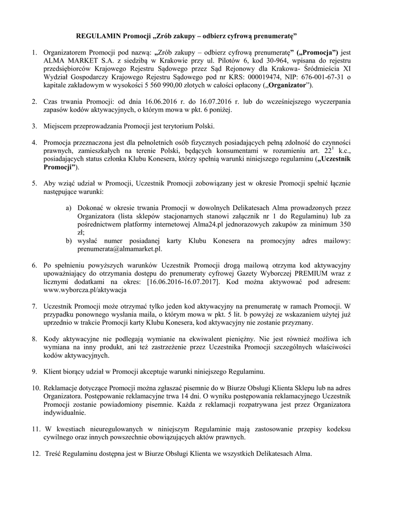 REGULAMIN Promocji „Zrób zakupy – odbierz cyfrową prenumeratę” 1. Organizatorem Promocji pod nazwą: „Zrób zakupy – odbierz cyfrową prenumeratę” („Promocja”) jest ALMA MARKET S.A. z siedzibą w Krakowie przy ul. Pilotów 6, kod 30-964, wpisana do rejestru przedsiębiorców Krajowego Rejestru Sądowego przez Sąd Rejonowy dla Krakowa- Śródmieścia XI Wydział Gospodarczy Krajowego Rejestru Sądowego pod nr KRS: 000019474, NIP: 676-001-67-31 o kapitale zakładowym w wysokości 5 560 990,00 złotych w całości opłacony („Organizator”). 2. Czas trwania Promocji: od dnia 16.06.2016 r. do 16.07.2016 r. lub do wcześniejszego wyczerpania zapasów kodów aktywacyjnych, o którym mowa w pkt. 6 poniżej. 3. Miejscem przeprowadzania Promocji jest terytorium Polski. 4. Promocja przeznaczona jest dla pełnoletnich osób fizycznych posiadających pełną zdolność do czynności prawnych, zamieszkałych na terenie Polski, będących konsumentami w rozumieniu art. 221 k.c., posiadających status członka Klubu Konesera, którzy spełnią warunki niniejszego regulaminu („Uczestnik Promocji”). 5. Aby wziąć udział w Promocji, Uczestnik Promocji zobowiązany jest w okresie Promocji spełnić łącznie następujące warunki: a) Dokonać w okresie trwania Promocji w dowolnych Delikatesach Alma prowadzonych przez Organizatora (lista sklepów stacjonarnych stanowi załącznik nr 1 do Regulaminu) lub za pośrednictwem platformy internetowej Alma24.pl jednorazowych zakupów za minimum 350 zł; b) wysłać numer posiadanej karty Klubu Konesera na promocyjny adres mailowy: [email protected]. 6. Po spełnieniu powyższych warunków Uczestnik Promocji drogą mailową otrzyma kod aktywacyjny upoważniający do otrzymania dostępu do prenumeraty cyfrowej Gazety Wyborczej PREMIUM wraz z licznymi dodatkami na okres: [16.06.2016-16.07.2017]. Kod można aktywować pod adresem: www.wyborcza.pl/aktywacja 7. Uczestnik Promocji może otrzymać tylko jeden kod aktywacyjny na prenumeratę w ramach Promocji. W przypadku ponownego wysłania maila, o którym mowa w pkt. 5 lit. b powyżej ze wskazaniem użytej już uprzednio w trakcie Promocji karty Klubu Konesera, kod aktywacyjny nie zostanie przyznany. 8. Kody aktywacyjne nie podlegają wymianie na ekwiwalent pieniężny. Nie jest również możliwa ich wymiana na inny produkt, ani też zastrzeżenie przez Uczestnika Promocji szczególnych właściwości kodów aktywacyjnych. 9. Klient biorący udział w Promocji akceptuje warunki niniejszego Regulaminu. 10. Reklamacje dotyczące Promocji można zgłaszać pisemnie do w Biurze Obsługi Klienta Sklepu lub na adres Organizatora. Postępowanie reklamacyjne trwa 14 dni. O wyniku postępowania reklamacyjnego Uczestnik Promocji zostanie powiadomiony pisemnie. Każda z reklamacji rozpatrywana jest przez Organizatora indywidualnie. 11. W kwestiach nieuregulowanych w niniejszym Regulaminie mają zastosowanie przepisy kodeksu cywilnego oraz innych powszechnie obowiązujących aktów prawnych. 12. Treść Regulaminu dostępna jest w Biurze Obsługi Klienta we wszystkich Delikatesach Alma. Załącznik nr 1 Kraków Lokalizacje Delikatesów Alma Adres Godziny otwarcia Delikatesy Alma, Focus Mall, ul. Jagiellońska 39 - 47, 85 - 097 Bydgoszcz Poniedziałek - Niedziela 9:00 - 21:00 Delikatesy Alma, Galeria Jurajska, Aleja Poniedziałek - Sobota 10:00 - 22:00, Wojska Polskiego 207, 42-202 Częstochowa Niedziela 10:00 - 20:00 Delikatesy Alma, ul. Redłowska 41, 81 - 450 Poniedziałek - Sobota 8:00 - 22:00, Niedziela Gdynia 10:00 - 20:00 Delikatesy Alma, Galeria Szperk, ul. Płk. Poniedziałek - sobota 9.00 - 22.00, Niedziela Dąbka 338 , 81-198 Kosakowo k. Gdyni 9.00-20.00 Delikatesy Alma, Dom Mody Klif, Al. Zwycięstwa 256, Poniedziałek-sobota 8:00-22:00, Niedziela 81-525 Gdynia 9:00-20:00 Delikatesy Alma, ul. Staniszewskiego 1, 81Poniedziałek-sobota 8:00-22:00, Niedziela 603 Gdynia 9:00-21:00 Stoisko alkoholowe Krakowskiego Kredensu, Poniedziałek - Sobota 9:00 - 21:00, Niedziela ul. Kościuszki 90, 40 - 047 Katowice 10:00 - 20:00 Delikatesy Alma, ul. Pilotów 6, 30-964 Poniedziałek - Sobota 8:00 - 22:00, Niedziela Kraków 9:00 - 20:00 Delikatesy Alma, Galeria Kazimierz, ul. Poniedziałek - Sobota 10:00 - 22:00, Podgórska 34, 31-356 Kraków Niedziela 10:00 - 20:00 Delikatesy Alma, ul. Kościuszki 71, 30 - 114 Poniedziałek - Sobota 8:00 - 21:00, Niedziela Kraków 9:00 - 20:00 Delikatesy Alma, Salwator City, ul. Stańczyka Poniedziałek - Sobota 8:00 - 22:00, Niedziela 14, 30-126 Kraków 9:00 - 21:00 Delikatesy Alma, Futura Park, ul. Rożańskiego 32, 32-085 Kraków Modlniczka Poniedziałek – sobota 9.00 - 21.00 Kraków Delikatesy Alma, C.H. Dekada, ul. Stojałowskiego 6, 30-611 Kraków Miasto Bydgoszcz Częstochowa Gdynia Gdynia Gdynia Gdynia Katowice Kraków Kraków Kraków Kraków Kraków Lubin Lublin Lublin Łódź Łódź Nowy Targ Olsztyn Opole Piaseczno Poznań Poniedziałek - sobota 8.00 - 21.00, Niedziela 9.00-21.00 Poniedziałek - sobota 8.00 - 22.00, Niedziela Delikatesy Alma, ul. F. Nullo 42 9.00-21.00 Delikatesy Alma , Cuprum Arena, ul. 8.00 - 21.00 poniedziałek - czwartek, 8.00 Sikorskiego 20, 59-300 Lubin 22.00 piątek - sobota, 9.00 - 21.00 niedziela Delikatesy Alma, Galeria Olimp, al. Poniedziałek - Sobota 9:00 - 21:00, Niedziela Spółdzielczości Pracy 32, 20-147 Lublin 9:00 - 20:00 Delikatesy Alma CH Zamkowe Tarasy, ul. Poniedziałek - Sobota 09:00 - 21:30 Uni Lubelskiej 2, 20-108 Lublin Niedziela 09:00 - 20:30 Delikatesy Alma, ul. Kilińskiego 122-128, 90- Poniedziałek - Sobota 8:00 - 21:00, Niedziela 316 Łódź 9:00 - 20:00 Delikatesy Alma, ul. Matejki 3/5 Poniedziałek - Sobota 8:00 - 22:00, Niedziela 91-402 Łódź 9:00 - 20:00 Delikatesy Alma, ul. Szaflarska 174, 34-400 Poniedziałek - Piątek 9:00 - 21:00, Sobota Nowy Targ 8:00 - 21:00, Niedziela 10:00 - 19:00 Delikatesy Alma, Centrum HandlowoUsługowe "Alfa Centrum" Al. Piłsudskiego Poniedziałek-sobota 9:00-21:00, Niedzie