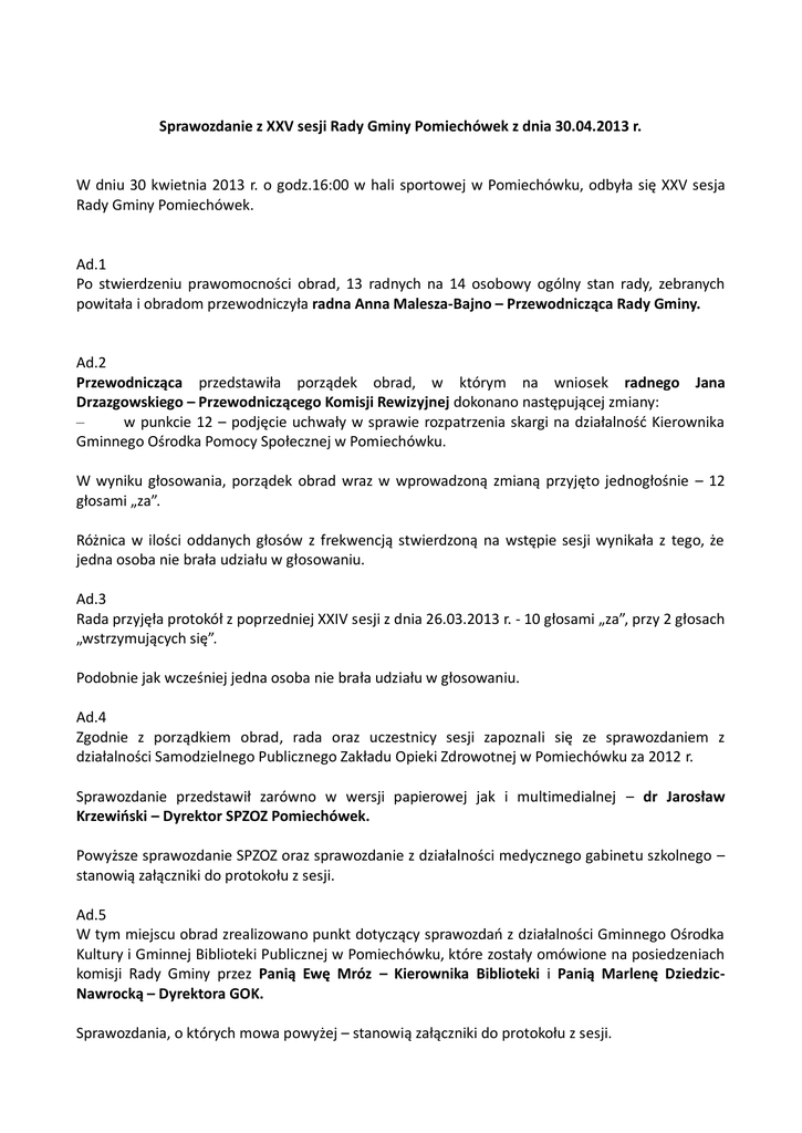 Sprawozdanie z XXV sesji Rady Gminy Pomiechówek z dnia 30.04.2013 r. W dniu 30 kwietnia 2013 r. o godz.16:00 w hali sportowej w Pomiechówku, odbyła się XXV sesja Rady Gminy Pomiechówek. Ad.1 Po stwierdzeniu prawomocności obrad, 13 radnych na 14 osobowy ogólny stan rady, zebranych powitała i obradom przewodniczyła radna Anna Malesza-Bajno – Przewodnicząca Rady Gminy. Ad.2 Przewodnicząca przedstawiła porządek obrad, w którym na wniosek radnego Jana Drzazgowskiego – Przewodniczącego Komisji Rewizyjnej dokonano następującej zmiany: – w punkcie 12 – podjęcie uchwały w sprawie rozpatrzenia skargi na działalność Kierownika Gminnego Ośrodka Pomocy Społecznej w Pomiechówku. W wyniku głosowania, porządek obrad wraz w wprowadzoną zmianą przyjęto jednogłośnie – 12 głosami „za”. Różnica w ilości oddanych głosów z frekwencją stwierdzoną na wstępie sesji wynikała z tego, że jedna osoba nie brała udziału w głosowaniu. Ad.3 Rada przyjęła protokół z poprzedniej XXIV sesji z dnia 26.03.2013 r. - 10 głosami „za”, przy 2 głosach „wstrzymujących się”. Podobnie jak wcześniej jedna osoba nie brała udziału w głosowaniu. Ad.4 Zgodnie z porządkiem obrad, rada oraz uczestnicy sesji zapoznali się ze sprawozdaniem z działalności Samodzielnego Publicznego Zakładu Opieki Zdrowotnej w Pomiechówku za 2012 r. Sprawozdanie przedstawił zarówno w wersji papierowej jak i multimedialnej – dr Jarosław Krzewiński – Dyrektor SPZOZ Pomiechówek. Powyższe sprawozdanie SPZOZ oraz sprawozdanie z działalności medycznego gabinetu szkolnego – stanowią załączniki do protokołu z sesji. Ad.5 W tym miejscu obrad zrealizowano punkt dotyczący sprawozdań z działalności Gminnego Ośrodka Kultury i Gminnej Biblioteki Publicznej w Pomiechówku, które zostały omówione na posiedzeniach komisji Rady Gminy przez Panią Ewę Mróz – Kierownika Biblioteki i Panią Marlenę DziedzicNawrocką – Dyrektora GOK. Sprawozdania, o których mowa powyżej – stanowią załączniki do protokołu z sesji. Ad.6 Zgodnie z przepisami wynikającymi z ustawy z dnia 18.03.2011 r. o zmianie ustawy o pomocy społecznej oraz ustawy o świadczeniach opieki zdrowotnej finansowanych ze środków publicznych (Dz.U. Nr 81,poz.440 z 2011r.) OPS przygotował „ocenę zasobów pomocy społecznej” za rok 2012 i prognozę na rok 2013 i 2014 w oparciu o analizę sytuacji społecznej i demograficznej. Ocena wraz z wnioskami ma stanowić podstawę do planowania budżetu na rok następny. Zgodnie z zapisem art.16a ust. 4 cytowanej ustawy – organ wykonawczy jednostki samorządu terytorialnego przedstawia do 30 kwietnia Radzie Gminy opracowaną ocenę. Wobec powyższego radni zapoznali się z powyższym materiałem, który dokładnie omówiła Pani Wanda Mucha – Kierownik OPS na posiedzeniach komisji rady. Ad.7 Punktem kulminacyjnym sesji było zatwierdzenie sprawozdania finansowego gminy Pomiechówek wraz ze sprawozdaniem z wykonania budżetu gminy za rok 2012 i udzielenie Wójtowi Gminy absolutorium z tytułu wykonania budżetu za 2012 rok. Tekst sprawozdania z wykonania budżetu za rok 2012, w szczegółowości jak w uchwale budżetowej wraz z częścią objaśniającą i informacją o stanie mienia komunalnego oraz sprawozdanie finansowe gminy Pomiechówek według stanu na dzień 31.12.2012 r. - radni otrzymali w trybie ustawowym. Ponadto p. Zofia Błońska – Skarbnik Gminy szczegółowo omówiła powyższy materiał na posiedzeniach wszystkich komisji Rady Gminy. p. Zofia Błońska - Skarbnik Gminy odczytała uchwałę Składu Orzekającego Regionalnej Izby Obrachunkowej w sprawie opinii o przedłożonym przez Wójta Gminy Pomiechówek sprawozdaniu z wykonania budżetu za 2012 rok. Opinia RiO jest pozytywna. Radny Jan Drzazgowski – Przewodniczący Komisji Rewizyjnej przedstawił uchwałę Komisji Rewizyjnej w sprawie opinii dotyczącej wykonania budżetu gminy Pomiechówek za 2012 rok i wniosek w sprawie absolutorium dla Wójta Gminy. Następnie odczytał Uchwałę Składu Orzekającego RiO w sprawie zaopiniowania wniosku Komisji Rewizyjnej Rady Gminy Pomiechówek w sprawie udzielenia absolutorium dla Wójta Gminy Pomiechówek. Przeprowadzono debatę budżetową, w której głos zabierali radni: Mariusz Wyszyński i Urszula Nowakowska. Po debacie – przeprowadzono glosowanie nad uchwałami: – w sprawie zatwierdzenia sprawozdania finansowego za 2012 rok – przyjęto jednogłośnie (13 głosami „za”) - Uchwała Nr XXV/193/2013 – w sprawie udzielenia Wójtowi Gminy absolutorium z tytułu wykonania budżetu Gminy za 2012 rok – przyjęto 12 głosami „za”, przy 1 głosie: wstrzymującym się”- Uchwała Nr XXV/194/2013 Ogólny skład Rady – 14 osób, obecność podczas sesji – 13 radnych, w chwili głosowania nad uchwałami – 13 radnych. Po zakończonym głosowaniu Pan Dariusz Bielecki – Wójt Gminy podziękował za udzielone absolutorium, podkreślając jednocześnie, że osiągnięte w ostatnich latach realizacje wielu zadań gminy były wynikiem zgodnych działań Rady i Wójta Gminy. Przyczyniły się do rozwoju gminy i zmian na lepsze. Ad.8 Rada na wniosek Wójta, dokonała zmian w budżecie Gminy Pomiechówek na rok 2013, które wynikły z rozdysponowania kwoty 1.260.947,00 zł z tytułu rozliczenia podatku VAT za halę sportową i 24.815,00 zł z dotacji na stypendia. Po zmniejszeniu otrzymanych dochodów o 154.211,00 zł – dotacja Wojewody na drogi i 115.037,00 zł – sprzedaż mienia komunalnego pozostałą kwotę w wysokości 1.016.514,00 zł wydatkowano na bieżącą działalność i zadania gminy. Z wnioskiem o zwiększenie kwoty do 35.000 zł na zakup lampy do sali operacyjnej Szpitala Nowodworskiego – wystąpił radny Andrzej Lenart, proponując zdjęcie wydatków na zakup sprzętu drogowego dla KZB. Powyższy wniosek nie uzyskał poparcia 7 radnych głosujących „przeciw” tej propozycji i tym samym nie został uwzglę