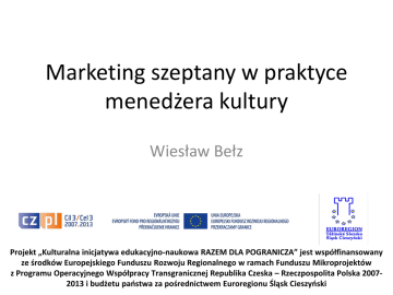 Marketing szeptany w praktyce menedżera kultury Wiesław Bełz Projekt „Kulturalna inicjatywa edukacyjno-naukowa RAZEM DLA POGRANICZA” jest współfinansowany ze środków Europejskiego Funduszu Rozwoju Regionalnego w ramach Funduszu Mikroprojektów z Programu Operacyjnego Współpracy Transgranicznej Republika Czeska – Rzeczpospolita Polska 20072013 i budżetu państwa za pośrednictwem Euroregionu Śląsk Cieszyński Zadanie 1 Narysuj mapę myśli odwzorowującą sposób w jaki promujecie imprezy kulturalne obecnie a. określ kluczowe media („nośniki” wiadomości, uwaga są nimi przede wszystkim ludzie) b. określ punkty wyjściowe komunikatów (czyli nadawców) c. określ węzły informacyjne (miejsca, w których następuje rozgałęzienie wysyłku) d. przyjrzyj się swej mapie i ustal jak głęboki jest Wasz system przekazu informacji (czy działa na jednym poziomie czy na kilku)? e. zastanów się czy nie można by go …bardziej usieciowić, …porozgałęziać? Zadanie 2 Dokonajmy analizy kluczowych instytucjonalnych gate-keeperów w Waszej miejscowości? Kim są ci ludzie? Opisz ich, ponazywaj, bliżej scharakteryzuj a. wójt/ sołtys/ burmistrz b. ksiądz c. sklepikarz d. barman e. bibliotekarka f. magiel/pralnia/szewc... g. lokalne autorytety związane z biznesem, administracją, kościołem... h. ktoś jeszcze... Zadanie 3 Dokonajmy analizy kluczowych nieinstytucjonalnych gate-keeperów w Waszej miejscowości? Kim są ci ludzie? Opisz ich, ponazywaj, bliżej scharakteryzuj a. nauczyciele b. uczniowie szkół c. miejscowa inteligencja humanistyczna (przedstaw konkretne osoby) d. pracownicy domu kultury e. pracownicy innych instytucji f. wierni widzowie g. współpracownicy instytucji (kierowcy, dostawcy, kooperanci) Zadanie 4 Budujemy ...SYSTEM marketingu szeptanego (co można/należy zrobić z gate-keeperami?) 1. proszę ich policzyć – zrobić kompletną listę 2. proszę określić jak wejść z nimi w kontakt (określić bieżące kanały komunikacji z nimi) 3. proszę ustalić czynniki motywacyjne - dla każdego gate-keepera oddzielnie 4. proszę odnieść poszczególnych gate-keeperów do różnych imprez organizowanych przez placówkę Zadanie 5 KLUBU AMBASADORÓW PLACÓWKI 1. Przygotuj ekskluzywne wydawnictwo-księgę pamiątkową, które stanowić będzie swego rodzaju ramy Klubu Amabsadorów Placówki. Możesz wzorować się na ankiecie członkowskiej Who is who in Poland (jednak ostateczne pytania kwestionariusza musisz dobrać samodzielnie w zależności od potrzeb i uwarunkowań) 2. Stwórz wzór certyfikatu członkowskiego Klubu Ambasadorów Placówki Kultury. Stwórz regulamin jego przyznawania. Zorganizuj pierwszą kapitułę Klubu (w jej skład powinien koniecznie wejść ktoś z jednostki nadrzędmnej, np z pionu kultury gminy, powiatu, województwa, centrum) Zadanie 6 Arsenał promocji w praktyce placówki kulturalnej – omówienie… a. mailingi personalizowane b. SMS-y c. kontakty na facebooku d. ulotki z xero... e. mini plakaty wydrukowane na A4 f. strona www g. badania statystyczne/społeczne jako forma działania marketingowego Zadanie 7 Problemy związane z wdrożeniem marketingu szeptanego zbudować plan działania! II. kwestie związane odnośnie współpracy marketingowca z dyrekcją III. udział (z czasem) w takim marketingu całego zespołu placówki IV. określ wpływ tej formy promocji na sposób działania placówki oraz jej program imprez, w szczególności na : a. politykę repertuarową b. atmosferę w instytucji c. motywacje ludzi zajmujących sie promocją ... d. wizerunek instytucji... V. określ zagrożenia jakie mogą się wiązać z takim systemem promocji ... a. z czasem ...zmęczenie, wypalenie operatora b. destrukcyjne działania innych pracowników instytucji (niechęć, zawiść, brak akceptacji dla takich form realizacji promocji) c. brak wystarczajacego oddźwięku w miejscu działania (niska skuteczność)... I. Zadanie 8 Misja i hasło określające to co robisz … 1. Na podstawie swoich przemyśleń, wniosków – spróbuj określić swoją (osobistą) misję w instytucji kultury. Misję w stosunku do… - a.… całej placówki (jako funkcjonującej instytucji, przedsiębiorstwa), - b.…. zespołu pracowniczego instytucji, - c.… widzów, fanów placówki, - d.… współpracowników (artystów, performerów, wykonawców). - e… mieszkańców gminy, powiatu, miasta w którym działacie Projekt „Kulturalna inicjatywa edukacyjno-naukowa RAZEM DLA POGRANICZA” jest współfinansowany ze środków Europejskiego Funduszu Rozwoju Regionalnego w ramach Funduszu Mikroprojektów z Programu Operacyjnego Współpracy Transgranicznej Republika Czeska – Rzeczpospolita Polska 2007-2013 i budżetu państwa za pośrednictwem Euroregionu Śląsk Cieszyński
