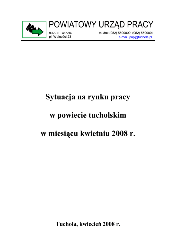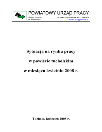 89-500 Tuchola pl. Wolności 23 tel./fax (052) 5590800, (052) 5590801 e-mail: [email protected] Sytuacja na rynku pracy w powiecie tucholskim w miesiącu kwietniu 2008 r. Tuchola, kwiecień 2008 r. ZAREJESTROWANI BEZROBOTNI WEDŁUG MIAST I GMIN stan na koniec miesiąca kwietnia 2007 roku L.p Wyszczególnienie 1 Miasto TUCHOLA obszar wiejski 2 Gmina CEKCYN 3 Gmina GOSTYCYN 4 Gmina KĘSOWO 5 Gmina LUBIEWO 6 Gmina ŚLIWICE Ogółem PUP Zamieszkali na wsi w PUP Liczba bezrobotnych Ogółem 1048 542 465 457 428 384 407 3731 2683 Kobiety 640 355 328 299 272 235 263 2392 1752 Bezrobotni z prawem do zasiłku Razem Kobiety 208 89 79 28 75 34 68 29 61 26 65 27 98 53 654 286 446 197 stan na koniec miesiąca kwietnia 2008 roku L.p Wyszczególnienie 1 Miasto TUCHOLA obszar wiejski 2 Gmina CEKCYN 3 Gmina GOSTYCYN 4 Gmina KĘSOWO 5 Gmina LUBIEWO 6 Gmina ŚLIWICE Ogółem PUP Zamieszkali na wsi w PUP Liczba bezrobotnych Ogółem 763 417 371 343 322 341 349 2906 2143 Kobiety 487 309 255 226 210 211 237 1935 1448 Bezrobotni z prawem do zasiłku Razem Kobiety 166 87 51 20 65 23 57 20 60 23 66 27 89 51 554 251 388 164 Sytuacja na rynku pracy powiatu tucholskiego kwiecień 2007 – kwiecień 2008 Struktura bezrobotnych Lp. Wyszczególnienie 04/2007 04/2008 wzrost/spadek 1 Liczba bezrobotnych 3731 2906 -825 2 3 w tym kobiet Stopa bezrobocia [%] 2392 21,8 1935 18,9* -457 X 4 654 554 -100 117 87 -30 6 Bezrobotni z prawem do zasiłku Osoby w okresie do 12 m-cy od dnia ukończenia nauki Niepełnosprawni 175 189 +14 7 Bezrobotni do 25 roku życia 979 719 -260 8 Bezrobotni powyżej 50 roku życia 530 462 -68 9 10 Zamieszkali na wsi Zwolnieni z przyczyn zakładu pracy 2683 48 2143 21 -540 -27 11 Długotrwale bezrobotni 2489 1785 -704 1784 1367 -417 1130 858 -272 X 235 X X 776 X X 2058 X 5 12 13 w tym kobiety 15 Bez kwalifikacji zawodowych Samotnie wychowujący co najmniej jedno dziecko do lat 18 Bez doświadczenia zawodowego 16 Bez wykształcenia średniego 14 *stopa bezrobocia na 31.03.2008 r. Bilans bezrobotnych w miesiącu kwietniu Lp. Wyszczególnienie 04/2007 04/2008 wzrost/spadek 1 Bezrobotni zarejestrowani w mies. z tego: - po raz pierwszy - po raz kolejny Liczba wyłączonych z ewidencji z tego: podjęcia pracy w miesiącu: - niesubsydiowanej - subsydiowanej w tym: prace interwencyjne roboty publiczne podjęcia dział. gosp. podj. pracy w ramach refundacji kosztów zatrudniania rozpoczęcia stażu lub szkolenia rozp. przygotowania zawodowego w miejscu pracy rozp. pracy społecznie użytecznej niepotw. gotowości do podj. pracy 357 329 -28 41 316 593 33 296 597 -8 -20 +4 328 224 104 204 143 61 -124 -81 -43 25 41 7 31 16 0 28 15 -9 -41 +21 -16 28 24 21 50 -7 +26 19 130 17 185 -2 +55 2 Bilans bezrobotnych od początku roku Lp. Wyszczególnienie 01-04/2007 01-04/2008 wzrost/spadek 1 Bezrobotni zarejestrowani w okresie z tego: - po raz pierwszy - po raz kolejny Liczba wyłączonych z ewidencji z tego: podjęcia pracy: - niesubsydiowanej - subsydiowanej w tym: prace interwencyjne roboty publiczne podjęcia dział. gosp. podj. pracy w ramach refundacji kosztów zatrudnienia rozpoczęcia stażu lub szkolenia rozp. przygotowania zawodowego w miejscu pracy rozp. pracy społecznie użytecznej niepotw. gotowości do podj. pracy 1691 1419 -272 180 1511 2102 167 1252 1701 -13 -259 -401 1000 765 235 674 554 120 -326 -211 -115 107 41 28 43 41 12 28 24 -66 -29 0 -19 205 88 123 67 -82 -21 75 467 86 563 +11 +96 2 Osoby zarejestrowane, nie posiadające statusu bezrobotnych Lp. 1 Wyszczególnienie Poszukujący pracy 04/2007 04/2008 wzrost/spadek 81 76 -5 Bezrobotni niepełnosprawni Lp. Wyszczególnienie 04/2007 04/2008 wzrost/spadek 1 Liczba zarejestrowanych ogółem z tego: - niepełnosprawni poszukujący pracy nie pozostający w zatrudnieniu - niepełnosprawni bezrobotni Bezrobotni niepełnosprawni z prawem do zasiłku Zarejestrowani od 01.01 do 30.04 Niepełnosprawni, którzy podjęli pracę od 01.01 do 30.04 217 235 +18 42 46 +4 175 189 +14 45 47 +2 115 140 +25 70 49 -21 01-04/2007 01-04/2008 wzrost/spadek 2 3 4 Aktywizacja bezrobotnych Lp. Wyszczególnienie 1 Oferty pracy 802 588 -214 2 3 W tym na pracę subsydiowaną z FP Liczba zatrudnionych ogółem Liczba osób, które podjęły zatrudnienie subsydiowane Zatrudnienie w ramach prac interwencyjnych Zatrudnienie w ramach robót publicznych Osoby, które otrzymały dodatek aktywizacyjny Rozpoczęcie przygotowania zawodowego w miejscu pracy Rozpoczęcie stażu Udzielenie jednorazowych środków na podjęcie działalności gospodarczej Podjęcie pracy w ramach refundacji kosztów wyposażenia stanowiska pracy Szkolenia 573 1000 379 674 -194 -326 235 120 -115 107 41 -66 41 12 -29 51 48 -3 88 67 -21 118 53 -65 28 28 0 43 24 -19 87 70 -17 4 5 6 7 8 9 10 11 12