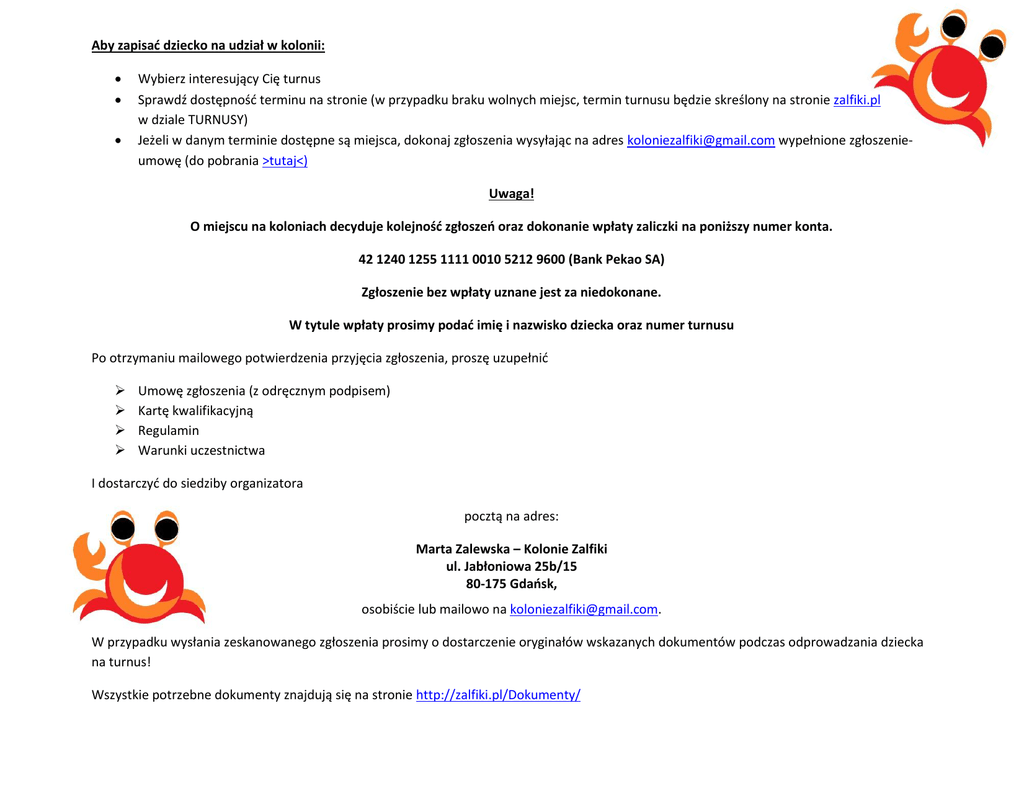 Aby zapisać dziecko na udział w kolonii:    Wybierz interesujący Cię turnus Sprawdź dostępność terminu na stronie (w przypadku braku wolnych miejsc, termin turnusu będzie skreślony na stronie zalfiki.pl w dziale TURNUSY) Jeżeli w danym terminie dostępne są miejsca, dokonaj zgłoszenia wysyłając na adres [email protected] wypełnione zgłoszenieumowę (do pobrania >tutaj<) Uwaga! O miejscu na koloniach decyduje kolejność zgłoszeń oraz dokonanie wpłaty zaliczki na poniższy numer konta. 42 1240 1255 1111 0010 5212 9600 (Bank Pekao SA) Zgłoszenie bez wpłaty uznane jest za niedokonane. W tytule wpłaty prosimy podać imię i nazwisko dziecka oraz numer turnusu Po otrzymaniu mailowego potwierdzenia przyjęcia zgłoszenia, proszę uzupełnić     Umowę zgłoszenia (z odręcznym podpisem) Kartę kwalifikacyjną Regulamin Warunki uczestnictwa I dostarczyć do siedziby organizatora pocztą na adres: Marta Zalewska – Kolonie Zalfiki ul. Jabłoniowa 25b/15 80-175 Gdańsk, osobiście lub mailowo na [email protected]. W przypadku wysłania zeskanowanego zgłoszenia prosimy o dostarczenie oryginałów wskazanych dokumentów podczas odprowadzania dziecka na turnus! Wszystkie potrzebne dokumenty znajdują się na stronie http://zalfiki.pl/Dokumenty/