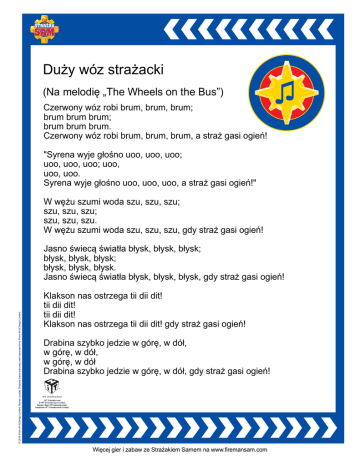 Duży wóz strażacki (Na melodię „The Wheels on the Bus”) Czerwony wóz robi brum, brum, brum; brum brum brum; brum brum brum. Czerwony wóz robi brum, brum, brum, a straż gasi ogień! "Syrena wyje głośno uoo, uoo, uoo; uoo, uoo, uoo; uoo, uoo, uoo. Syrena wyje głośno uoo, uoo, uoo, a straż gasi ogień!" W wężu szumi woda szu, szu, szu; szu, szu, szu; szu, szu, szu. W wężu szumi woda szu, szu, szu, gdy straż gasi ogień! © 2014 Prism Art & Design Limited. Nazwa i postać Strażaka Sama stanowią znaki towarowe firmy Prism Art & Design Limited. Jasno świecą światła błysk, błysk, błysk; błysk, błysk, błysk; błysk, błysk, błysk. Jasno świecą światła błysk, błysk, błysk, gdy straż gasi ogień! Klakson nas ostrzega tii dii dit! tii dii dit! tii dii dit! Klakson nas ostrzega tii dii dit! gdy straż gasi ogień! Drabina szybko jedzie w górę, w dół, w górę, w dół, w górę, w dół Drabina szybko jedzie w górę, w dół, gdy straż gasi ogień! Więcej gier i zabaw ze Strażakiem Samem na www.firemansam.com