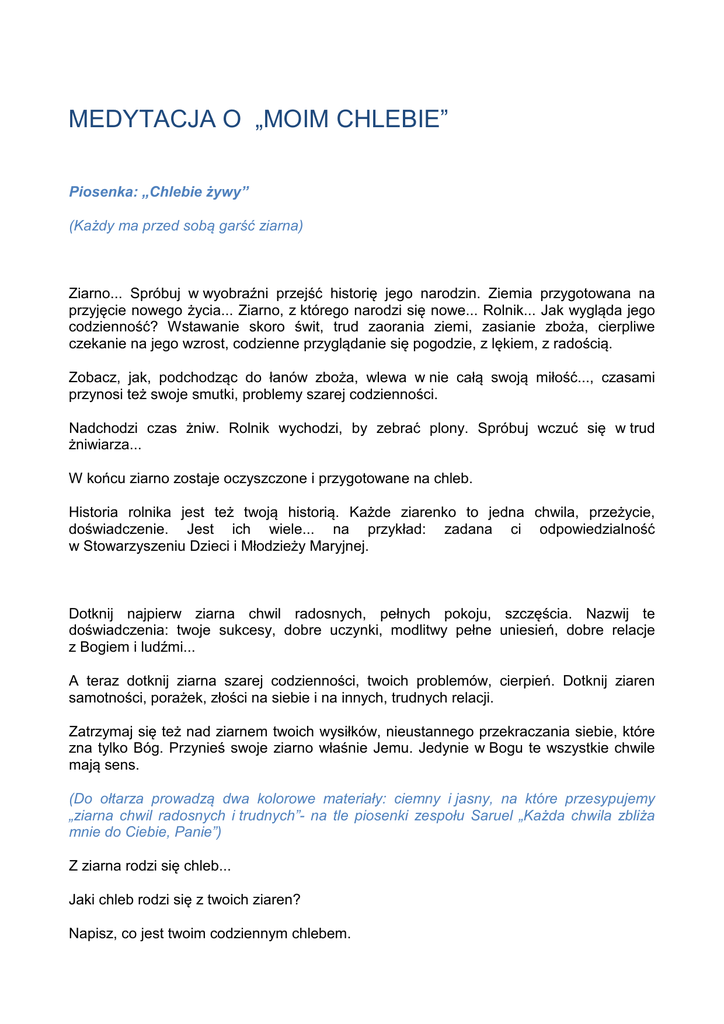 MEDYTACJA O „MOIM CHLEBIE” Piosenka: „Chlebie żywy” (Każdy ma przed sobą garść ziarna) Ziarno... Spróbuj w wyobraźni przejść historię jego narodzin. Ziemia przygotowana na przyjęcie nowego życia... Ziarno, z którego narodzi się nowe... Rolnik... Jak wygląda jego codzienność? Wstawanie skoro świt, trud zaorania ziemi, zasianie zboża, cierpliwe czekanie na jego wzrost, codzienne przyglądanie się pogodzie, z lękiem, z radością. Zobacz, jak, podchodząc do łanów zboża, wlewa w nie całą swoją miłość..., czasami przynosi też swoje smutki, problemy szarej codzienności. Nadchodzi czas żniw. Rolnik wychodzi, by zebrać plony. Spróbuj wczuć się w trud żniwiarza... W końcu ziarno zostaje oczyszczone i przygotowane na chleb. Historia rolnika jest też twoją historią. Każde ziarenko to jedna chwila, przeżycie, doświadczenie. Jest ich wiele... na przykład: zadana ci odpowiedzialność w Stowarzyszeniu Dzieci i Młodzieży Maryjnej. Dotknij najpierw ziarna chwil radosnych, pełnych pokoju, szczęścia. Nazwij te doświadczenia: twoje sukcesy, dobre uczynki, modlitwy pełne uniesień, dobre relacje z Bogiem i ludźmi... A teraz dotknij ziarna szarej codzienności, twoich problemów, cierpień. Dotknij ziaren samotności, porażek, złości na siebie i na innych, trudnych relacji. Zatrzymaj się też nad ziarnem twoich wysiłków, nieustannego przekraczania siebie, które zna tylko Bóg. Przynieś swoje ziarno właśnie Jemu. Jedynie w Bogu te wszystkie chwile mają sens. (Do ołtarza prowadzą dwa kolorowe materiały: ciemny i jasny, na które przesypujemy „ziarna chwil radosnych i trudnych”- na tle piosenki zespołu Saruel „Każda chwila zbliża mnie do Ciebie, Panie”) Z ziarna rodzi się chleb... Jaki chleb rodzi się z twoich ziaren? Napisz, co jest twoim codziennym chlebem. (Na obrazku piszemy odpowiedź, która na końcu modlitwy stanie się dziękczynieniem) „Błogosławiony bądź, Ojcze, bo dzięki Twojej hojności otrzymaliśmy chleb, owoc pracy rąk ludzkich. Tobie go przynosimy, aby stał się dla nas Chlebem Życia.” Wystawienie Najświętszego Sakramentu Pieśń: Uwielbiam Ciebie Panie... „W czasie Ostatniej Wieczerzy wziął chleb i odmówiwszy błogosławieństwo, połamał i dał uczniom mówiąc : to jest Ciało moje , które za was będzie wydane”. ( Mt 26,26) Jezus bierze chleb.. konkretny chleb .. jeden spośród wielu innych... Bóg wybiera mnie jedynego w swoim rodzaju, obdarza konkretnymi darami, akceptuje mnie takiego jakim jestem. Eucharystia przypomina moment mojego wybrania... Jezus bierze mój chleb, moje życie w swoje ręce. Poczuję dotyk Jego dłoni... delikatność..., ciepło ..., miłość, z jaką mnie podtrzymuje . Czy pozwalam, aby Jezus brał moje życie w swoje ręce? Jezus błogosławi chleb- to znaczy przemienia go w swoje ciało...przenika całą jego przestrzeń, nasyca go sobą wciela się w niego. Niebo łączy się z ziemią... Jezus wybierając mnie, biorąc w swoje dłonie – przemienia mnie. Jezus błogosławi mój chleb, wchodzi w moje życie, udzielając mi łaski, darów, charyzmatów. Jezus przenika moje ludzkie życie i upodabnia mnie do siebie. Zobaczę, jak Pan mi błogosławi , jak przemienia moje życie... Jezus łamie chleb...aby chleb mógł być spożyty musi zostać połamany na wiele kawałków. Nasze życie jest przeplatane przez różne trudne sytuacje- to momenty przełamania chleba... Bóg kształtuje nas jak garncarz, przygotowuje do dzieła , które chce nam powierzyć. Czasem nie pozwalam przełamać się Bogu. W czym bronię się przed przełamaniem? Jezus podaje uczniom chleb do spożycia.- mój chleb jest chlebem dla innych... Bóg powierza mi konkretną misję- bycie animatorem... w konkretnym miejscu i czasie...Czy akceptuję i cieszę się z tego miejsca, które Pan dla mnie wybrał? Czy godzę się umierać, by być pokarmem dla innych? Piosenka: Dzielmy się wiarą jak chlebem... Modlitwa spontaniczna... Eucharystia to dziękczynienie. Panie, chcę Ci teraz powiedzieć: DZIĘKUJĘ, za to, co jest moim codziennym chlebem.