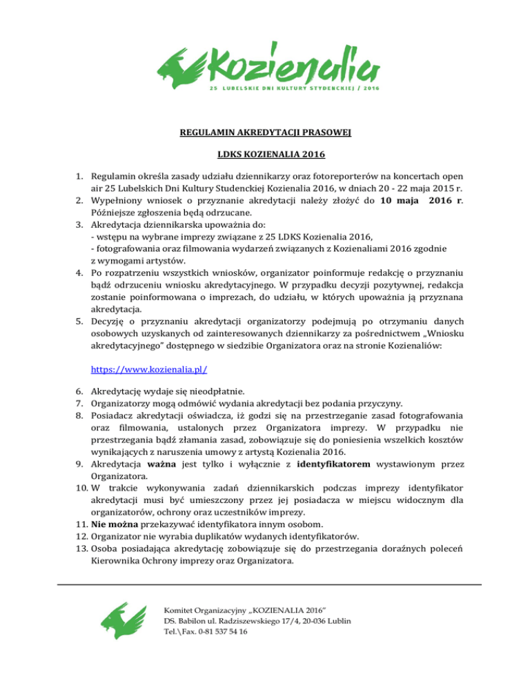 REGULAMIN AKREDYTACJI PRASOWEJ LDKS KOZIENALIA 2016 1. Regulamin określa zasady udziału dziennikarzy oraz fotoreporterów na koncertach open air 25 Lubelskich Dni Kultury Studenckiej Kozienalia 2016, w dniach 20 - 22 maja 2015 r. 2. Wypełniony wniosek o przyznanie akredytacji należy złożyć do 10 maja 2016 r. Późniejsze zgłoszenia będą odrzucane. 3. Akredytacja dziennikarska upoważnia do: - wstępu na wybrane imprezy związane z 25 LDKS Kozienalia 2016, - fotografowania oraz filmowania wydarzeń związanych z Kozienaliami 2016 zgodnie z wymogami artystów. 4. Po rozpatrzeniu wszystkich wniosków, organizator poinformuje redakcję o przyznaniu bądź odrzuceniu wniosku akredytacyjnego. W przypadku decyzji pozytywnej, redakcja zostanie poinformowana o imprezach, do udziału, w których upoważnia ją przyznana akredytacja. 5. Decyzję o przyznaniu akredytacji organizatorzy podejmują po otrzymaniu danych osobowych uzyskanych od zainteresowanych dziennikarzy za pośrednictwem „Wniosku akredytacyjnego” dostępnego w siedzibie Organizatora oraz na stronie Kozienaliów: https://www.kozienalia.pl/ 6. Akredytację wydaje się nieodpłatnie. 7. Organizatorzy mogą odmówić wydania akredytacji bez podania przyczyny. 8. Posiadacz akredytacji oświadcza, iż godzi się na przestrzeganie zasad fotografowania oraz filmowania, ustalonych przez Organizatora imprezy. W przypadku nie przestrzegania bądź złamania zasad, zobowiązuje się do poniesienia wszelkich kosztów wynikających z naruszenia umowy z artystą Kozienalia 2016. 9. Akredytacja ważna jest tylko i wyłącznie z identyfikatorem wystawionym przez Organizatora. 10. W trakcie wykonywania zadań dziennikarskich podczas imprezy identyfikator akredytacji musi być umieszczony przez jej posiadacza w miejscu widocznym dla organizatorów, ochrony oraz uczestników imprezy. 11. Nie można przekazywać identyfikatora innym osobom. 12. Organizator nie wyrabia duplikatów wydanych identyfikatorów. 13. Osoba posiadająca akredytację zobowiązuje się do przestrzegania doraźnych poleceń Kierownika Ochrony imprezy oraz Organizatora. Komitet Organizacyjny „KOZIENALIA 2016” DS. Babilon ul. Radziszewskiego 17/4, 20-036 Lublin Tel.\Fax. 0-81 537 54 16 15. Wystawiona akredytacja prasowa będzie do odbioru w biurze Organizatora, ul. Radziszewskiego 17, DS. Babilon, pok. 4, minimum 3 dni przed pierwszym dniem Kozienaliów bądź w dzień koncertu. 16. Organizator ma prawo do unieważnienia wydanej akredytacji w przypadku nie przestrzegania regulaminu, prowadzenia działań szkodzących wizerunkowi Imprezy bądź wykorzystania materiałów niezgodnie z ich przeznaczeniem. 17. Osobą kontaktową ze strony Organizatora jest Rafał Wojnowski (tel. 507 142 969; e-mail: [email protected]). 18. Organizator zastrzega sobie prawo do dokonania modyfikacji postanowień niniejszego Regulaminu. 19. W sprawach nieuregulowanych niniejszym Regulaminem stosuje się odpowiednio przepisy Kodeksu Cywilnego oraz przepisów powszechnie obowiązującego prawa. Oświadczam, iż zapoznałem się z powyższym regulaminem oraz akceptuję wszystkie jego warunki. ..............................……………………..……. Podpis Komitet Organizacyjny „KOZIENALIA 2016” DS. Babilon ul. Radziszewskiego 17/4, 20-036 Lublin Tel.\Fax. 0-81 537 54 16