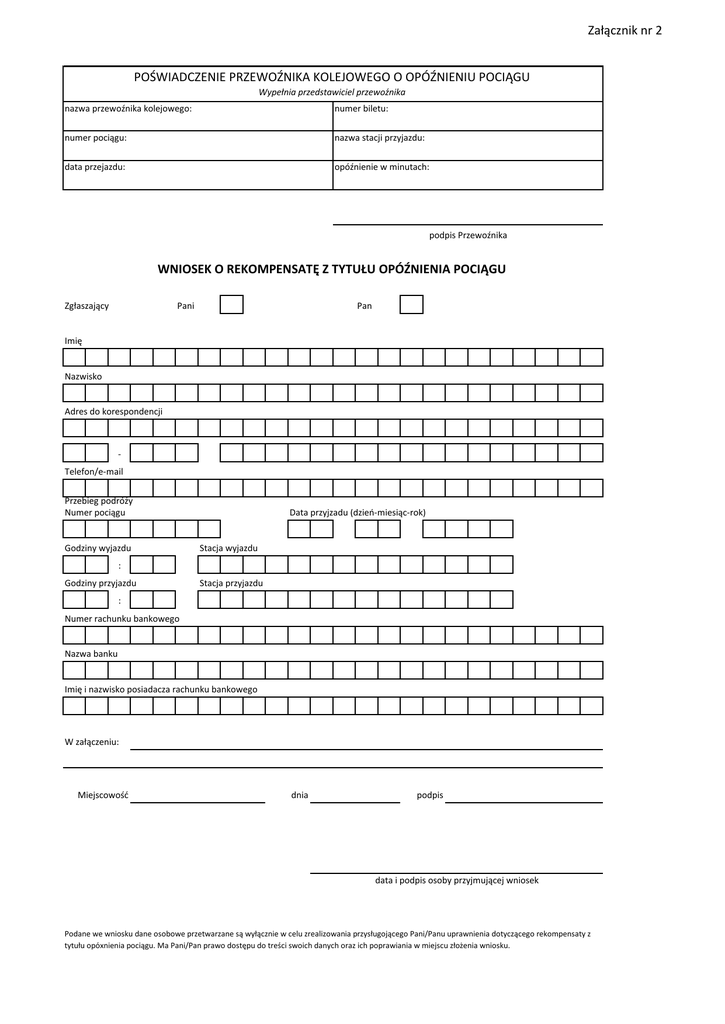 Załącznik nr 2 POŚWIADCZENIE PRZEWOŹNIKA KOLEJOWEGO O OPÓŹNIENIU POCIĄGU Wypełnia przedstawiciel przewoźnika nazwa przewoźnika kolejowego: numer biletu: numer pociągu: nazwa stacji przyjazdu: data przejazdu: opóźnienie w minutach: podpis Przewoźnika WNIOSEK O REKOMPENSATĘ Z TYTUŁU OPÓŹNIENIA POCIĄGU Zgłaszający Pani Pan Imię Nazwisko Adres do korespondencji Telefon/e-mail Przebieg podróży Numer pociągu Godziny wyjazdu Data przyjzadu (dzieńmiesiącrok) Stacja wyjazdu : Godziny przyjazdu Stacja przyjazdu : Numer rachunku bankowego Nazwa banku Imię i nazwisko posiadacza rachunku bankowego W załączeniu: Miejscowość dnia podpis data i podpis osoby przyjmującej wniosek Podane we wniosku dane osobowe przetwarzane są wyłącznie w celu zrealizowania przysługojącego Pani/Panu uprawnienia dotyczącego rekompensaty z tytułu opóxnienia pociągu. Ma Pani/Pan prawo dostępu do treści swoich danych oraz ich poprawiania w miejscu złożenia wniosku.