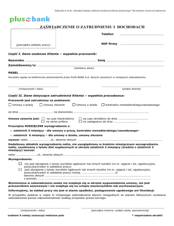 Załącznik nr 4a do „Metodyki badania zdolności kredytowej klienta detalicznego” dla kredytów innych niż hipoteczne ZAŚWIADCZENIE O ZATRUDNIENIU I DOCHODACH (pieczątka zakładu pracy) Telefon .……………………………………………… NIP firmy ……………………………………………… Część I. Dane osobowe Klienta – wypełnia pracownik: Nazwisko ……………………………………………………..……………………… Imię ……………………………………………………………… Zameldowany/a: …………………………………………………………………………………………………………………………………………… (dokładny adres) PESEL ……………………………………………… Wyrażam zgodę na telefoniczne potwierdzenie przez PLUS BANK S.A. danych zawartych w niniejszym zaświadczeniu. ……………………………………………………… ……………………………………………………........... (miejscowość i data) (podpis Klienta) Część II. Dane dotyczące zatrudnienia Klienta – wypełnia pracodawca: Pracownik jest zatrudniony na podstawie: Umowy o pracę Umowy zlecenie Umowy o dzieło Kontraktu menedżerskiego/zawodowego* od dnia ………………….…………..………. na stanowisku …………………………………………………………………………………………… Umowa zawarta jest: na czas nieokreślony na okres próbny na czas określony do dnia …………………………………… na zastępstwo do dnia …………………………… Przeciętne MIESIĘCZNE wynagrodzenie z: • ostatnich 3 miesięcy - dla umowy o pracę, kontraktu menedżerskiego/zawodowego* • ostatnich 6 miesięcy – dla umowy o dzieło, umowy zlecenia wynosi: netto …………………………zł., słownie złotych: ……………………………………………………………………………………………………… Dodatkowy składnik wynagrodzenia netto, nie uwzględniony w średnim miesięcznym wynagrodzeniu netto, uzyskiwany z tytułu diet wypłaconych w okresie ostatnich 3 miesięcy (średnia z ostatnich 3 miesięcy) wynosi: netto …………………………zł., słownie złotych……………………………………………………………………………………………………………………… Wynagrodzenie: nie jest obciążone z tytułu wyroków sądowych lub innych tytułów (m.in. zajęcia i tyt. egzekucyjne, pożyczka/kredyt w zakładzie pracy) jest obciążone z tytułu wyroków sądowych lub innych tytułów (m.in. zajęcia i tyt. egzekucyjne, pożyczka/kredyt w zakładzie pracy) kwotą ……………………………………… zł słownie złotych ………………………………………………………………………………………………………………………………… z powodu …………………………………………………………………………………………………………………………………………. Wymieniona w zaświadczeniu osoba nie znajduje się w okresie wypowiedzenia umowy, nie jest pracownikiem sezonowym i nie znajduje się na urlopie macierzyńskim lub wychowawczym. Informujemy, że zakład pracy nie jest w stanie upadłości, postępowania ugodowego ani likwidacji. W przypadku podania w części II niniejszego zaświadczenia danych niezgodnych ze stanem faktycznym wystawca zaświadczenia ponosi odpowiedzialność według przepisów prawa karnego. ………………………………………………………………….. (miejscowość i data) znakiem X należy zaznaczyć właściwe pole …………..………………………………………………………………............. (pieczątka imienna i podpis osoby upoważnionej) * niepotrzebne skreślić