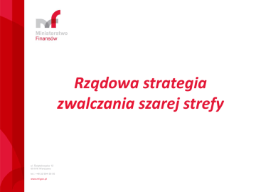 Rządowa strategia zwalczania szarej strefy ul. Świętokrzyska 12 00-916 Warszawa tel.: +48 22 694 55 55 www.mf.gov.pl Reforma prawa podatkowego • Najpierw trzeba odrzucić tezę, że rynek sam się wyreguluje i wyeliminuje nieuczciwych • Wszystkie podatki… • Uszczelnienie systemu to m.in. eliminacja wadliwych przepisów… Reforma prawa podatkowego …takich, które likwidują Zabezpieczenia przed ponownym opodatkowanie lub uniemożliwiają wprowadzaniem do obrotu jego wyegzekwowanie podmiotów wyrejestrowanych …takich, które legalizują uchylanie się Wdrożenie klauzuli /unikanie opodatkowania unikaniu opodatkowania przeciwko …takich, które ograniczają lub wręcz Stworzenie elektronicznej bazy eliminują możliwości wykrycia nabywców wyrobów akcyzowych np. uchylenia się od opodatkowania olejów opałowych lub elektronicznej kontroli całego rynku paliw …takich, które nie dają możliwości Stworzenie możliwości monitorowania odmowy wypłaty nienależnych przepływu towarów aż do momentu zadeklarowania wywozu i wniosku o zwrot zwrotów bez konieczności kontroli kolejnych ogniw łańcucha; Zmiana obowiązków informacyjnych związanych z rozliczeniem VAT Przedsięwzięcia organizacyjne – punkt wyjścia Wyszczególnienie 2015 liczba zakończonych kontroli ogółem 9 412 ustalenia dla których wydano decyzje 18 377,1 mln zł wpłaty ogółem 1 140,0 mln zł zatrzymany zwrot VAT 167,9 mln zł średnia kwota ustaleń na 1 kontrolę 1,97 mln zł Odsetek podatników VAT objętych kontrolą ul. Świętokrzyska 12 00-916 Warszawa tel.: +48 22 694 55 55 www.mf.gov.pl 0,0037% Przedsięwzięcia organizacyjne – punkt wyjścia obecne zasoby umożliwiają kontrolę skarbową czynnego podatnika VAT raz na 270 lat w celu udokumentowania karuzeli podatkowej wymagane jest przeprowadzenie kontroli wszystkich uczestników (średnio 5-6) i każdorazowe wydawanie decyzji dotyczących tych samych ustaleń ograniczone zasoby ograniczają aktywność kontroli do branż szczególnie podatnych na oszustwa podatkowe – np. paliwa, złom, elektronika, metale szlachetne … ul. Świętokrzyska 12 00-916 Warszawa tel.: +48 22 694 55 55 www.mf.gov.pl Przedsięwzięcia organizacyjne – propozycje skuteczne pozbawianie oszustów podatkowych osiągniętych korzyści – miernik: wpływy budżetowe w wyniku działań kontrolnych i karnych (efekt represji) ograniczenie wyłudzeń zwrotu VAT – miernik: zatrzymane zwroty VAT (efekt profilaktyki) zwiększenie efektywności pracy kontrolerów (wydajność pracy) … ul. Świętokrzyska 12 00-916 Warszawa tel.: +48 22 694 55 55 www.mf.gov.pl Przedsięwzięcia organizacyjne – typowanie do kontroli ul. Świętokrzyska 12 00-916 Warszawa tel.: +48 22 694 55 55 www.mf.gov.pl zmiana metodyki typowania podmiotów – zwiększenie roli centralnego planowania strategicznego – szczególnie w obszarach cen transferowych, wyłudzeń VAT i ukrywania dochodów koordynacja planów kontroli na poziomie województw, zapewniająca kontrole podmiotów stanowiących największe zagrożenie międzyresortowa platforma wymiany informacji o nieprawidłowościach – podmioty uczestniczące i mechanizmy … Przedsięwzięcia organizacyjne – rozwiązania informatyczne Projekt ustawy o szczególnych zasadach wykonywania niektórych zadań z zakresu informatyzacji działalności organów administracji podatkowej…. narzędzia usprawniające realizację kontroli – JPK wielopoziomowa wymiana informacji o wynikach analiz – Eurofisc, Polfisc ul. Świętokrzyska 12 00-916 Warszawa tel.: +48 22 694 55 55 www.mf.gov.pl zmniejszenie uciążliwości kontroli JPK – nowe narzędzie w ograniczaniu szarej strefy Dane w formacie JPK będą dostarczały duże podmioty (od 1 lipca 2016r.), z czasem też małe i średnie (od 1 lipca 2018r.) – stanowić to będzie cenne źródło informacji o prawdopodobnym prowadzeniu niezgłoszonej działalności. Jednostkowy plik umożliwi bardzo sprawne przeprowadzenie analizy dokumentacji finansowo-księgowej podmiotu i wykrycie nieprawidłowości Pliki (JPK) przekazywane przez zobowiązane podmioty z upływem czasu pozwolą na analizowanie sieci powiązań pomiędzy podmiotami . ul. Świętokrzyska 12 00-916 Warszawa tel.: +48 22 694 55 55 www.mf.gov.pl JPK i Centralny Rejestr Faktur Jednolity Plik Kontrolny Centralny Rejestr Faktur Dostarczany na żądanie organu kontrolującego w Powszechny obowiązek polegający na ramach czynności sprawdzających lub kontroli przekazywaniu organom administracji podatkowej określonego zakresu danych Zakres danych: wyciąg z ksiąg podatkowych i dowodów księgowych. Szczegółowy zakres informacji w oparciu o przepisy podatkowe dot. PIT, CIT i VAT. Dotyczy podmiotów kontrolowanych ul. Świętokrzyska 12 00-916 Warszawa tel.: +48 22 694 55 55 www.mf.gov.pl Informacje z wszystkich wystawionych faktur. Szczegółowy zakres informacji w oparciu o przepisy podatkowe dot. VAT Stan docelowy: Rozwiązania funkcjonują równolegle. JPK wykorzystywane w procesie kontrolnym i analitycznym. CRF stanowi bazę danych wykorzystywanych w procesie analitycznym. Czy ceny transferowe też kreują szarą strefę? Przeprowadzanie czynności sprawdzających umożliwiających weryfikację na podstawie obowiązującego od 1.01.2016 r. art. 272 pkt. 4 Ordynacji podatkowej. Publikacja listów ostrzegawczych Intensyfikacja działań kontrolnych wykonywanych przez Kontrolę Skarbową w I półroczu 2016 ul. Świętokrzyska 12 00-916 Warszawa tel.: +48 22 694 55 55 www.mf.gov.pl Reforma ustrojowa - KAS 1.Zwiększenie efektywności zarządzania a) redukcja podwójnych działań (np. podwójnych działań analitycznych, pokrywających się kontroli); b) ograniczenie licznych centr decyzyjnych (ograniczenie liczby stanowisk kierowniczych, skupienie się na najważniejszych zadaniach) c) usprawnienie przepływu informacji (dostęp do zasobów konsolidowanych służb) d) łatwiejszy dostęp do osób posiadających potrzebne um