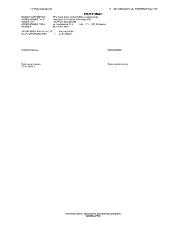 15 WOG SZCZECIN 71 - 231 SZCZECIN UL. NARUTOWICZA 10A PRZEDMIAR NAZWA INWESTYCJI ADRES INWESTYCJI INWESTOR ADRES INWESTORA BRANŻA : : : : : Wymiana bram do kompleksu wojskowego Szczecin, ul. Wojska Polskiego 250 15 WOG SZCZECIN ul. Nrutowicza 10 a kod. 71 - 231 Szczecin BUDOWLANA SPORZĄDZIŁ KALKULACJE : DATA OPRACOWANIA : Andrzej KRAC 27.01.2016 r. WYKONAWCA : INWESTOR : Data opracowania 27.01.2016 r. Data zatwierdzenia Dokument został opracowany przy pomocy programu NORMA PRO Wymiana bram przedmiar Lp. Podstawa 1 1.1 1 KNP 02 d.1.1 0318-01.03 analogia 2 KNP 02 d.1.1 0318-01.04 analogia 3 KNR-W 2-01 d.1.1 0207-01 0210-04 analogia PRZEDMIAR Opis i wyliczenia j.m. Brama nr 16 Roboty przygotowawcze Wykonanie tymczasowego ogrodzenia zabezpieczajacego obiekt na czas rea- m lizacji prac - słupki umocowane w podporach prefabrykowanych, wypełnienie pełne blaszane lub drewniane, zabezpieczone przed przewróceniem przez wiatr. 2+10+2 m Ogrodzenie tymczasowe placu budowy - rozbiórka - prefabrykowane drewniane ramy osiatkowane m poz.1 m Roboty ziemne wykonywane koparkami przedsiębiernymi 0.15 m3 w ziemi kat. m3 I-III uprzednio zmagazynowanej w hałdach z transportem urobku samochodami samowyładowczymi na odległość 14 km - wywóz ziemi usypanej wzdłuz ogrodzenia i naniesionej w świetle bramy 2.1*2.0*0.5*4+5.0*1.0*0.3*2 m3 1.2 Roboty rozbiórkowe ogrodzenia 4 KNP1 0716- Demontaż zabezpieczenia z drutu kolczastego na słupach metalowych d.1.2 02.01 071602.01 analogia 2.2+5.2+2.2 5 KNP1 0715- Demontaż wysięgników metalowych dla zabezpieczenia ogrodzeń drutem pod.1.2 01 0715przez odciecie od słupków 01.01 analogia 4 6 KNR 2-25 d.1.2 0308-02 7 KNR 2-25 d.1.2 0312-03 analogia 8 KNR 4-01 d.1.2 0212-02 analogia m ogr. szt. Ogrodzenia z prefabrykowanych elementów żelbetowych- rozebranie - płyty do m2 odzysku 2.1*2.0*2 m2 Bramy ze słupkami z rur lub kształtowników stalowych - rozebranie m2 5.2*1.9 m2 Rozbiórka elementów betonowych kolidujących z fundamentem pod bramę i słupki ogrodzenia m3 (2.1+5.2+2.1)*0.5*0.3 m3 m3 11 d.1.3 Utylizacja gruzu m3 poz.10 m3 Transport złomu samochodem skrzyniowym z załadunkiem i wyładunkiem ręcznym na odległość do 1 km (poz.4*0.5+poz.5*2+poz.7*12)*0.001 t 1.4 14 KNR 4-01 d.1.4 0102-02 15 KNR 4-01 d.1.4 0103-02 m3 t Transport złomu samochodem skrzyniowym - dodatek za każdy rozpoczęty km t ponad 1 km Krotność = 32 poz.12 t Roboty ziemne Wykopy wąskoprzestrzenne, nieumocnione o szerokości dna do 1.5 m i głębo- m3 kości do 1.5 m w gruncie kat. III <pod bramą>(0.6+0.5+0.6)*4.7*0.6 m3 Wykopy jamiste o powierzchni dna do 2.25 m2 i głębokości do 1.5 m w gruncie m3 kat. III <słupki>(0.6+0.5+0.6)*(0.6+0.5+0.6)*0.6*2 m3 -2- Norma PRO Wersja 4.49 Nr seryjny: 9552 14.000 RAZEM 14.000 14.000 RAZEM 14.000 11.400 RAZEM 11.400 9.600 RAZEM 9.600 4.000 RAZEM 4.000 8.400 RAZEM 8.400 9.880 RAZEM 9.880 1.410 RAZEM 1.410 1.410 RAZEM 1.410 1.410 RAZEM 1.410 1.410 RAZEM 1.410 0.131 RAZEM 0.131 0.131 RAZEM 0.131 4.794 RAZEM 4.794 szt. 10 KNR-W 4-01 Wywiezienie gruzu spryzmowanego samochodami samowyładowczymi na d.1.3 0109-12 każdy następny 1 km Krotność = 14 poz.9 13 KNR 4-04 d.1.3 1107-04 Razem m ogr. 1.3 Wywóz i utylizacja gruzu 9 KNR-W 4-01 Wywiezienie gruzu spryzmowanego samochodami samowyładowczymi na od- m3 d.1.3 0109-11 ległość do 1 km poz.8 m3 12 KNR 4-04 d.1.3 1107-01 Poszcz. 3.468 Wymiana bram przedmiar Lp. Podstawa 16 KNR 4-01 d.1.4 0105-02 17 KNR 4-01 d.1.4 0101-06 18 KNR 2-21 d.1.4 0401-02 PRZEDMIAR Opis i wyliczenia j.m. Zasypanie wykopów ziemią z ukopów z przerzutem ziemi na odległość do 3 m m3 i ubiciem warstwami co 15 cm w gruncie kat. III poz.14+poz.15-poz.19-poz.20-poz.21 m3 Wyrównanie terenu z grubsza, ze ścięciem wypukłości do 30 cm w gruncie kat. III 2.2*3*4 m2 Wykonanie trawników dywanowych siewem na gruncie kat. III bez nawożenia m2 poz.17 m2 m2 1.5 Roboty fundamentowe 19 KNR-W 2-02 Podkłady betonowe w budownictwie przemysłowym przy zastosowaniu pompy m3 d.1.5 1101-07 do betonu na podłożu gruntowym <słupki>0.5*0.5*0.1*2 m3 <brama>4.7*0.5*0.1 m3 20 KNR-W 2-02 Stopy fundamentowe betonowe o objętości do 0.5 m3 - z zastosowaniem pom- m3 d.1.5 0203-01 py do betonu - do poziomu terenu <słupki>0.5*0.5*0.8*2 m3 21 KNP1 0706- Ogrodzenia betonowe - cokól do poziomu terenu d.1.5 01 070601.01 analogia 4.7*0.5*0.8 22 KNR 2-02 d.1.5 0290-02 1.6 23 KNR 2-25 d.1.6 0308-01 analogia Przygotowanie i montaż zbrojenia elementów budynków i budowli - pręty żebrowane (poz.20+poz.21)*0.04 25 KNP1 0716d.1.6 02.01 071602.01 analogia 5.697 RAZEM 5.697 26.400 RAZEM 26.400 26.400 RAZEM 26.400 0.050 0.235 RAZEM 0.285 0.400 RAZEM 0.400 1.880 RAZEM 1.880 0.091 RAZEM 0.091 8.400 RAZEM 8.400 10.920 RAZEM 10.920 2.200 RAZEM 2.200 2.200 RAZEM 2.200 4.400 RAZEM 4.400 m3 m3 t t m2 Osadzenie bram metalowych dwuskrzydłowych w komplecie z montażem m2 słupków, podpór, wysięgników, zamknięć i zabezpieczeń. Ocynkowane i malowane proszkowo. Zamknięcie dwie kłodki klasy 5 o odpornosci na korozje klasa 3 (możliwość zamknięcia na kłódkę z obu stron bramy), wyposazone w plombownice na plomby ołowiane, posiadające zabezpieczenie przed otwarciem przez wiatr po obu stronach bramy oraz po otwarciu pod kątem 90 stopni. Wyposazone w dwa rzędy wysięgników o kącie umożliwiajacym otwarcie bramy do szerokości 90 stopni. Na wysięgnikach ułożony drut ostrzowy (2 razy po 5 żyłek) i koncertina (3 spinki na zwój średnica 450 mm). Brama wyposażona w zawiasy uniemozliwiajace demontaz bramy i wyposażone w smarowniczki. Szczeliny pomiędzy elementami bramy nie moga przekraczać 4 cm. Wypelnienie z pretów co najmniej fi 12 mm z rozstawem nie wiekszym niz 5 cm. Wysokość od poziomu terenu do góry skrzydła bramy co najmniej 210 cm. Wysokość od poziomu terenu do najwyższej żyłki drutu ostrzowego - 250 cm. 5.2*2.1 m2 Zabezpieczenie z drutu ostrzowego na szycach i słupach metalowych w odste- m ogr. pach maksimum 15 cm 
