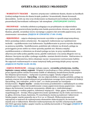 OFERTA DLA DZIECI I MŁODZIEŻY - WARSZTATY TKACKIE - tkactwo artystyczne i zdobienie tkanin, tkanie na bardkach (rodzaj małego krosna do tkania krajek, pasków i bransoletek), tkanie krosnach dywaników, toreb czy etui oraz drukowanie na tkaninach (serwetkach, koszulkach, poszewkach) barwnikami roślinnymi lub stemplami (PRZYJMUJEMY ZAPISY). - DECOUPAGE - technika zdobnicza polegająca na przyklejaniu na odpowiednio spreparowaną powierzchnię (praktycznie każda powierzchnia: drewno, metal, szkło, tkanina, plastik, ceramika) wzoru wyciętego z papieru lub serwetki papierowej, oraz cieniowanie i utrwalenie (ZAJĘCIA W CZWARTKI 17:00-19:00). - RĘKODZIEŁO - zajęcia obejmują tworzenie wyrobów w sposób nieprzemysłowy, które posiadają walory artystyczne . Na zajęciach realizowane są 2 podstawowe techniki – szydełkowanie oraz haftowanie. Szydełkowanie to proces wyrobu dzianiny za pomocą szydełka. Szydełkowanie, podobnie jak robienie na drutach, polega na przeciąganiu przez siebie na różne sposoby pętelek nici. Różnica między szydełkowaniem a robieniem na drutach polega na tym, że przy szydełkowaniu aktywna jest tylko jedna pętelka naraz, pętelki wykonane z tej samej długości nici są dłuższe i korzysta się tylko z jednego szydełka zamiast dwóch drutów. Hafciarstwo to dziedzina włókiennictwa, która obejmuje ręczne i maszynowe wytwarzanie haftów. Na zajęciach realizowanych w nasze instytucji hafty powstają dzięki pracy ręcznej (ZAJĘCIA W PIĄTKI 16:00-18:30). - ZAJECIA MANUALNE – różnego rodzaju zajęcia : ceramika artystyczna, rzeźba, lepienie z masy solnej, orgiami. Origami to pochodząca z Chin, później rozwinięta przez Japończyków sztuka tworzenia ozdób ze składanej, kwadratowej kartki papieru bez klejenia iprzecinania – wyłącznie za pomocą zagięć. Sztuka origami uczy dokładności i harmonii. Upcycling - nie ma odpowiednika w języku polskim, polega na nadaniu starym lub niepotrzebnym już przedmiotom nowego życia, zmianie ich funkcji. Upcyckling, jest rodzajem „zrób to sam”, co z kolei pozwala na rozwijanie kreatywności. Papier mache – sztuka tworzenia przedmiotów z nakładanych na siebie warstw papieru i kleju lub modelowanie z masy papierowej (masa papierowa – masa dająca się formować, twarda po wysuszeniu; składa się z: rozdrobnionego i namoczonego w wodzie papieru, substancji wiążących – kleju, gipsu, krochmalu i wypełniających – kredy). Masa papierowa może upodabniać się do wielu surowców m. in.:gliny, drewna, brązu, kamienia. Po wyschnięciu można ją malować i lakierować. Sztuka papier mache pojawiła się w II w n.e. w Chinach. Wykorzystywana jest najczęściej w teatrach do wykonywania elementów dekoracyjnych, do tworzenia masek oraz w lalkarstwie. Również wykorzystywana do wyrobu artystycznych ozdób. Od 1925 ogromne kukły z papier mache są ozdobą karnawału w Viareggio (ZAJĘCIA W PIĄTKI 16:00-19:00) - MALARSTWO - to zajęcia z wykorzystaniem różnorodnych technik rysunkowych (ołówka, węgla, pasteli) oraz malarskich (farb akwarelowych i akrylowych, pasteli suchych i tłustych), przy pomocy których można nauczyć się jak narysować lub namalować martwą naturę, krajobrazy i wiele innych. Można również przedstawić swoją fantastyczną czy abstrakcyjną wizję malarską (ZAJĘCIA W SOBOTY 10:0011:00). - NAUKA GRY NA INSTRUMENTACH MUZYCZNYCH – są to indywidulane zajęcia z instruktorem (trwające 30 minut). Aktualnie w ofercie dostępna nauka gry na keyboardzie, gitarze, flecie, akordeonie i perkusji. Zajęcia odbywają się po wcześniejszym uzgodnieniu godziny zajęć z instruktorem (ZAJĘCIA W PONIEDZIAŁKI 15:00-19:30, WTORKI 17:00-20:00, ŚRODY 15:00-19:30) - STUDIO PIOSENKI - są to indywidulane (bądź w grupach 2-3 osobowych) zajęcia z instruktorem (trwające ok. 30 minut). Zajęcia w zakresie pracy nad ciekawym repertuarem, różnicowanym pod względem : charakteru, tematyki oraz stylistyki muzycznej. Praca nad emisją głosu, dykcją, recytacją czy interpretacją piosenki. Na zajęciach zapewniane są sprzyjające warunki pracy – ćwiczenia z użyciem mikrofonu, na profesjonalnym sprzęcie nagłaśniającym, często w warunkach scenicznych, tak, aby zagwarantować jak najlepsze warunki do osiągnięcia swobody scenicznej, oraz potrzebnego doświadczenia na scenie. Zajęcia przygotowują do udziału w różnego rodzaju konkursach piosenki, występach scenicznych, organizowanych koncertach i imprezach plenerowych. Zajęcia odbywają się po wcześniejszym uzgodnieniu godziny zajęć z instruktorem (ZAJĘCIA W CZWARTKI 16:00-20:00). - TANIEC – HIP HOP dla dzieci i młodzieży, MIX TANECZNY DLA NAJMŁODSZYCH – zajęcia prowadzone przez instruktorów Centrum Tańca i Ruchu STEP DANCE. Hip – hop przewidziany jest dla starszych dzieci i młodzieży – od 6 lat, natomiast mix taneczny dla dzieci młodszych od 3 lat. Zajęcia z mixu tanecznego wykorzystują wiele stylów tanecznych, dając możliwość wszechstronnego rozwoju. Na zajęciach dzieci i młodzież poznają elementy różnych tańców. Taniec doskonale rozwija wszystkie grupy mięśni, poprawia motorykę ciała i nadaje mu gibkości i elastyczności. Dzięki tym zajęciom dzieci i młodzież ukształtują prawidłowo swoją sylwetkę i postawę, poprawia swoją kondycję oraz będą miały możliwość wyzwolenia drzemiącej w nich energii (MIX TANECZNY WE WTORKI 17:15-18:00, HIP-HOP W CZWARTKI 18:30-19:30). - JOGA kids – zajęcia jogi rozwijają siłę, wytrzymałość, elastyczność, prawidłową postawę ciała, koncentrację ora właściwy oddech, spokój wewnętrzny, umiejętność relaksowania się, odporność psychiczną i fizyczną dziecka i zdolność działania w grupie (ZAJĘCIA W CZWARTKI 17:30-18:30). - JĘZYK ANGIELSKI - zajęcia prowadzone przez profesjonalnego lektora języka angielskiego. Zajęcia odbywają się w różnych grupach, zależnie od poziomu zaawansowa