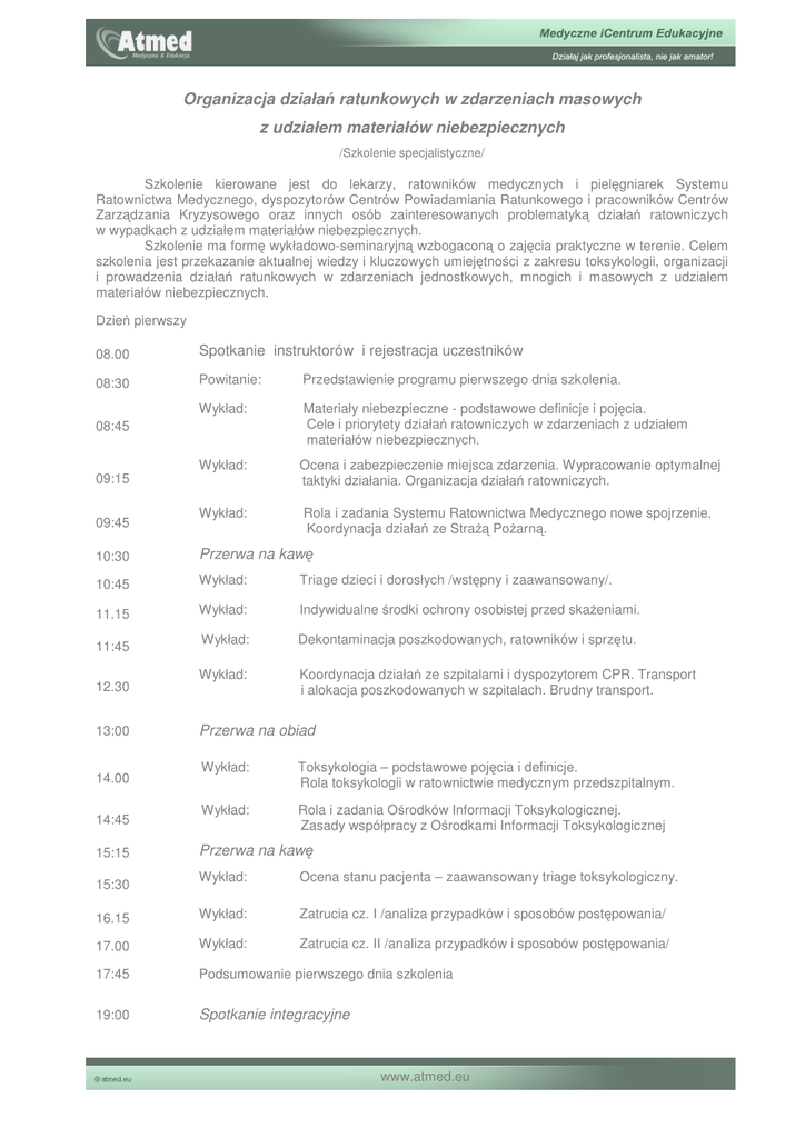 Organizacja działań ratunkowych w zdarzeniach masowych z udziałem materiałów niebezpiecznych /Szkolenie specjalistyczne/ Szkolenie kierowane jest do lekarzy, ratowników medycznych i pielęgniarek Systemu Ratownictwa Medycznego, dyspozytorów Centrów Powiadamiania Ratunkowego i pracowników Centrów Zarządzania Kryzysowego oraz innych osób zainteresowanych problematyką działań ratowniczych w wypadkach z udziałem materiałów niebezpiecznych. Szkolenie ma formę wykładowo-seminaryjną wzbogaconą o zajęcia praktyczne w terenie. Celem szkolenia jest przekazanie aktualnej wiedzy i kluczowych umiejętności z zakresu toksykologii, organizacji i prowadzenia działań ratunkowych w zdarzeniach jednostkowych, mnogich i masowych z udziałem materiałów niebezpiecznych. Dzień pierwszy 08.00 Spotkanie instruktorów i rejestracja uczestników 08:30 Powitanie: Przedstawienie programu pierwszego dnia szkolenia. Wykład: Materiały niebezpieczne - podstawowe definicje i pojęcia. Cele i priorytety działań ratowniczych w zdarzeniach z udziałem materiałów niebezpiecznych. Wykład: Ocena i zabezpieczenie miejsca zdarzenia. Wypracowanie optymalnej taktyki działania. Organizacja działań ratowniczych. Wykład: Rola i zadania Systemu Ratownictwa Medycznego nowe spojrzenie. Koordynacja działań ze Strażą Pożarną. 08:45 09:15 09:45 10:30 Przerwa na kawę 10:45 Wykład: Triage dzieci i dorosłych /wstępny i zaawansowany/. 11.15 Wykład: Indywidualne środki ochrony osobistej przed skażeniami. Wykład: Dekontaminacja poszkodowanych, ratowników i sprzętu. Wykład: Koordynacja działań ze szpitalami i dyspozytorem CPR. Transport i alokacja poszkodowanych w szpitalach. Brudny transport. 11:45 12.30 13:00 14.00 14:45 15:15 Przerwa na obiad Wykład: Toksykologia – podstawowe pojęcia i definicje. Rola toksykologii w ratownictwie medycznym przedszpitalnym. Wykład: Rola i zadania Ośrodków Informacji Toksykologicznej. Zasady współpracy z Ośrodkami Informacji Toksykologicznej Przerwa na kawę Wykład: Ocena stanu pacjenta – zaawansowany triage toksykologiczny. 16.15 Wykład: Zatrucia cz. I /analiza przypadków i sposobów postępowania/ 17.00 Wykład: Zatrucia cz. II /analiza przypadków i sposobów postępowania/ 17:45 Podsumowanie pierwszego dnia szkolenia 19:00 Spotkanie integracyjne 15:30 www.atmed.eu Dzień drugi 09:00 Wprowadzenie do drugiego dnia szkolenia 09:15 – 10:45 Warsztaty: Symulacja zdarzeń i przypadków medycznych /Case study/ Toksykologia cz. I /studium przypadku/ Organizacja działań ratunkowych, budowanie systemu zarządzania 09:15 – 10:00 Grupa 1 Grupa 2 Grupa 3 Grupa 4 10:00 – 10:45 Grupa 3 Grupa 4 Grupa 1 Grupa 2 10:45 Przerwa na kawę 11:00 – 14:00 Warsztaty: Symulacja zdarzenia masowego w terenie Toksykologia cz. II /studium przypadku/ Wstępny triage, dekontaminacja 11:00 – 12:30 12:30 – 14:00 Grupa 2 Grupa 4 Grupa 3 Grupa 1 Grupa 4 Grupa 2 Grupa 1 Grupa 3 Grupa 3 Grupa 1 Grupa 2 Grupa 4 Grupa 1 Grupa 3 Grupa 4 Grupa 2 14:00 – 15:00 Przerwa na obiad 15:00 – 16:00 Warsztaty: Debriefing – analiza przebiegu zdarzenia /wypadku, akcji ratunkowej/ Analiza i ocena przebiegu działań, przyczyn zachowań, pracy zespołów, osiąganych wyników i popełnianych błędów, wrażeń i spostrzeżeń. 15:00 – 16:00 Grupa 1 Grupa 2 Grupa 3 Grupa 4 16:00 – 16:30 TEST: 16:30 – 17:00 Zakończenie: Podsumowanie warsztatów, zakończenie szkolenia i wręczenie dyplomów, ankieta ewaluacyjna, wnioski na przyszłość. 17:00 Indywidualna weryfikacja nabytych wiadomości KONIEC SZKOLENIA Miejsce szkolenia: Centrum Szkoleń Ratowniczych CSR w Limanowej, woj. małopolskie www. csr24.pl Zapraszam na szkolenie dr Arkadiusz Trzos [email protected], tel.; +48 604 266 992 www.atmed.eu