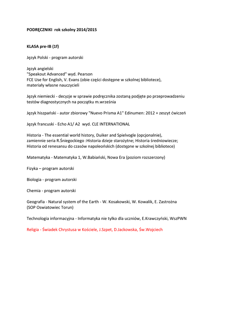 PODRĘCZNIKI rok szkolny 2014/2015 KLASA pre-IB (1f) Język Polski - program autorski Język angielski "Speakout Advanced" wyd. Pearson FCE Use for English, V. Evans (obie części dostępne w szkolnej bibliotece), materiały własne nauczycieli Język niemiecki - decyzje w sprawie podręcznika zostaną podjęte po przeprowadzeniu testów diagnostycznych na początku m.września Język hiszpański - autor zbiorowy "Nuevo Prisma A1" Edinumen: 2012 + zeszyt ćwiczeń Język francuski - Echo A1/ A2 wyd. CLE INTERNATIONAL Historia - The essential world history, Duiker and Spielvogle (opcjonalnie), zamiennie seria R.Śniegockiego :Historia dzieje starożytne; Historia średniowiecze; Historia od renesansu do czasów napoleońskich (dostępne w szkolnej bibliotece) Matematyka - Matematyka 1, W.Babiański, Nowa Era (poziom rozszerzony) Fizyka – program autorski Biologia - program autorski Chemia - program autorski Geografia - Natural system of the Earth - W. Kosakowski, W. Kowalik, E. Zastrożna (SOP Oswiatowiec Torun) Technologia informacyjna - Informatyka nie tylko dla uczniów, E.Krawczyński, WszPWN Religia - Świadek Chrystusa w Kościele, J.Szpet, D.Jackowska, Św.Wojciech KLASY IB (2f, 3f) Polish A1, English A1 - materiały przygotowywane przez nauczycieli prowadzących zajęcia English B English B for the IB Diploma, K. Saa'd Aldin, T.Tempakka, J.Abu Awad, K.Morley, French B HL i SL klasa II Francais B Livre de l'etudiant HL/SL, M.L. Delcallee, Pearson Baccalaureate Klasa III French B Course Companion, Ch.Trumper, Oxford University Press French B for IB Diploma, A.Abrioux, P.Chretien, N.Fayaud, Oxford University Press French Ab Initio SL - ECHO 1/ECHO 2 wyd. CLE German Klasa II – „ Deutsch im Einsatz” Schuulerbuch, Advance Materials Ltd. Klasa III - "Partnersprache 3" - podręcznik + ćwiczenia Spanish SL i HL Rodriguez-Blanco, S., Valbuena, A., "Spanish B course companion", Oxford University Press Spanish ab initio "Nuevo Prisma A1" Edinumen: 2012 + zeszyt ćwiczeń "Nuevo Prisma A2" Edinumen: 2013 + zeszyt ćwiczeń Geography Geography for IB Diploma Course Companion, G.Nagle, B.Cooke History Klasa II i III dwie części serii: The Great Powers ( dostępne w szkolnej bibliotece) Economics HL i SL - Economics for IB Diploma, J.Blink, Oxford IB Study Guide, Economics for IB Diploma, C.Ziogas Workbook for the New IB Economics, exercises, II ed. B.McBride www.bricemcbride.com – podręcznik www.tutor2u.com – podręcznik www.bized.economics.com – materiały pomocnicze Biology HL – A. Damon, W. Ward, Patricia Tosto & Randy McGonegal, Biology Higher Level (Heinemann Baccalaureate) SL – A. Damon, R. McGonegal, P. Tosto & W. Ward, Standard Level Biology for the IB Diploma (Pearson International Baccalaureate Diploma: International Editions) Dodatkowa pozycja (ale nie jest wymagana) A. Allott, Biology for the IB Diploma Study Guide, Oxford Chemistry IB STUDY GUIDES CHEMISTRY FOR THE IB DIPLOMA - G.Neuss-Oxford Higher level / Standard level CHEMISTRY developed specifically for the IB DIPLOMAC. Brown, M.Ford -Heinemann Physics Physics Course Companion, wyd Oxford Mathematics HL - Mathematics HL for IB Diploma SL - Mathematics Standard Level for IB Diploma, 3rd edition, Fabio Cirrito Studies SL - Mathematical studies for IB Diploma Computer Science - Computer Science Illuminated, N.Dale, J.Lewis - materiały przygotowywane przez nauczyciela prowadzącego zajęcia TOK Theory of Knowledge for IB Diploma , R.van de Lagemaat, Theory of Knowledge, E. Dombrowski, L. Rotenberg, M. Beck