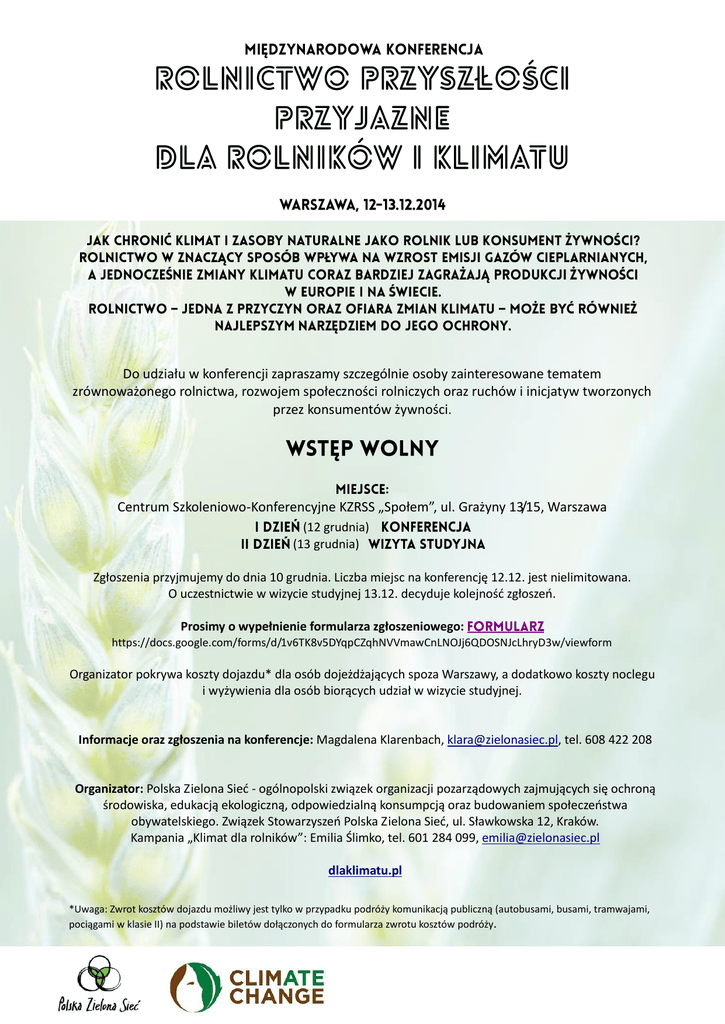 Do udziału w konferencji zapraszamy szczególnie osoby zainteresowane tematem zrównoważonego rolnictwa, rozwojem społeczności rolniczych oraz ruchów i inicjatyw tworzonych przez konsumentów żywności. : Centrum Szkoleniowo-Konferencyjne KZRSS „Społem”, ul. Grażyny 13/15, Warszawa (12 grudnia) (13 grudnia) Zgłoszenia przyjmujemy do dnia 10 grudnia. Liczba miejsc na konferencję 12.12. jest nielimitowana. O uczestnictwie w wizycie studyjnej 13.12. decyduje kolejność zgłoszeń. Prosimy o wypełnienie formularza zgłoszeniowego: https://docs.google.com/forms/d/1v6TK8v5DYqpCZqhNVVmawCnLNOJj6QDOSNJcLhryD3w/viewform Organizator pokrywa koszty dojazdu* dla osób dojeżdżających spoza Warszawy, a dodatkowo koszty noclegu i wyżywienia dla osób biorących udział w wizycie studyjnej. Informacje oraz zgłoszenia na konferencje: Magdalena Klarenbach, [email protected], tel. 608 422 208 Organizator: Polska Zielona Sieć - ogólnopolski związek organizacji pozarządowych zajmujących się ochroną środowiska, edukacją ekologiczną, odpowiedzialną konsumpcją oraz budowaniem społeczeństwa obywatelskiego. Związek Stowarzyszeń Polska Zielona Sieć, ul. Sławkowska 12, Kraków. Kampania „Klimat dla rolników”: Emilia Ślimko, tel. 601 284 099, [email protected] dlaklimatu.pl *Uwaga: Zwrot kosztów dojazdu możliwy jest tylko w przypadku podróży komunikacją publiczną (autobusami, busami, tramwajami, pociągami w klasie II) na podstawie biletów dołączonych do formularza zwrotu kosztów podróży. Prowadzenie: Anotni Bielewicz, European Climate Foundation, redaktor portalu NaukaoKlimacie.pl 10.30 – 11.00 Rejestracja uczestników konferencji 11.00 – 11.30 Przywitanie uczestników i słowo wstępne Joanna Furmaga, Prezes Związku Stowarzyszeń Polska Zielona Sieć Cele i działania polskiej kampanii „Klimat dla rolników” oraz międzynarodowej kampanii ClimATE Change Emilia Ślimko, Związek Stowarzyszeń Polska Zielona Sieć Elisa Delvecchio, COSPE (Włochy) 11.30 – 12.30 Jak rolnictwo wpływa na klimat i zasoby naturalne? Marcin Popkiewicz, autor książki „Świat na rozdrożu”, redaktor portali ZiemiaNaRozdrozu.pl oraz NaukaoKlimacie.pl, fizyk, wykładowca, specjalizuje się w kwestiach energetyki, zasobów naturalnych i zmian klimatu 12.30 – 13.20 Rolnictwo przyjazne dla rolników i klimatu – praktyczne rozwiązania Łukasz Nowacki, Fundacja Transformacja, specjalizuje się w ekohydrologii i biotechnologiach ekosystemowych, popularyzator zrównoważonego rolnictwa oraz nauczyciel permakultury 13.20 – 13.40 Przerwa 13.40 – 14.00 Międzynarodowe działania na rzecz rolnictwa przyjaznego dla klimatu (climate- smart agriculture) Rosario Lembo, CICMA (Włochy) 14.00 – 14.15 Wyzwania dla rolników na Malcie w kontekście zmian klimatu Irene Mangion, KOPIN (Malta) 14.15 – 14.30 Eko-regiony we Włoszech – zintegrowany plan zrównoważonego rozwoju Dalida D’Oppido, AIAB (Włochy) 14.30 – 14.45 Nowe ruchy społeczne wspierające lokalną produkcję i konsumpcję żywności w Niemczech Jan Urhahn, INKOTA (Niemcy) 14.45 – 15.15 Jak rolnicy w krajach globalnego Południa radzą sobie ze zmianami klimatu? Przykłady z Etiopii, Nikaragui i Mozambiku. Irene Mangion, KOPIN (Malta); Jan Urhahn, INKOTA (Niemcy) 15.15 – 15.30 Przerwa 15.30 – 17.00 Panel dyskusyjny: Jak promować zrównoważone rolnictwo w Polsce? Wyzwania oraz przykłady inicjatyw rolniczych i konsumenckich Katarzyna Jagiełło, Greenpeace Polska Maria Staniszewska, Polski Klub Ekologiczny Sonia Priwieziencew, Społeczny Instytut Ekologiczny Piotr Trzaskowski, Warszawska Kooperatywa Spożywcza 17.00 Pokaz filmu „W Koopie siła!” Polskiej Zielonej Sieci (10 min.) i zakończenie konferencji 08.30 - Wyjazd autokarem spod Centrum Szkoleniowo-Konferencyjnego KZRSS „Społem” ul. Grażyny 13/15 09.45 - Przyjazd do gospodarstwa ekologicznego w Wiśniewie / gmina Ostrów Mazowiecka 11.30 - Przejazd do gospodarstwa ekologicznego w Rososzy / gmina Wąsewo 13.30 - Przejazd do gospodarstwa ekologicznego w Kruszewie / gmina Goworowo 16.00 - Wyjazd do Warszawy 17.00 - Przyjazd do Warszawy Mapa miejsca konferencji: http://bit.ly/1vOn5I2 Dofinansowano ze środków Narodowego Funduszu Ochrony Środowiska i Gospodarki Wodnej oraz Unii Europejskiej. Kampania „Klimat dla rolników” jest odpowiedzią na współczesne wyzwania związane z wzajemnym wpływaniem na siebie zmian klimatu i rolnictwa. Wpisuje się on w trwające obecnie na świecie dyskusje i działania dotyczące ograniczania wpływu człowieka na zmiany klimatu oraz adaptacji do ich skutków. Są to jedne z najważniejszych problemów globalnych naszych czasów. Skutki ocieplania się klimatu dotykają nie tylko społeczeństwa krajów rozwijających się, ale cały świat, w tym Europę i Polskę. W Polsce wpływ zmian klimatu na rolnictwo widoczny jest głównie w postaci takich zjawisk, jak: nasilenie się opadów atmosferycznych zimą, a zmniejszenie latem, przedłużające się susze, erozja gleb, rozprzestrzenianie się szkodników i chorób roślin, przedłużony okres wegetacji roślin w niektórych regionach, gwałtowne zjawiska pogodowe. Jednocześnie rolnictwo w znaczący sposób przyczynia się do zmian klimatu. Pomimo działań Unii Europejskiej mających na celu zmniejszenie emisji gazów cieplarnianych pochodzącej z rolnictwa, dominujący obecnie system produkcji żywności nie sprzyja ochronie klimatu, bioróżnorodności i zasobów naturalnych. Obserwujemy wzrastające zapotrzebowanie na nowe i innowacyjne podejścia w zakresie zmniejszania dalszego negatywnego wpływu działalności rolniczej na klimat oraz adaptacji do postępujących zmian. Jest to szczególnie istotne dla rolników, którzy wytwarzają pożywienie dla społeczności lokalnych oraz konsumentów w miastach. Odpowiedzią na zmiany klimatu w obszarze rolnictwa jest przestawienie systemu produkcji żywności na rolnictwo zrównoważone, które w 