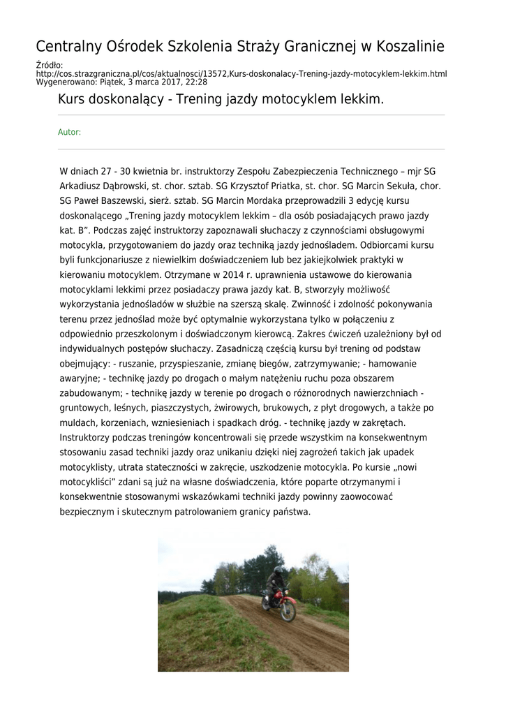 Centralny Ośrodek Szkolenia Straży Granicznej w Koszalinie Źródło: http://cos.strazgraniczna.pl/cos/aktualnosci/13572,Kurs-doskonalacy-Trening-jazdy-motocyklem-lekkim.html Wygenerowano: Piątek, 3 marca 2017, 22:28 Kurs doskonalący - Trening jazdy motocyklem lekkim. Autor: W dniach 27 - 30 kwietnia br. instruktorzy Zespołu Zabezpieczenia Technicznego – mjr SG Arkadiusz Dąbrowski, st. chor. sztab. SG Krzysztof Priatka, st. chor. SG Marcin Sekuła, chor. SG Paweł Baszewski, sierż. sztab. SG Marcin Mordaka przeprowadzili 3 edycję kursu doskonalącego „Trening jazdy motocyklem lekkim – dla osób posiadających prawo jazdy kat. B”. Podczas zajęć instruktorzy zapoznawali słuchaczy z czynnościami obsługowymi motocykla, przygotowaniem do jazdy oraz techniką jazdy jednośladem. Odbiorcami kursu byli funkcjonariusze z niewielkim doświadczeniem lub bez jakiejkolwiek praktyki w kierowaniu motocyklem. Otrzymane w 2014 r. uprawnienia ustawowe do kierowania motocyklami lekkimi przez posiadaczy prawa jazdy kat. B, stworzyły możliwość wykorzystania jednośladów w służbie na szerszą skalę. Zwinność i zdolność pokonywania terenu przez jednoślad może być optymalnie wykorzystana tylko w połączeniu z odpowiednio przeszkolonym i doświadczonym kierowcą. Zakres ćwiczeń uzależniony był od indywidualnych postępów słuchaczy. Zasadniczą częścią kursu był trening od podstaw obejmujący: - ruszanie, przyspieszanie, zmianę biegów, zatrzymywanie; - hamowanie awaryjne; - technikę jazdy po drogach o małym natężeniu ruchu poza obszarem zabudowanym; - technikę jazdy w terenie po drogach o różnorodnych nawierzchniach gruntowych, leśnych, piaszczystych, żwirowych, brukowych, z płyt drogowych, a także po muldach, korzeniach, wzniesieniach i spadkach dróg. - technikę jazdy w zakrętach. Instruktorzy podczas treningów koncentrowali się przede wszystkim na konsekwentnym stosowaniu zasad techniki jazdy oraz unikaniu dzięki niej zagrożeń takich jak upadek motocyklisty, utrata stateczności w zakręcie, uszkodzenie motocykla. Po kursie „nowi motocykliści” zdani są już na własne doświadczenia, które poparte otrzymanymi i konsekwentnie stosowanymi wskazówkami techniki jazdy powinny zaowocować bezpiecznym i skutecznym patrolowaniem granicy państwa. 2015/05/20150504.jpg
