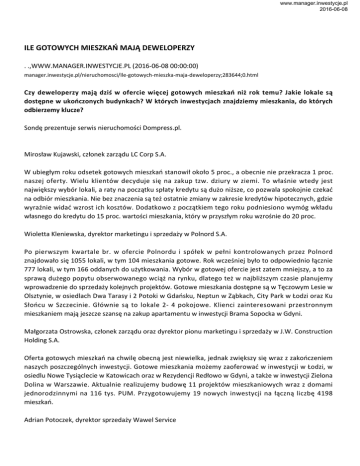 www.manager.inwestycje.pl 2016-06-08 ILE GOTOWYCH MIESZKAŃ MAJĄ DEWELOPERZY . .,WWW.MANAGER.INWESTYCJE.PL (2016-06-08 00:00:00) manager.inwestycje.pl/nieruchomosci/Ile-gotowych-mieszka-maja-deweloperzy;283644;0.html Czy deweloperzy mają dziś w ofercie więcej gotowych mieszkań niż rok temu? Jakie lokale są dostępne w ukończonych budynkach? W których inwestycjach znajdziemy mieszkania, do których odbierzemy klucze? Sondę prezentuje serwis nieruchomości Dompress.pl. Mirosław Kujawski, członek zarządu LC Corp S.A. W ubiegłym roku odsetek gotowych mieszkań stanowił około 5 proc., a obecnie nie przekracza 1 proc. naszej oferty. Wielu klientów decyduje się na zakup tzw. dziury w ziemi. To właśnie wtedy jest największy wybór lokali, a raty na początku spłaty kredytu są dużo niższe, co pozwala spokojnie czekać na odbiór mieszkania. Nie bez znaczenia są też ostatnie zmiany w zakresie kredytów hipotecznych, gdzie wyraźnie widać wzrost ich kosztów. Dodatkowo z początkiem tego roku podniesiono wymóg wkładu własnego do kredytu do 15 proc. wartości mieszkania, który w przyszłym roku wzrośnie do 20 proc. Wioletta Kleniewska, dyrektor marketingu i sprzedaży w Polnord S.A. Po pierwszym kwartale br. w ofercie Polnordu i spółek w pełni kontrolowanych przez Polnord znajdowało się 1055 lokali, w tym 104 mieszkania gotowe. Rok wcześniej było to odpowiednio łącznie 777 lokali, w tym 166 oddanych do użytkowania. Wybór w gotowej ofercie jest zatem mniejszy, a to za sprawą dużego popytu obserwowanego wciąż na rynku, dlatego też w najbliższym czasie planujemy wprowadzenie do sprzedaży kolejnych projektów. Gotowe mieszkania dostępne są w Tęczowym Lesie w Olsztynie, w osiedlach Dwa Tarasy i 2 Potoki w Gdańsku, Neptun w Ząbkach, City Park w Łodzi oraz Ku Słońcu w Szczecinie. Głównie są to lokale 2- 4 pokojowe. Klienci zainteresowani przestronnym mieszkaniem mają jeszcze szansę na zakup apartamentu w inwestycji Brama Sopocka w Gdyni. Małgorzata Ostrowska, członek zarządu oraz dyrektor pionu marketingu i sprzedaży w J.W. Construction Holding S.A. Oferta gotowych mieszkań na chwilę obecną jest niewielka, jednak zwiększy się wraz z zakończeniem naszych poszczególnych inwestycji. Gotowe mieszkania możemy zaoferować w inwestycji w Łodzi, w osiedlu Nowe Tysiąclecie w Katowicach oraz w Rezydencji Redłowo w Gdyni, a także w inwestycji Zielona Dolina w Warszawie. Aktualnie realizujemy budowę 11 projektów mieszkaniowych wraz z domami jednorodzinnymi na 116 tys. PUM. Przygotowujemy 19 nowych inwestycji na łączną liczbę 4198 mieszkań. Adrian Potoczek, dyrektor sprzedaży Wawel Service www.manager.inwestycje.pl 2016-06-08 Mieszkania w naszych inwestycjach sprzedają się zazwyczaj już na etapie budowy, dlatego obecnie liczba gotowych mieszkań w Wawel Service jest znikoma i wynosi ok. 20 lokali. Wybór ukończonych mieszkań zmniejszył się w porównaniu z poprzednim rokiem, jednak wszystko uzależnione jest od ilości poczynionych przez nas inwestycji i liczby uruchomionych sprzedaży. Marcin Liberski, dyrektor sprzedaży i marketingu w Atlas Estates W zeszłym roku mieliśmy w ofercie większą liczbę gotowych mieszkań niż w tym roku, co wynika z tego, że realizowane przez nas inwestycje zostały w większości już sprzedane. Aktualnie gotowe mieszkania posiadamy w dwóch warszawskich inwestycjach o podwyższonym standardzie. W inwestycji ConceptHouse Mokotów pozostały dwa ostatnie, czteropokojowe mieszkania o powierzchni 158 mkw. i 165 mkw. Są to dwupoziomowe apartamenty, które wyróżniają się funkcjonalnym rozkładem, umożliwiającym łatwą aranżację wnętrz z podziałem na strefy gościnną oraz prywatną. W inwestycji Capital Art Apartments przy ul. Giełdowej zostały dwa apartamenty o powierzchni ok. 116 mkw. z ponad 29 metrowymi tarasami oraz 37 metrowy lokal z możliwością zaaranżowania na dwa pokoje. Marcin Mielcarz, wiceprezes zarządu Grupy Inwest Posiadamy w ofercie ok. 300 mkw. PUM w mieszkaniach trzy i czteropokojowych w oddanym do użytkowania budynku przy ulicy Siedleckiej 60 na warszawskiej Pradze Północ. W ostatnich kilkunastu miesiącach rozpoczęliśmy budowę 5 nowych inwestycji o łącznej powierzchni ok. 8.000 mkw. PUM, w których mieszkania sprzedają się błyskawicznie we wczesnej fazie budowy. W przypadku inwestycji Garibaldiego 5 przy Rondzie Wiatraczna w Warszawie możemy poszczycić się sprzedażą na poziomie 70 proc. na etapie stanu „0” budynku. Janusz Miller, dyrektor ds. sprzedaży i marketingu Home Invest Aktualnie mamy w ofercie mniej gotowych mieszkań niż rok temu. W większości przypadków mieszkania sprzedają się na etapie budowy. W momencie oddania inwestycji do użytkowania w ofercie zostaje przeważnie tylko kilka mieszkań, jak to jest na przykład w naszym osiedlu Krasińskiego 58 na warszawskim Żoliborzu. W inwestycji dostępne są ostatnie, gotowe mieszkania w cenie od 7293 zł/mkw. z miejscem postojowym, które teraz oferujemy w promocji z 50 proc. rabatem. Jacek Bielecki, dyrektor ds. rozwoju i jakości Marvipol S.A. Gotowych mieszkań w Marvipolu jest już niewiele, mniej niż rok temu. Posiadamy je jedynie w warszawskiej inwestycji Central Park Ursynów. Pewna pula mieszkań gotowych będzie do nabycia od sierpnia tego roku, gdy ukończymy kolejny etap tego osiedla. Zuzanna Kordzi, dyrektor ds. handlowych w ECO Classic Oferta mieszkań gotowych w naszych inwestycjach jest znacznie mniejsza niż w porównywalnym okresie ubiegłego roku. Gotowe mieszkania oferujemy w inwestycji Hubertus na warszawskim Służewcu oraz www.manager.inwestycje.pl 2016-06-08 Wolne Miasto w Gdańsku. W Hubertusie mamy jeszcze mieszkania 3 i 4 pokojowe, a niebawem zostanie zakończony ostatni etap tej inwestycji, w którym dostępne są także mieszkania dwupokojowe. W gdańskiej inwestycji Wolne Miasto pozostały większe mieszkania. Maria Doerre, dyrektor sprzedaży i