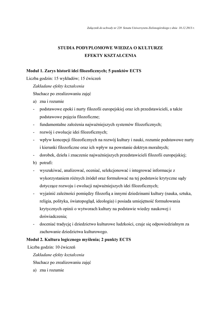 Załącznik do uchwały nr 220 Senatu Uniwersytetu Zielonogórskiego z dnia 18.12.2013 r. STUDIA PODYPLOMOWE WIEDZA O KULTURZE EFEKTY KSZTAŁCENIA Moduł 1. Zarys historii idei filozoficznych; 5 punktów ECTS Liczba godzin: 15 wykładów; 15 ćwiczeń Zakładane efekty kształcenia Słuchacz po zrealizowaniu zajęć a) zna i rozumie - podstawowe epoki i nurty filozofii europejskiej oraz ich przedstawicieli, a także podstawowe pojęcia filozoficzne; - fundamentalne założenia najważniejszych systemów filozoficznych; - rozwój i ewolucje idei filozoficznych; - wpływ koncepcji filozoficznych na rozwój kultury i nauki, rozumie podstawowe nurty i kierunki filozoficzne oraz ich wpływ na powstanie doktryn moralnych; - dorobek, dzieła i znaczenie najważniejszych przedstawicieli filozofii europejskiej; b) potrafi: - wyszukiwać, analizować, oceniać, selekcjonować i integrować informacje z wykorzystaniem różnych źródeł oraz formułować na tej podstawie krytyczne sądy dotyczące rozwoju i ewolucji najważniejszych idei filozoficznych; - wyjaśnić zależności pomiędzy filozofią a innymi dziedzinami kultury (nauka, sztuka, religia, polityka, światopogląd, ideologia) i posiada umiejętność formułowania krytycznych opinii o wytworach kultury na podstawie wiedzy naukowej i doświadczenia; - doceniać tradycję i dziedzictwo kulturowe ludzkości, czuje się odpowiedzialnym za zachowanie dziedzictwa kulturowego. Moduł 2. Kultura logicznego myślenia; 2 punkty ECTS Liczba godzin: 10 ćwiczeń Zakładane efekty kształcenia Słuchacz po zrealizowaniu zajęć a) zna i rozumie - podstawowe typy wyrażeń, elementarne typy czynności wiedzotwórczych oraz główne sposoby uzasadniania twierdzeń i rozumie ich specyfikę; - zasady poprawnego rozumowania, argumentowania, definiowania oraz klasyfikowania b) potrafi - analizować proste rozumowania, ustalając ich strukturę i oceniając poprawność oraz potrafi wykorzystywać logikę w praktycznym rozumowaniu; - precyzyjnie i racjonalnie uzasadniać własne poglądy. Moduł 3. Filozofia kultury; 3 punkty ECTS Liczba godzin: 15 wykładów Zakładane efekty kształcenia Słuchacz po zrealizowaniu zajęć a) zna i rozumie: - podstawową terminologię z zakresu filozofii kultury; - podstawowe problemy, historię filozofii kultury; b) potrafi: - umiejscowić filozofię kultury na tle tradycji filozoficznej; - wskazać główne zagadnienia filozofii kultury; - posługiwać się pojęciami z zakresu filozofii kultury; - wykorzystywać wiedzę z zakresu danego przedmiotu w interpretacji zjawisk kulturowych. Moduł 4. Antropologia kulturowa z elementami socjologii kultury; 5 punktów ECTS Liczba godzin: 15 wykładów; 15 ćwiczeń Zakładane efekty kształcenia Słuchacz po zrealizowaniu zajęć a) zna i rozumie: - podstawową terminologię z zakresu antropologii kulturowej oraz socjologii kultury; - pojęcia kulturowy i kulturalny; b) potrafi: - lokować wytwory kultury (zachowania, zwyczaje, normy moralne, wytwory materialne, dzieła sztuki) w kontekście grup społecznych, w których są tworzone i odbierane (rodzina, grupy rówieśnicze, społeczność lokalna, naród); - odróżnić pojęcie kultury rozumianej jako dorobek artystyczny od kultury rozumianej jako całokształt dorobku ludzkości, - odnieść elementy kultury (zachowania, zwyczaj, praktyki, przedmioty materialne, dzieła sztuki) do kategorii: czas przestrzeń, ciało, grupa społeczna (rodzina, rówieśnicy, społeczność lokalna, naród); - interpretować praktyki kultury z najbliższego otoczenia własnego oraz ucznia (klasa szkolna, szkoła, rodzina, osiedle, podwórko, miasto, kościół, stadion piłkarski, zakład pracy). Moduł 5. Historia kultury europejskiej; 3 punkty ECTS Liczba godzin: 15 wykładów; Zakładane efekty kształcenia Słuchacz po zrealizowaniu zajęć a) zna i rozumie: - podstawowe pojęcia z zakresu kultury europejskiej; - mechanizmy kształtowania się kultury europejskiej. b) potrafi: - wskazać relacje między kulturami: lokalną, regionalną, narodową i europejską, ujawniające się w konkretnych dziełach sztuki i praktykach kulturowych; - scharakteryzować specyfikę kultury europejskiej; - wskazać relacje między kulturą europejską a pozaeuropejską. Moduł 6. Regionalne dziedzictwo kulturowe; 3 punkty ECTS Liczba godzin: 15 ćwiczeń Zakładane efekty kształcenia Słuchacz po zrealizowaniu zajęć a) zna i rozumie: - podstawową terminologię z zakresu regionalnego dziedzictwa kulturowego; - zależności między narodowym a regionalnym dziedzictwem narodowym; - regionalnych twórców kultury i ich dorobek. b) potrafi: - dbać o regionalne dziedzictwo narodowe; - zainteresować młodych odbiorców, uczniów regionalnymi wytworami kultury; - przygotować wycieczkę dla grupy osób pozwalającą poznać specyficzne wytwory kultury regionalnej. Moduł 7. Historia sztuki; 5 punktów ECTS Liczba godzin: 15 wykładów, 15 ćwiczeń Zakładane efekty kształcenia Słuchacz po zrealizowaniu zajęć a) zna i rozumie: - podstawowe pojęcia z historii sztuki; - różnorodne dzieła reprezentujące różne dziedziny sztuki (literaturę, architekturę, plastykę, muzykę, teatr, fotografię, film, sztukę nowych mediów) i dostrzega związki między nimi; - posiada wiedzę na temat różnych stylów i epok; b) potrafi: - wskazać różne funkcje dzieła sztuki (estetyczną, społeczną, komunikacyjną, użytkową, kultową, poznawczą, ludyczną); - analizować temat dzieła oraz treści i formę w kontekście jego różnych funkcji, wykorzystując podstawowe wiadomości o stylach i epokach z różnych dziedzin sztuki; - analizować film lub spektakl teatralny, posługując się pojęciami z zakresu właściwej dziedziny sztuki; - dostrzega i nazywa związek między dziełem a sytuacją społeczno-historyczną i obyczajami epoki, w której powstało; - charakteryzować podstawowe media kultury (słowo, obraz, dźwięk, widowisko). Moduł 8. Relig