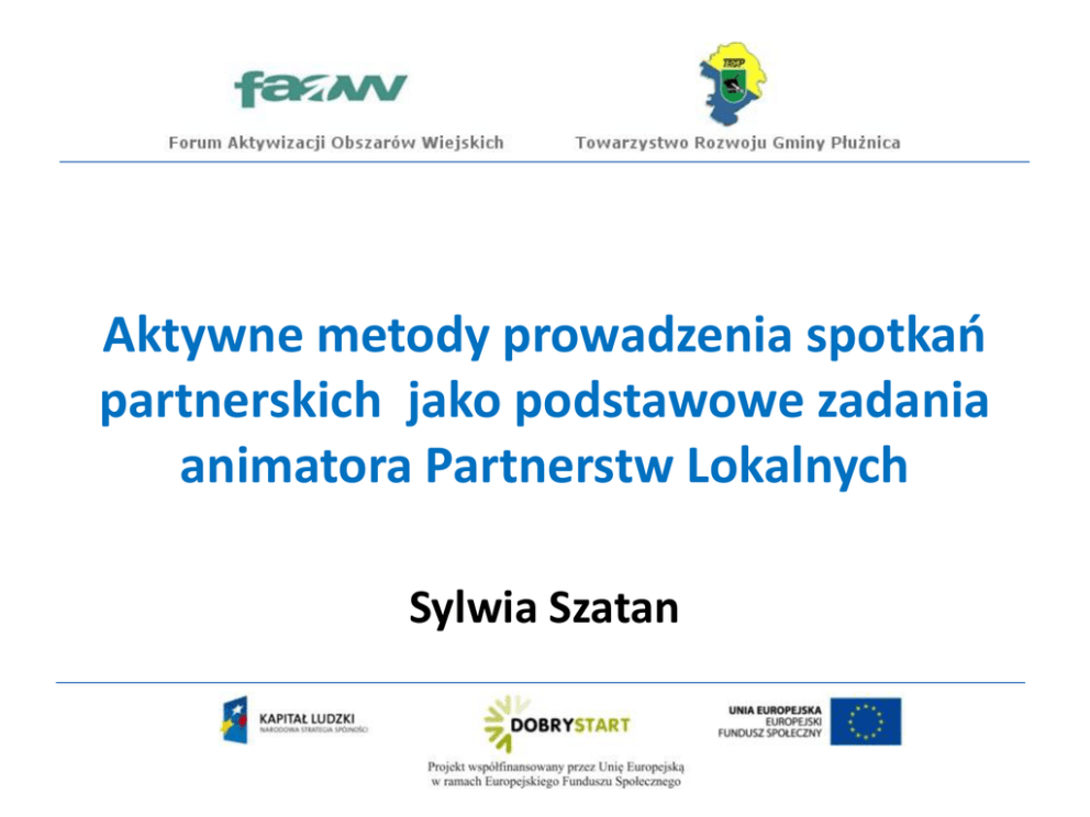 Aktywne metody prowadzenia spotkao partnerskich jako podstawowe zadania animatora Partnerstw Lokalnych Sylwia Szatan Przegląd wybranych metod - Metody integrujące, tzw. „lodołamacze”, aktywizujące, koncentrujące - Metody przekazywania informacji: wykład, prezentacja, materiały audiowizualne, teksty do czytania i analizowania. - Metody rozwiązywania problemów: dyskusja, burza mózgów, technika rybiego szkieletu, metoda delficka, metaplan, analiza kosztów i korzyści, analiza przypadku, zebranie i interpretacja danych, metoda ZWI itd. - Metody doskonalenia umiejętności: analiza przypadku, odgrywanie ról, symulacja. - Metody podejścia kreatywnego Metody podejścia kreatywnego - Burza mózgów - Wolne skojarzenia - Mapy myśli - Mapy problemów, drzewa problemów - Lista pytao - Gra w role - Improwizacje - Opowiadanie - Rysunki - Metafory, analogie, wyobrażenia Mapa myśli- poszukiwanie nowych znaczeo 1. Temat przewodni 2. Wyszukiwanie krok po kroku luźnych skojarzeo 3. Wybór najciekawszych skojarzeo, pomysłów Zasady prowadzenia dyskusji - Ustalenie celu i zasad dyskusji przez prowadzącego. - Zainicjowanie wymiany poglądów – zadanie co najmniej jednego pytania otwartego. - Trzymanie się głównego tematu. - Kontrolowanie czasu. - Uważanie na dominantów. - Zachęcanie do wypowiedzi mniej śmiałych uczestników. - Nie ocenianie wypowiedzi innych. - Podsumowanie dyskusji. Zasady prowadzenia dyskusji 1. Zadawanie pytao - Zdobyd informacje - Wyjaśnid - Zachęcid - Przeanalizowad 2. Udzielanie głosu - Umożliwid wypowiedzenie wszystkich opinii 3. Tworzenie przestrzeni - Umożliwid wypowiedzenie opinii osobom milczącym 4. Porządkowanie dyskusji - Powiązad wątki - Uogólnid - Wyciągnąd wnioski Zasady prowadzenia dyskusji 5. Potwierdzanie - Zachęcid - Okazad zainteresowanie 6. Lustrzane odbicie (dokładne odtworzenie wypowiedzi) - Podkreślid swoją neutralnośd - Zbudowad zaufanie - Pokazad, że słuchasz - Wzmocnid zaangażowanie uczestników 7. Parafraza (powtórzenie wypowiedzi własnymi słowami) - Pokazad, że słuchasz i koncentrujesz się - Sprawdzid czy dobrze rozumiesz Intencje - Uporządkowad dyskusję - Nagłośnid wypowiedź 8. Parking (zaakceptowad, zapisad, odłożyd) Wrócid do tematu dyskusji Zasady burzy mózgów - ustalenie tematu burzy mózgów - podanie zasad uczestnikom: - ustalenie limitu czasu - ustalenie norm - ustalenie formy zapisywania - energiczne, optymistyczne prowadzenie - po zakooczeniu burzy wyłonienie najlepszych pomysłów Rozwiązywanie problemów metodą metaplanu Krok 1 – przedstawienie problemu do rozwiązania Krok 2 – przeprowadzenie dyskusji i zapisanie wyników na 4 planszach: - Jak jest? - Dlaczego nie jest, tak jak powinno byd? - Ja powinno byd? - Co zrobid, aby to osiągnąd? Krok 3 – znalezienie wspólnego dla całej grupy rozwiązania Technika „rybiego szkieletu” Krok 1 – zapisanie / sformułowanie problemu (ogon) Krok 2 – uzgodnienie kategorii ości Krok 3 - wypełnienie ości (przyczyny) Krok 4 – wypisanie możliwych rozwiązao (głowa) Krok 5 – wybór najlepszych rozwiązao Trzy krzesła – technika kreatywności Technika polegająca na wcielaniu się w trzy role: marzyciela, realisty i krytyka Trzy różne sposoby myślenia, podejścia zakotwiczamy z trzema miejscami: krzesła, pokoje 1. Krzesło marzyciela: stawianie rzeczy na głowie, fantazyjne pomysły, szalone związki 2. Krzesło realisty: opracowanie szalonych pomysłów marzyciela, można czerpad z nich inspirację, należy wybrad najkrótszą i najefektywniejszą drogę 3. Krzesło krytyka: poddanie pomysłów bezlitosnej krytyce Czy pomysł ma cos w sobie, czy da się wykorzystad, opłaca się, co jest zbędne, co trzeba wyrzucid Kapelusz de Bono Kapelusze lub karty w różnych kolorach Biały kapelusz – neutralny, jakie informacje posiadasz, jakich potrzebujesz Czerwony kapelusz – ogieo i ciepło, co czujesz i jaką masz intuicję odnośnie danego problemu Czarny kapelusz – krytyka i namysł, unikanie błędów ostrożnośd, uwaga Żółty kapelusz – blask słooca postawa optymistyczna, zalety projektu Zielony kapelusz – wzrost i rozwój, nowe twórcze pomysły, różne alternatywy Niebieski kapelusz – niebo i perspektywa z lotu ptaka. Spojrzenie ponad uprzedzeniami i obiektywizm. W trakcie dyskusji kapelusz ustala priorytety. Definiuje tematy, podsumowuje Lista Osborna – technika kreatywności Tworzenie nowych rozwiązao i ulepszanie istniejących pomysłów/produktów: - Inaczej wykorzystad – czy istnieje inna możliwośd wykorzystania tej rzeczy - Dopasowad – co jest podobne do tego pomysłu - Zmienid – czy możesz zmienid znaczenie, kolor, ruch, wielkośd, kształt, dźwięk, zapach. - Powiększyd – czy da się to powiększyd, wzmocnid, dodad - Zmniejszyd - czy da się zmniejszyd, ująd. - Zastąpid – co można wymienid w tym pomyśle - Przestawid – przestawid części - Odwrócid – przeciwieostwo projektu - Kombinowad –połączenie pomysłu z innymi pomysłami, włączyd, rozłożyd na czynniki pierwsze - Transformowad – podziurawid, zwinąd, upłynnid utwardzid • Kontakt Centrum Wsparcia i informacji organizacji pozarządowych w Legnicy Fundacja Ekologiczna „Zielona Akcja” Aleja Orła Białego 2 59-220 Legnica tel. 076 862 94 30 fax. 076 721 24 96 [email protected] Dziękuję • Kontakt Centrum Wsparcia i informacji organizacji pozarządowych w Legnicy Fundacja Ekologiczna „Zielona Akcja” Aleja Orła Białego 2 59-220 Legnica tel. 076 862 94 30 fax. 076 721 24 96 [email protected]