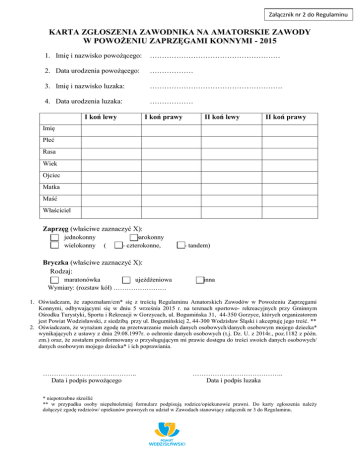 Załącznik nr 2 do Regulaminu KARTA ZGŁOSZENIA ZAWODNIKA NA AMATORSKIE ZAWODY W POWOŻENIU ZAPRZĘGAMI KONNYMI - 2015 1. Imię i nazwisko powożącego: ……………………………………………… 2. Data urodzenia powożącego: ……………… 3. Imię i nazwisko luzaka: ………………………………………………. 4. Data urodzenia luzaka: ……………… I koń lewy I koń prawy II koń lewy II koń prawy Imię Płeć Rasa Wiek Ojciec Matka Maść Właściciel Zaprzęg (właściwe zaznaczyć X): jednokonny wielokonny ( parokonny - czterokonne, - tandem) Bryczka (właściwe zaznaczyć X): Rodzaj: maratonówka ujeżdżeniowa Wymiary: (rozstaw kół) …………………… inna 1. Oświadczam, że zapoznałam/em* się z treścią Regulaminu Amatorskich Zawodów w Powożeniu Zaprzęgami Konnymi, odbywającymi się w dniu 5 września 2015 r. na terenach sportowo- rekreacyjnych przy Gminnym Ośrodku Turystyki, Sportu i Rekreacji w Gorzycach, ul. Bogumińska 31, 44-350 Gorzyce, których organizatorem jest Powiat Wodzisławski, z siedzibą przy ul. Bogumińskiej 2, 44-300 Wodzisław Śląski i akceptuję jego treść. ** 2. Oświadczam, że wyrażam zgodę na przetwarzanie moich danych osobowych/danych osobowym mojego dziecka* wynikających z ustawy z dnia 29.08.1997r. o ochronie danych osobowych (t.j. Dz. U. z 2014r., poz.1182 z późn. zm.) oraz, że zostałem poinformowany o przysługującym mi prawie dostępu do treści swoich danych osobowych/ danych osobowym mojego dziecka* i ich poprawiania. …………..……………………….. Data i podpis powożącego ………………………………….. Data i podpis luzaka * niepotrzebne skreślić ** w przypadku osoby niepełnoletniej formularz podpisują rodzice/opiekunowie prawni. Do karty zgłoszenia należy dołączyć zgodę rodziców/ opiekunów prawnych na udział w Zawodach stanowiący załącznik nr 3 do Regulaminu.