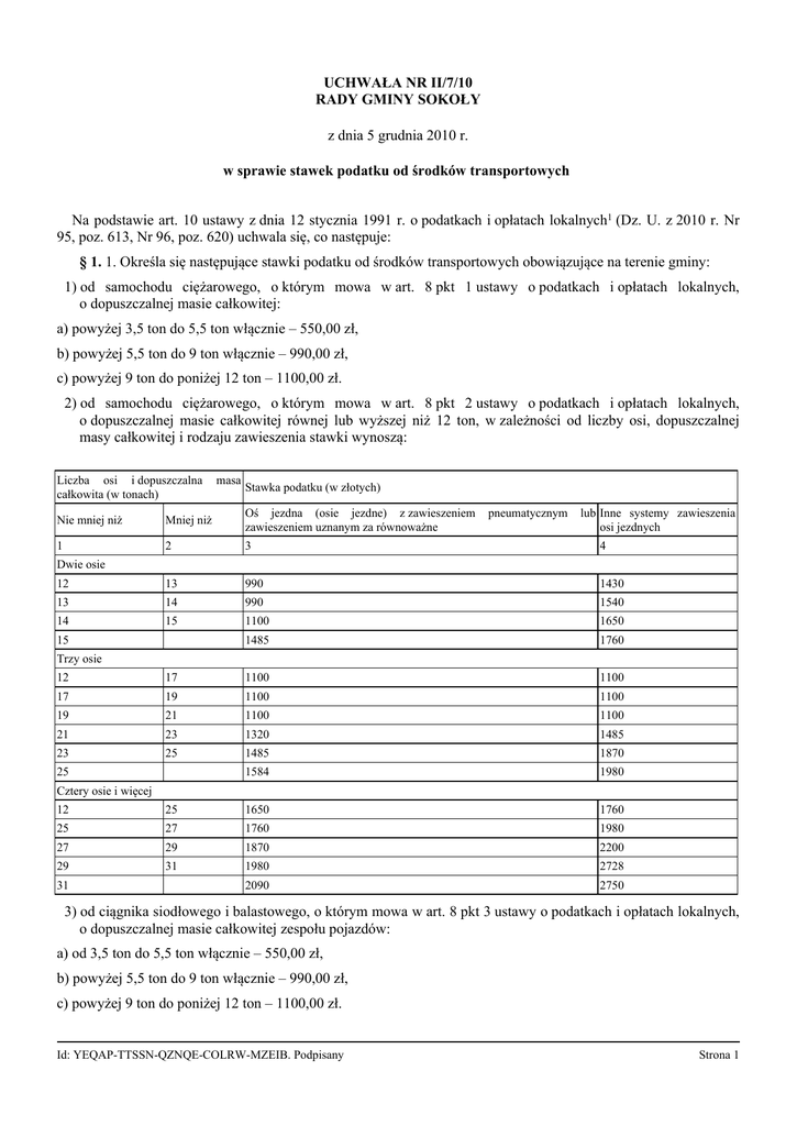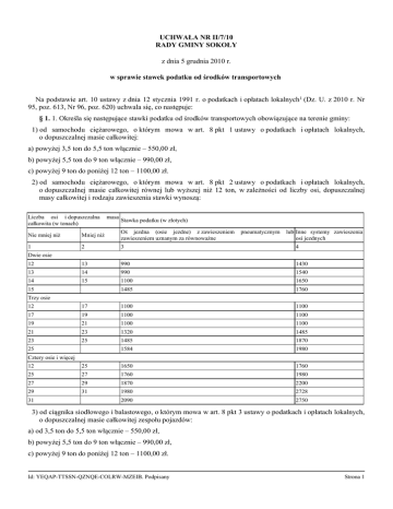 UCHWAŁA NR II/7/10 RADY GMINY SOKOŁY z dnia 5 grudnia 2010 r. w sprawie stawek podatku od środków transportowych Na podstawie art. 10 ustawy z dnia 12 stycznia 1991 r. o podatkach i opłatach lokalnych1 (Dz. U. z 2010 r. Nr 95, poz. 613, Nr 96, poz. 620) uchwala się, co następuje: § 1. 1. Określa się następujące stawki podatku od środków transportowych obowiązujące na terenie gminy: 1) od samochodu ciężarowego, o którym mowa w art. 8 pkt 1 ustawy o podatkach i opłatach lokalnych, o dopuszczalnej masie całkowitej: a) powyżej 3,5 ton do 5,5 ton włącznie – 550,00 zł, b) powyżej 5,5 ton do 9 ton włącznie – 990,00 zł, c) powyżej 9 ton do poniżej 12 ton – 1100,00 zł. 2) od samochodu ciężarowego, o którym mowa w art. 8 pkt 2 ustawy o podatkach i opłatach lokalnych, o dopuszczalnej masie całkowitej równej lub wyższej niż 12 ton, w zależności od liczby osi, dopuszczalnej masy całkowitej i rodzaju zawieszenia stawki wynoszą: Liczba osi i dopuszczalna całkowita (w tonach) masa Stawka podatku (w złotych) Nie mniej niż Mniej niż Oś jezdna (osie jezdne) z zawieszeniem zawieszeniem uznanym za równoważne pneumatycznym lub Inne systemy zawieszenia osi jezdnych 1 2 3 4 12 13 990 1430 13 14 990 1540 14 15 1100 1650 1485 1760 Dwie osie 15 Trzy osie 12 17 1100 1100 17 19 1100 1100 19 21 1100 1100 21 23 1320 1485 23 25 1485 1870 1584 1980 25 Cztery osie i więcej 12 25 1650 1760 25 27 1760 1980 27 29 1870 2200 29 31 1980 2728 2090 2750 31 3) od ciągnika siodłowego i balastowego, o którym mowa w art. 8 pkt 3 ustawy o podatkach i opłatach lokalnych, o dopuszczalnej masie całkowitej zespołu pojazdów: a) od 3,5 ton do 5,5 ton włącznie – 550,00 zł, b) powyżej 5,5 ton do 9 ton włącznie – 990,00 zł, c) powyżej 9 ton do poniżej 12 ton – 1100,00 zł. Id: YEQAP-TTSSN-QZNQE-COLRW-MZEIB. Podpisany Strona 1 4) od ciągnika siodłowego i balastowego, o którym mowa w art. 8 pkt 4 ustawy o podatkach i opłatach lokalnych, o dopuszczalnej masie całkowitej zespołu pojazdów równej lub wyższej niż 12 ton w zależności od liczby osi, dopuszczalnej masy całkowitej zespołu pojazdów i rodzaju zawieszenia, stawki podatku wynoszą: Liczba osi i dopuszczalna masa całkowita zespołu pojazdów: ciągnik siodłowy + naczepa, ciągnik balastowy + przyczepa (w Stawka podatku (w złotych) tonach) Nie mniej niż Mniej niż Oś jezdna (osie jezdne) z zawieszeniem Inne systemy pneumatycznym lub zawieszeniem uznanym za zawieszenia osi równoważne jezdnych 1 2 3 4 12 18 1100 1100 18 25 1100 1100 25 31 1650 1870 1870 2209 1980 2200 2200 2858 Dwie osie 31 Trzy osie i więcej 12 40 40 5) od przyczep i naczep, o których mowa w art. 8 pkt 5 ustawy o podatkach i opłatach lokalnych, które łącznie z pojazdem silnikowym posiadają dopuszczalną masę całkowitą od 7 ton i poniżej 12 ton (z wyjątkiem związanych z działalnością rolniczą prowadzoną przez podatnika podatku rolnego) – 770,00 zł. 6) od przyczep i naczep, o których mowa w art. 8 pkt 6 ustawy o podatkach i opłatach lokalnych (z wyjątkiem związanych wyłącznie z działalnością rolniczą prowadzoną przez podatnika podatku rolnego), które łącznie z pojazdem silnikowym posiadają dopuszczalną masę całkowitą równą lub wyższą niż 12 ton, w zależności od liczby osi, dopuszczalnej masy całkowitej zespołu pojazdów i rodzaju zawieszenia, stawki podatku wynoszą : Liczba osi i dopuszczalna masa całkowita zespołu pojazdów: Stawka podatku (w złotych) naczepa/przyczepa + pojazd silnikowy (w tonach) Nie mniej niż Mniej niż Oś jezdna (osie jezdne) z zawieszeniem Inne systemy pneumatycznym lub zawieszeniem uznanym za zawieszenia osi równoważne jezdnych 1 2 3 4 12 18 770 880 18 25 880 990 990 1100 Jedna oś 25 Dwie osie 12 28 990 990 28 33 1100 1210 33 38 1210 1441 1430 1892 1320 1650 1320 1650 38 Trzy osie i więcej 12 38 38 7) od autobusów, o których mowa w art. 8 pkt 7 ustawy o podatkach i opłatach lokalnych, o ilości miejsc do siedzenia: a) mniej niż 30 miejsc – 990,00 zł, b) równej lub wyższej niż 30 miejsc – 1430,00 zł. 2. Stawki podatku dla środków transportowych wyprodukowanych w roku 2000 i nowszych określa się w wysokości: Id: YEQAP-TTSSN-QZNQE-COLRW-MZEIB. Podpisany Strona 2 - dla środków transportowych, o których mowa w ust 1 pkt 1: a) lit. a) – 440,00 zł, b) lit. b) – 880,00 zł, c) lit. c) – 990,00 zł, - dla środków transportowych, o których mowa w ust. 1 pkt 3: a) lit. a) – 440,00 zł, b) lit. b) – 880,00 zł, c) lit. c) – 990,00 zł, - dla środków transportowych, o których mowa w ust. 1 pkt 5: 660,00 zł - dla środków transportowych, o których mowa w ust. 1 pkt 7: a) lit. a) – 880,00 zł, b) lit. b) – 1320,00 zł. § 2. Traci moc Uchwała Nr XXVII/131/09 Rady Gminy Sokoły z dnia 24 listopada 2009 r. w sprawie stawek podatku od środków transportowych (Dziennik Urzędowy Województwa Podlaskiego z 2009 r. Nr 235, poz. 2859). § 3. Uchwała wchodzi w życie po upływie 14 dni od dnia ogłoszenia w Dzienniku Urzędowym Województwa Podlaskiego, nie wcześniej niż z dniem 1 stycznia 2011 r. Przewodniczący Rady Hanna Maria Kurzyna Id: YEQAP-TTSSN-QZNQE-COLRW-MZEIB. Podpisany Strona 3