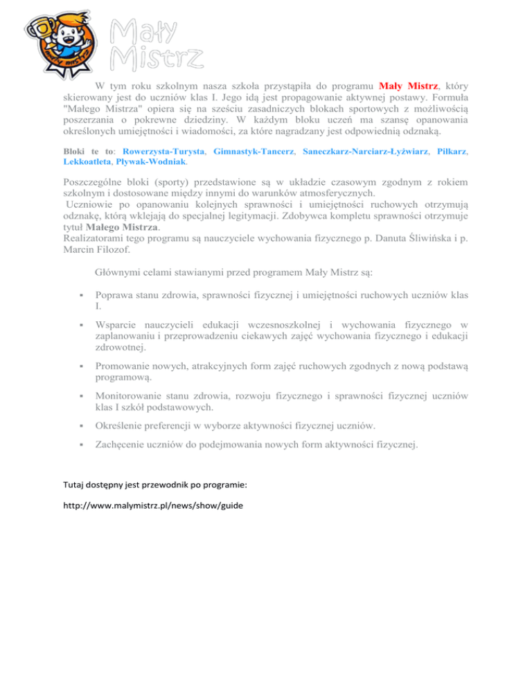 W tym roku szkolnym nasza szkoła przystąpiła do programu Mały Mistrz, który skierowany jest do uczniów klas I. Jego idą jest propagowanie aktywnej postawy. Formuła "Małego Mistrza" opiera się na sześciu zasadniczych blokach sportowych z możliwością poszerzania o pokrewne dziedziny. W każdym bloku uczeń ma szansę opanowania określonych umiejętności i wiadomości, za które nagradzany jest odpowiednią odznaką. Bloki te to: Rowerzysta-Turysta, Gimnastyk-Tancerz, Saneczkarz-Narciarz-Łyżwiarz, Piłkarz, Lekkoatleta, Pływak-Wodniak. Poszczególne bloki (sporty) przedstawione są w układzie czasowym zgodnym z rokiem szkolnym i dostosowane między innymi do warunków atmosferycznych. Uczniowie po opanowaniu kolejnych sprawności i umiejętności ruchowych otrzymują odznakę, którą wklejają do specjalnej legitymacji. Zdobywca kompletu sprawności otrzymuje tytuł Małego Mistrza. Realizatorami tego programu są nauczyciele wychowania fizycznego p. Danuta Śliwińska i p. Marcin Filozof. Głównymi celami stawianymi przed programem Mały Mistrz są: Poprawa stanu zdrowia, sprawności fizycznej i umiejętności ruchowych uczniów klas I. Wsparcie nauczycieli edukacji wczesnoszkolnej i wychowania fizycznego w zaplanowaniu i przeprowadzeniu ciekawych zajęć wychowania fizycznego i edukacji zdrowotnej. Promowanie nowych, atrakcyjnych form zajęć ruchowych zgodnych z nową podstawą programową. Monitorowanie stanu zdrowia, rozwoju fizycznego i sprawności fizycznej uczniów klas I szkół podstawowych. Określenie preferencji w wyborze aktywności fizycznej uczniów. Zachęcenie uczniów do podejmowania nowych form aktywności fizycznej. Tutaj dostępny jest przewodnik po programie: http://www.malymistrz.pl/news/show/guide