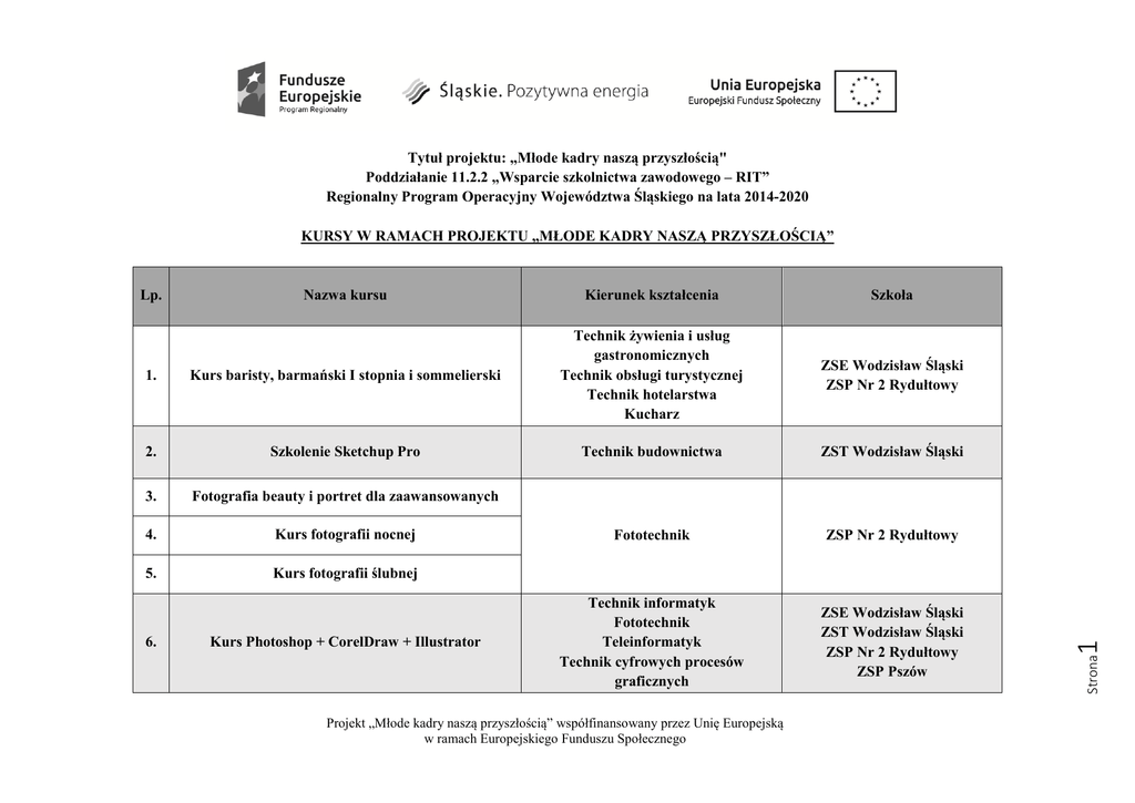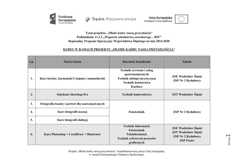 Tytuł projektu: „Młode kadry naszą przyszłością" Poddziałanie 11.2.2 „Wsparcie szkolnictwa zawodowego – RIT” Regionalny Program Operacyjny Województwa Śląskiego na lata 2014-2020 Kierunek kształcenia Szkoła 1. Kurs baristy, barmański I stopnia i sommelierski Technik żywienia i usług gastronomicznych Technik obsługi turystycznej Technik hotelarstwa Kucharz ZSE Wodzisław Śląski ZSP Nr 2 Rydułtowy 2. Szkolenie Sketchup Pro Technik budownictwa ZST Wodzisław Śląski 3. Fotografia beauty i portret dla zaawansowanych 4. Kurs fotografii nocnej Fototechnik ZSP Nr 2 Rydułtowy 5. Kurs fotografii ślubnej Technik informatyk Fototechnik Teleinformatyk Technik cyfrowych procesów graficznych ZSE Wodzisław Śląski ZST Wodzisław Śląski ZSP Nr 2 Rydułtowy ZSP Pszów 6. Kurs Photoshop + CorelDraw + Illustrator Projekt „Młode kadry naszą przyszłością” współfinansowany przez Unię Europejską w ramach Europejskiego Funduszu Społecznego Strona Nazwa kursu Lp. 1 KURSY W RAMACH PROJEKTU „MŁODE KADRY NASZĄ PRZYSZŁOŚCIĄ” Nowoczesne techniki sprzedaży Technik handlowiec Sprzedawca ZSE Wodzisław Śląski ZSP Nr 2 Rydułtowy 8. Kurs CNNA Exploration CISCO Technik informatyk Technik teleinformatyk ZST Wodzisław Śląski 9. Strony www i animacja - Dreamweaver, Flash Technik informatyk Teleinformatyk Technik cyfrowych procesów graficznych Fototechnik ZSE Wodzisław Śląski ZST Wodzisław Śląski ZSP Nr 2 Rydułtowy ZSP Pszów 10. Kurs obsługi programów finansowo-księgowych Technik ekonomista ZSE Wodzisław Śląski 11. Doskonały Recepcjonista – szkolenie dla pracowników recepcji hotelowej Technik hotelarstwa Technik obsługi turystycznej ZSE Wodzisław Śląski 12. Kurs Solid Edge Technik mechanik Mechanik monter maszyn i urządzeń PCKZiU Wodzisław Śląski ZSZ Radlin 13. Kurs - Elementy zapewnienia jakości badań w laboratorium badawczym i ich wykorzystanie w walidacji/rewalidacji metod analitycznych. Technik analityk PCKZiU Wodzisław Śląski 14. F-gazy urządzenia stacjonarne - kat. I Technik chłodnictwa i klimatyzacji PCKZiU Wodzisław Śląski 15. Kurs - Analiza klasyczna i instrumentalna w ocenie jakości komponentów środowiska ze wskazaniem źródeł zanieczyszczeń Technik ochrony środowiska PCKZiU Wodzisław Śląski Projekt „Młode kadry naszą przyszłością” współfinansowany przez Unię Europejską w ramach Europejskiego Funduszu Społecznego Strona 2 7. Technik mechanik PCKZiU Wodzisław Śląski 17. Kurs - Zasady działania analizator spalin z dymomierzem. Technik pojazdów samochodowych Mechanik samochodowy ZSP Pszów 18. Układy elektryczne i elektroniczne. Monter mechatronik ZSZ Radlin 19. Kurs programowania, obsługi i konserwacji sterowników PLC Technik mechatronik PCKZiU Wodzisław Śląski 20. Specjalista ds. turystyki Technik obsługi turystycznej ZSE Wodzisław Śląski 21. Kurs operatora koparki jednonaczyniowej o pojemności naczynia do 0,8m3 Technik budownictwa ZST Wodzisław Śląski Technik budownictwa Technik urządzeń i systemów energetyki odnawialnej Technik górnictwa podziemnego Technik mechanik Technik elektryk Elektromechanik Technik chłodnictwa i klimatyzacji Ślusarz, elektryk, Mechanik, Monter maszyn i urządzeń, Mechanik pojazdów samochodowych, Monter mechatronik, Operator obrabiarek PCKZiU Wodzisław Śląski ZST Wodzisław Śląski ZSZ Radlin ZSP Pszów 22. 23. Kurs spawania stali niestopowych elektrodą topliwą w osłonie gazów aktywnych (MAG) Kurs spawania stali niestopowych elektrodami otulonymi Projekt „Młode kadry naszą przyszłością” współfinansowany przez Unię Europejską w ramach Europejskiego Funduszu Społecznego 3 Kurs ślusarsko - pomiarowy Strona 16. skrawających Technik pojazdów samochodowych Technik elektryk Technik elektronik Technik chłodnictwa i klimatyzacji Technik mechatronik Elektromechanik Elektryk ZST Wodzisław Śląski PCKZiU Wodzisław Śląski ZSP Pszów ZSZ Radlin 24. Kurs na uprawnienia elektryczne: Eksploatacja urządzeń oraz instalacji i sieci elektroenergetycznych o napięciu do 1 kV – zakres podstawowy 25. Kurs przedłużania i zagęszczania włosów Fryzjer ZSP Pszów 26. Szkolenie z zakresu fotowoltaiki (na instalatorów) Technik urządzeń i systemów energetyki odnawialnej Technik ochrony środowiska ZST Wodzisław Śląski PCKZiU Wodzisław Śląski 27. Szkolenie Zarządzanie i Obrót Paletami w Standardzie EPAL, UIC, EUR Technik logistyk ZSP Nr 2 Rydułtowy Kurs kelnerski I stopnia 29. Doradca dietetyczny (żywieniowy) ZSE Wodzisław Śląski ZSP Nr 2 Rydułtowy ZSE Wodzisław Śląski ZSP Nr 2 Rydułtowy WAŻNE INFORMACJE: Projekt „Młode kadry naszą przyszłością” współfinansowany przez Unię Europejską w ramach Europejskiego Funduszu Społecznego Strona 4 28. Technik żywienia i usług gastronomicznych Kucharz Technik hotelarstwa Technik żywienia i usług gastronomicznych Kucharz Projekt będzie trwał w latach szkolnych: 2016/2017, 2017/2018, 2018/2019. Rekrutacja do projektu: od 22.09.2016 r. do 07.10.2016 r. Dokumenty należy składać w sekretariacie szkoły. W ramach Projektu uczeń ma obowiązek uczestniczyć 3 formach wsparcia: Doradztwo edukacyjno – zawodowe lub Doradztwo edukacyjno – zawodowe Kurs/kurs certyfikowany Kurs/kurs certyfikowany Kurs/kurs certyfikowany Płatna praktyka/staż zawodowy Strona W razie pytań dotyczycących kursów prosimy o kontakt z koordynatorem projektu pod nr tel. 32 453 99 67 lub adresem e-mail: [email protected] 5 Należy pamiętać, że każdy Uczestnik Projektu będzie brał udział w doradztwie edukacyjno – zawodowym, a połowa uczniów z projektu będzie mogła wziąć udział w płatnej praktyce/stażu zawodowym i kursie, a druga połowa będzie mogła wziąć udział w dwóch kursach. Projekt „Młode kadry naszą przyszłością” współfinansowany przez Unię Europejską w ramach Europejskiego Funduszu Społecznego