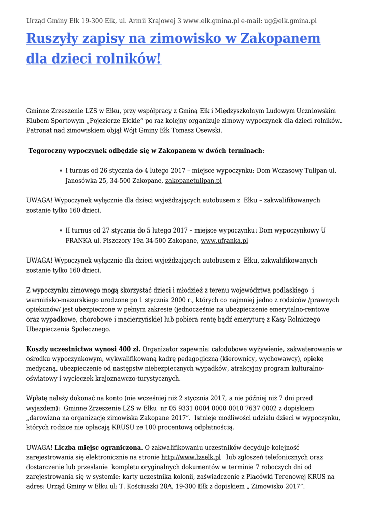 Urząd Gminy Ełk 19-300 Ełk, ul. Armii Krajowej 3 www.elk.gmina.pl e-mail: [email protected] Ruszyły zapisy na zimowisko w Zakopanem dla dzieci rolników! Gminne Zrzeszenie LZS w Ełku, przy współpracy z Gminą Ełk i Międzyszkolnym Ludowym Uczniowskim Klubem Sportowym „Pojezierze Ełckie” po raz kolejny organizuje zimowy wypoczynek dla dzieci rolników. Patronat nad zimowiskiem objął Wójt Gminy Ełk Tomasz Osewski. Tegoroczny wypoczynek odbędzie się w Zakopanem w dwóch terminach: I turnus od 26 stycznia do 4 lutego 2017 – miejsce wypoczynku: Dom Wczasowy Tulipan ul. Janosówka 25, 34-500 Zakopane, zakopanetulipan.pl UWAGA! Wypoczynek wyłącznie dla dzieci wyjeżdżających autobusem z Ełku – zakwalifikowanych zostanie tylko 160 dzieci. II turnus od 27 stycznia do 5 lutego 2017 – miejsce wypoczynku: Dom wypoczynkowy U FRANKA ul. Piszczory 19a 34-500 Zakopane, www.ufranka.pl UWAGA! Wypoczynek wyłącznie dla dzieci wyjeżdżających autobusem z Ełku, zakwalifikowanych zostanie tylko 160 dzieci. Z wypoczynku zimowego mogą skorzystać dzieci i młodzież z terenu województwa podlaskiego i warmińsko-mazurskiego urodzone po 1 stycznia 2000 r., których co najmniej jedno z rodziców /prawnych opiekunów/ jest ubezpieczone w pełnym zakresie (jednocześnie na ubezpieczenie emerytalno-rentowe oraz wypadkowe, chorobowe i macierzyńskie) lub pobiera rentę bądź emeryturę z Kasy Rolniczego Ubezpieczenia Społecznego. Koszty uczestnictwa wynosi 400 zł. Organizator zapewnia: całodobowe wyżywienie, zakwaterowanie w ośrodku wypoczynkowym, wykwalifikowaną kadrę pedagogiczną (kierownicy, wychowawcy), opiekę medyczną, ubezpieczenie od następstw niebezpiecznych wypadków, atrakcyjny program kulturalnooświatowy i wycieczek krajoznawczo-turystycznych. Wpłatę należy dokonać na konto (nie wcześniej niż 2 stycznia 2017, a nie później niż 7 dni przed wyjazdem): Gminne Zrzeszenie LZS w Ełku nr 05 9331 0004 0000 0010 7637 0002 z dopiskiem „darowizna na organizację zimowiska Zakopane 2017”. Istnieje możliwości udziału dzieci w wypoczynku, których rodzice nie opłacają KRUSU ze 100 procentową odpłatnością. UWAGA! Liczba miejsc ograniczona. O zakwalifikowaniu uczestników decyduje kolejność zarejestrowania się elektronicznie na stronie http://www.lzselk.pl lub zgłoszeń telefonicznych oraz dostarczenie lub przesłanie kompletu oryginalnych dokumentów w terminie 7 roboczych dni od zarejestrowania się w systemie: karty uczestnika kolonii, zaświadczenie z Placówki Terenowej KRUS na adres: Urząd Gminy w Ełku ul: T. Kościuszki 28A, 19-300 Ełk z dopiskiem „ Zimowisko 2017”. Urząd Gminy Ełk 19-300 Ełk, ul. Armii Krajowej 3 www.elk.gmina.pl e-mail: [email protected] W razie pytań i wątpliwości proszę kontaktować się z Tomaszem Bartnikiem, przewodniczącym Gminnego Zrzeszenia LZS w Ełku, koordynatorem organizacji zimowego wypoczynku – nr tel. 508 863 211, 516 106 667, 87 619 45 50, 87 619 45 34. Pobierz kartę zgłoszeniową – kliknij tutaj