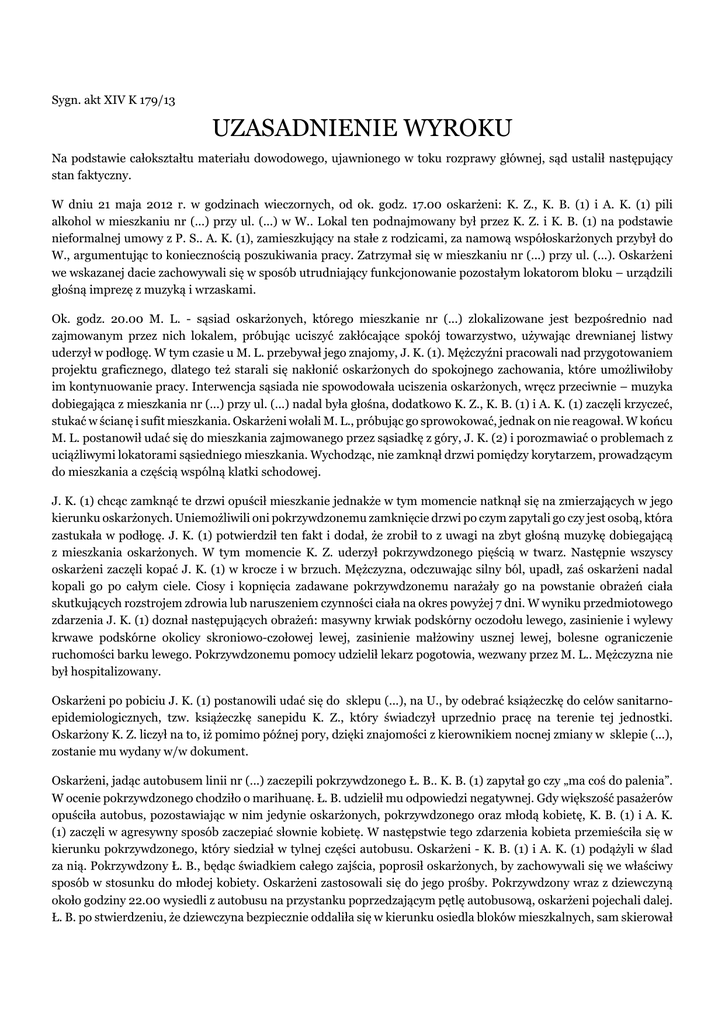 Sygn. akt XIV K 179/13 UZASADNIENIE WYROKU Na podstawie całokształtu materiału dowodowego, ujawnionego w toku rozprawy głównej, sąd ustalił następujący stan faktyczny. W dniu 21 maja 2012 r. w godzinach wieczornych, od ok. godz. 17.00 oskarżeni: K. Z., K. B. (1) i A. K. (1) pili alkohol w mieszkaniu nr (...) przy ul. (...) w W.. Lokal ten podnajmowany był przez K. Z. i K. B. (1) na podstawie nieformalnej umowy z P. S.. A. K. (1), zamieszkujący na stałe z rodzicami, za namową współoskarżonych przybył do W., argumentując to koniecznością poszukiwania pracy. Zatrzymał się w mieszkaniu nr (...) przy ul. (...). Oskarżeni we wskazanej dacie zachowywali się w sposób utrudniający funkcjonowanie pozostałym lokatorom bloku – urządzili głośną imprezę z muzyką i wrzaskami. Ok. godz. 20.00 M. L. - sąsiad oskarżonych, którego mieszkanie nr (...) zlokalizowane jest bezpośrednio nad zajmowanym przez nich lokalem, próbując uciszyć zakłócające spokój towarzystwo, używając drewnianej listwy uderzył w podłogę. W tym czasie u M. L. przebywał jego znajomy, J. K. (1). Mężczyźni pracowali nad przygotowaniem projektu graficznego, dlatego też starali się nakłonić oskarżonych do spokojnego zachowania, które umożliwiłoby im kontynuowanie pracy. Interwencja sąsiada nie spowodowała uciszenia oskarżonych, wręcz przeciwnie – muzyka dobiegająca z mieszkania nr (...) przy ul. (...) nadal była głośna, dodatkowo K. Z., K. B. (1) i A. K. (1) zaczęli krzyczeć, stukać w ścianę i sufit mieszkania. Oskarżeni wołali M. L., próbując go sprowokować, jednak on nie reagował. W końcu M. L. postanowił udać się do mieszkania zajmowanego przez sąsiadkę z góry, J. K. (2) i porozmawiać o problemach z uciążliwymi lokatorami sąsiedniego mieszkania. Wychodząc, nie zamknął drzwi pomiędzy korytarzem, prowadzącym do mieszkania a częścią wspólną klatki schodowej. J. K. (1) chcąc zamknąć te drzwi opuścił mieszkanie jednakże w tym momencie natknął się na zmierzających w jego kierunku oskarżonych. Uniemożliwili oni pokrzywdzonemu zamknięcie drzwi po czym zapytali go czy jest osobą, która zastukała w podłogę. J. K. (1) potwierdził ten fakt i dodał, że zrobił to z uwagi na zbyt głośną muzykę dobiegającą z mieszkania oskarżonych. W tym momencie K. Z. uderzył pokrzywdzonego pięścią w twarz. Następnie wszyscy oskarżeni zaczęli kopać J. K. (1) w krocze i w brzuch. Mężczyzna, odczuwając silny ból, upadł, zaś oskarżeni nadal kopali go po całym ciele. Ciosy i kopnięcia zadawane pokrzywdzonemu narażały go na powstanie obrażeń ciała skutkujących rozstrojem zdrowia lub naruszeniem czynności ciała na okres powyżej 7 dni. W wyniku przedmiotowego zdarzenia J. K. (1) doznał następujących obrażeń: masywny krwiak podskórny oczodołu lewego, zasinienie i wylewy krwawe podskórne okolicy skroniowo-czołowej lewej, zasinienie małżowiny usznej lewej, bolesne ograniczenie ruchomości barku lewego. Pokrzywdzonemu pomocy udzielił lekarz pogotowia, wezwany przez M. L.. Mężczyzna nie był hospitalizowany. Oskarżeni po pobiciu J. K. (1) postanowili udać się do sklepu (...), na U., by odebrać książeczkę do celów sanitarnoepidemiologicznych, tzw. książeczkę sanepidu K. Z., który świadczył uprzednio pracę na terenie tej jednostki. Oskarżony K. Z. liczył na to, iż pomimo późnej pory, dzięki znajomości z kierownikiem nocnej zmiany w sklepie (...), zostanie mu wydany w/w dokument. Oskarżeni, jadąc autobusem linii nr (...) zaczepili pokrzywdzonego Ł. B.. K. B. (1) zapytał go czy „ma coś do palenia”. W ocenie pokrzywdzonego chodziło o marihuanę. Ł. B. udzielił mu odpowiedzi negatywnej. Gdy większość pasażerów opuściła autobus, pozostawiając w nim jedynie oskarżonych, pokrzywdzonego oraz młodą kobietę, K. B. (1) i A. K. (1) zaczęli w agresywny sposób zaczepiać słownie kobietę. W następstwie tego zdarzenia kobieta przemieściła się w kierunku pokrzywdzonego, który siedział w tylnej części autobusu. Oskarżeni - K. B. (1) i A. K. (1) podążyli w ślad za nią. Pokrzywdzony Ł. B., będąc świadkiem całego zajścia, poprosił oskarżonych, by zachowywali się we właściwy sposób w stosunku do młodej kobiety. Oskarżeni zastosowali się do jego prośby. Pokrzywdzony wraz z dziewczyną około godziny 22.00 wysiedli z autobusu na przystanku poprzedzającym pętlę autobusową, oskarżeni pojechali dalej. Ł. B. po stwierdzeniu, że dziewczyna bezpiecznie oddaliła się w kierunku osiedla bloków mieszkalnych, sam skierował się do domu, zmierzając w stronę ul. (...), szedł przez parkingi. Pokrzywdzony po chwili usłyszał za swoimi plecami męskie głosy, odwrócił się i zauważył, w bliskiej odległości od siebie, nadbiegających oskarżonych. Następnie został zaatakowany przez nich. Oskarżeni zadawali mu ciosy po głowie na skutek czego stracił przytomność i upadł. W wyniku pobicia przez oskarżonych pokrzywdzony Ł. B. doznał urazu głowy z utrata przytomności, otarcia naskórka twarzy, wybicia dwóch przednich, górnych zębów, skaleczenia wargi dolnej i złamania kości nosowej. Powyższe skutkowało rozstrojem zdrowia i naruszeniem czynności ciała na czas powyżej 7 dni. Pomocy pokrzywdzonemu udzielili nieustalone kobiety oraz patrolujący teren pracownicy ochrony (...), tj. M. W. i P. D., zaalarmowani przez kobiety, które jako pierwsze zauważyły Ł. B.. Po zdarzeniu pokrzywdzony stwierdził utratę dwóch telefonów komórkowych N. (...), nr (...) oraz LG GW 300, nr (...) wraz z kartami SIM o numerach: 789 394 985 w sieci O. i 791 931 028 w sieci P., ich łączna wartość wynosiła około 270 złotych. Ł. B. nie posiada wiedzy co do okoliczności, w których utracił w/w rzeczy, w szczególności nie jest w stanie określić czy stanowiące jego własność telefony zostały zabrane przez oskarżonych. Następnie oskarżeni pr
