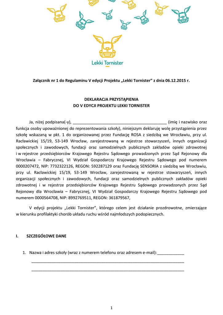 Załącznik nr 1 do Regulaminu V edycji Projektu „Lekki Tornister” z dnia 06.12.2015 r. DEKLARACJA PRZYSTĄPIENIA DO V EDYCJI PROJEKTU LEKKI TORNISTER Ja, niżej podpisana(-y), __________________________________________ (imię i nazwisko oraz funkcja osoby upoważnionej do reprezentowania szkoły), niniejszym deklaruję wolę przystąpienia przez szkołę wskazaną w pkt. 1 do organizowanej przez Fundację ROSA z siedzibą we Wrocławiu, przy ul. Racławickiej 15/19, 53-149 Wrocław, zarejestrowaną w rejestrze stowarzyszeń, innych organizacji społecznych i zawodowych, fundacji oraz samodzielnych publicznych zakładów opieki zdrowotnej i w rejestrze przedsiębiorców Krajowego Rejestru Sądowego prowadzonych przez Sąd Rejonowy dla Wrocławia – Fabrycznej, VI Wydział Gospodarczy Krajowego Rejestru Sądowego pod numerem 0000207472, NIP: 7732322126, REGON: 592287129 oraz Fundację SENSORIA z siedzibą we Wrocławiu, przy ul. Racławickiej 15/19, 53-149 Wrocław, zarejestrowaną w rejestrze stowarzyszeń, innych organizacji społecznych i zawodowych, fundacji oraz samodzielnych publicznych zakładów opieki zdrowotnej i w rejestrze przedsiębiorców Krajowego Rejestru Sądowego prowadzonych przez Sąd Rejonowy dla Wrocławia – Fabrycznej, VI Wydział Gospodarczy Krajowego Rejestru Sądowego pod numerem 0000564708, NIP: 8992769511, REGON: 361879567, V edycji projektu „Lekki Tornister”, którego celem jest działanie prozdrowotne, zmierzające w kierunku profilaktyki chorób układu ruchu wśród najmłodszych podopiecznych. I. SZCZEGÓŁOWE DANE 1. Nazwa i adres szkoły (wraz z numerem telefonu oraz adresem e-mail): ____________ ____________________________________________________________________ ____________________________________________________________________ 1 2. Dane personalne dyrektora szkoły: ________________________________________ ____________________________________________________________________ 3. Dane personalne koordynatora projektu (dyrektora lub innej upoważnionej osoby) wraz z numerem telefonu oraz adresem e-mail: ______________________________ ____________________________________________________________________ ____________________________________________________________________ 4. Nazwę miejscowości (oraz gminy, powiatu i województwa), w której znajduje się szkoła, wraz z podaniem szacunkowej liczby mieszkańców: _____________________ ____________________________________________________________________ 5. Liczbę klas (I – III): _____________________________________________________ ____________________________________________________________________ ____________________________________________________________________ 6. Liczbę uczniów w poszczególnych klasach wskazanych w pkt. 5: _________________ ____________________________________________________________________ ____________________________________________________________________ ____________________________________________________________________ ____________________________________________________________________ 7. Liczbę nauczycieli, którzy zostaną zaangażowani w Projekt: ____________________ ____________________________________________________________________ 2 II. OŚWIADCZENIA Jednocześnie wraz z wyrażeniem woli przystąpienia do projektu „Lekki Tornister” oświadczam, że znany mi jest Regulamin oraz Scenariusz projektu, w pełni akceptuję zasady uczestnictwa oraz obowiązki placówki uczestniczącej w projekcie, które zostały w nich wyrażone, w szczególności w zakresie przeprowadzenia kampanii, a ponadto zobowiązuję się do współpracy w zakresie zorganizowania na terenie szkoły Projektu, w szczególności spotkania edukacyjnego dla uczniów klas I-III. Oświadczam, że w pełni akceptuję formę zajęć przeprowadzonych w ramach Projektu, w szczególności formę zajęć dydaktycznych, obejmujących prelekcję edukacyjną wraz z prezentacją, turnieje oraz quiz edukacyjny, a także ważenie uczniów oraz ich plecaków, odpowiednio z zawartością oraz pustych. Podczas kampanii na terenie placówki rozdawane będą uczniom oraz ich rodzicom i opiekunom materiały dydaktyczne. Ponadto wyrażam zgodę na rozpowszechnianie przez Fundację „ROSA” zdjęć wykonanych w ramach prowadzonych zajęć edukacyjnych na potrzeby promocji programu (dalej jako „Zdjęcia”). W związku z powyższym deklaruję, że szkoła będzie posiadała całokształt autorskich praw majątkowych do Zdjęć i oświadczam, iż z chwilą przesłania Fundacji „ROSA” Sprawozdania wraz ze Zdjęciami zostanie przeniesiona nieodpłatnie na Fundację „ROSA” całość autorskich praw majątkowych do Zdjęć na następujących polach eksploatacji: a) utrwalania w każdej formie; b) zwielokrotniania każdą techniką, w szczególności drukarską, reprograficzną, zapisu magnetycznego oraz techniką cyfrową; c) obrotu oryginałem albo egzemplarzami, na których utwór utrwalono – wprowadzanie do obrotu, użyczenie lub najem oryginału lub egzemplarzy utworu; d) rozpowszechniania utworu w jakikolwiek inny sposób niż określony w lit. c, w szczególności poprzez publiczne wykonywanie, wystawianie, wyświetlanie, odtwarzanie, nadawanie, reemitowanie, a także publiczne udostępnianie utworu w taki sposób, aby każdy mógł mieć do niego dostęp w miejscu i w czasie przez siebie wybranym, w szczególności udostępnianie w sieci Internet na stronie internetowej Fundacji „ROSA”. Z chwilą przejścia na Fundację „ROSA” autorskich praw majątkowych do Zdjęć, przeniesione zostanie także prawo do zezwalania na wykonywanie zależnego prawa autorskiego do Zdjęć. Oświadczam 3 ponadto, że przeniesienie autorskich praw majątkowych do Zdjęć nie będzie naruszało żadnych praw osób trzecich. Zobowiązuję się również, że szkoła uzyska zgody osób uwidocznionych na Zdjęciach lub ich przedstawicieli ustawowych do rozpowszechniania ich wizerunku. W przypadku skierowani